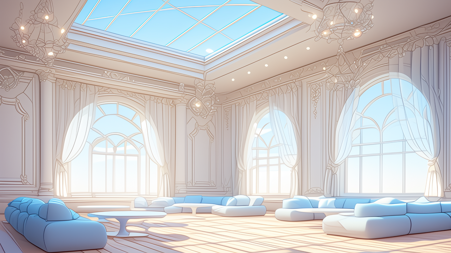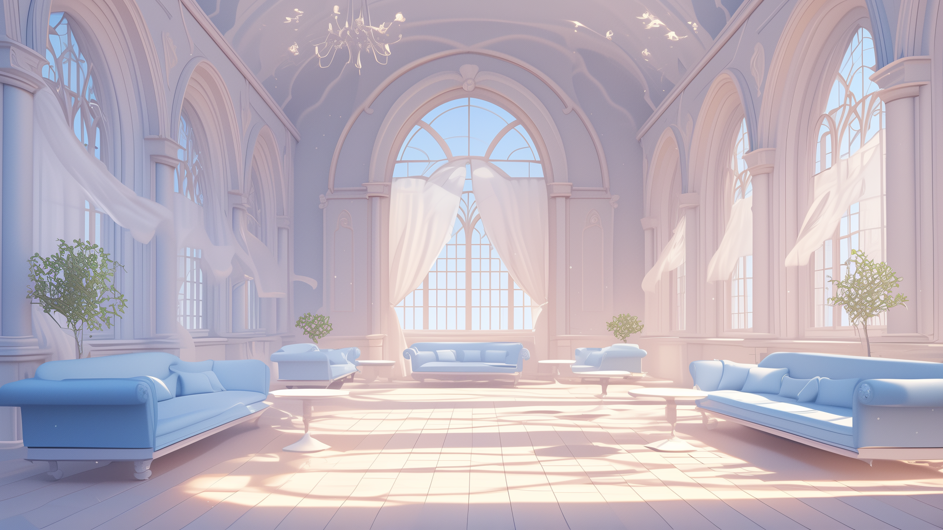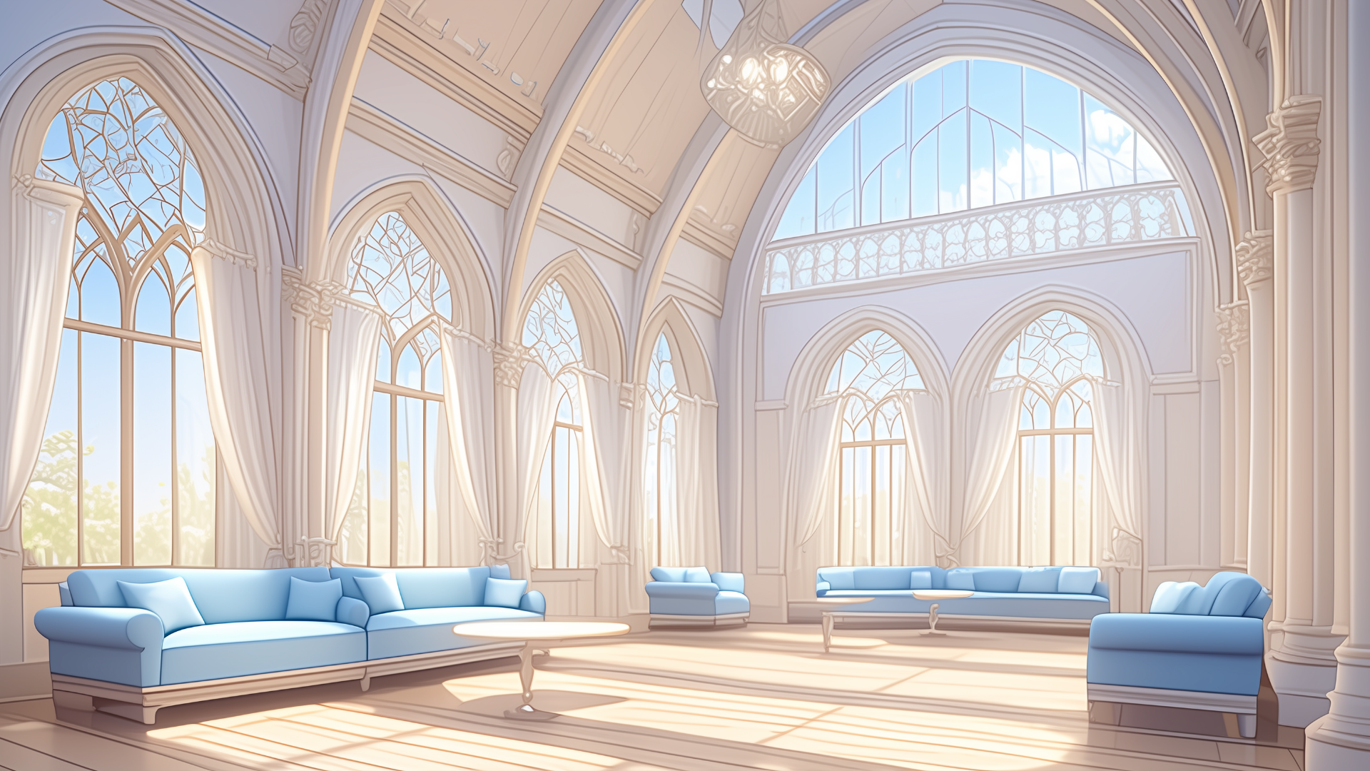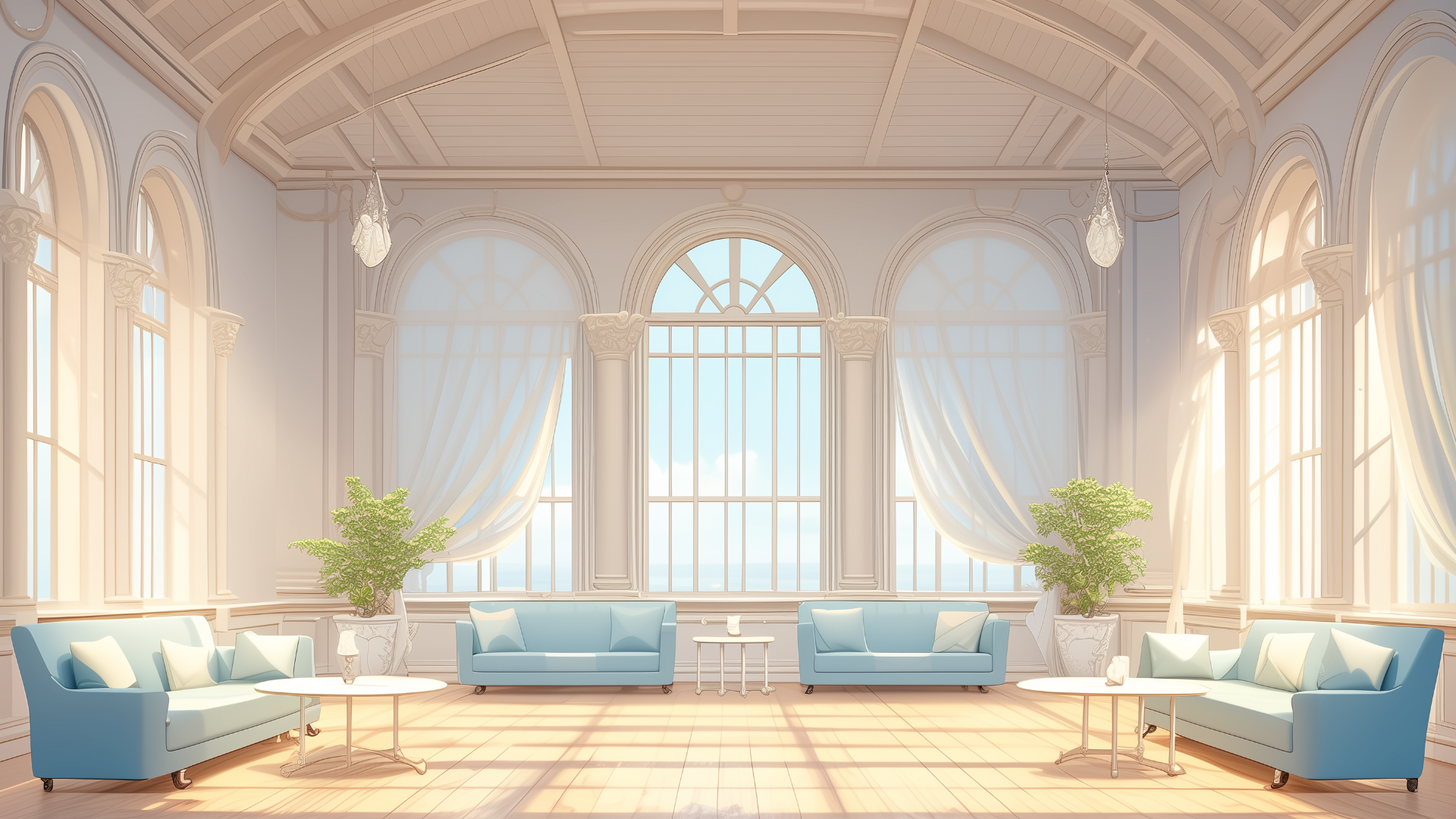 朝の陽射しがカーテン越しに注ぎ込むクラシカルなラウンジ。白を基調とした内装に淡いブルーのソファが並び、植物が彩りを添える。優雅で静かなシーンに合う、学園ドラマや異世界の寮生活を描くTRPG向け背景素材。