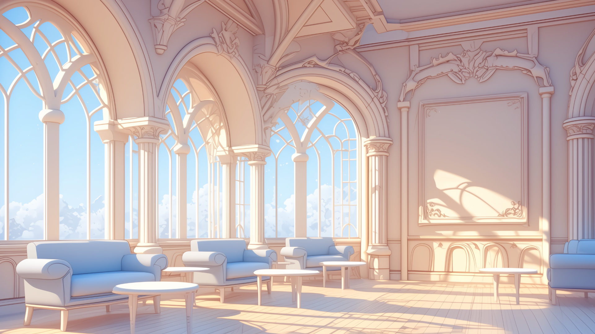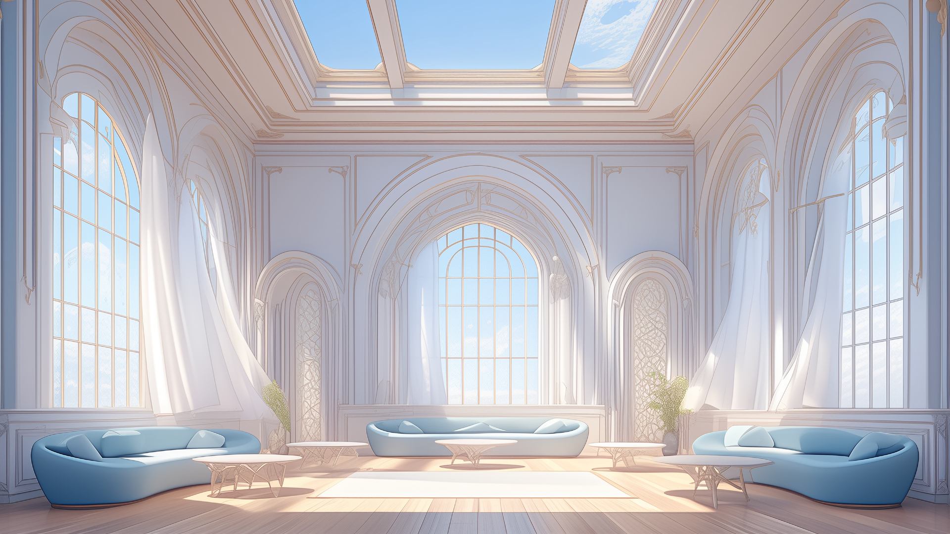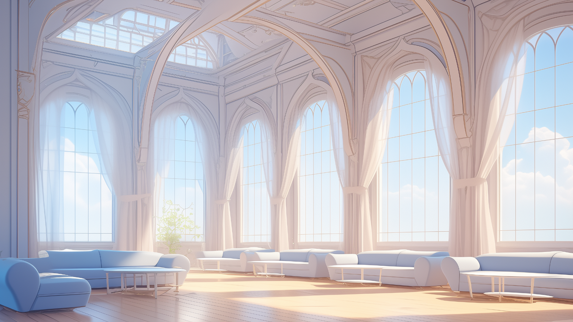 高い天井と連続したアーチ窓が印象的な、風通しの良い共用ラウンジ。繊細に揺れるカーテンと柔らかな自然光が、清涼感のある雰囲気を醸し出している。幻想的な寮生活や空中都市での交流を描くTRPGに最適なフリー背景素材。