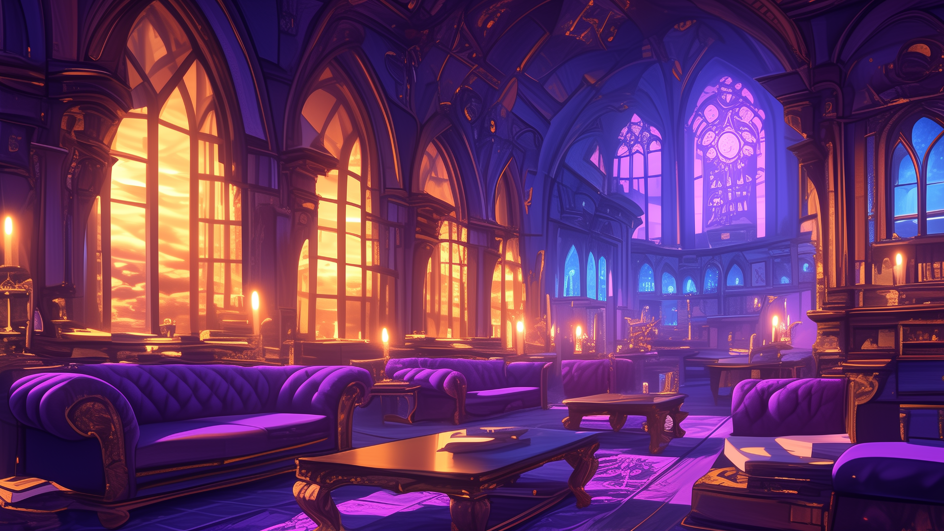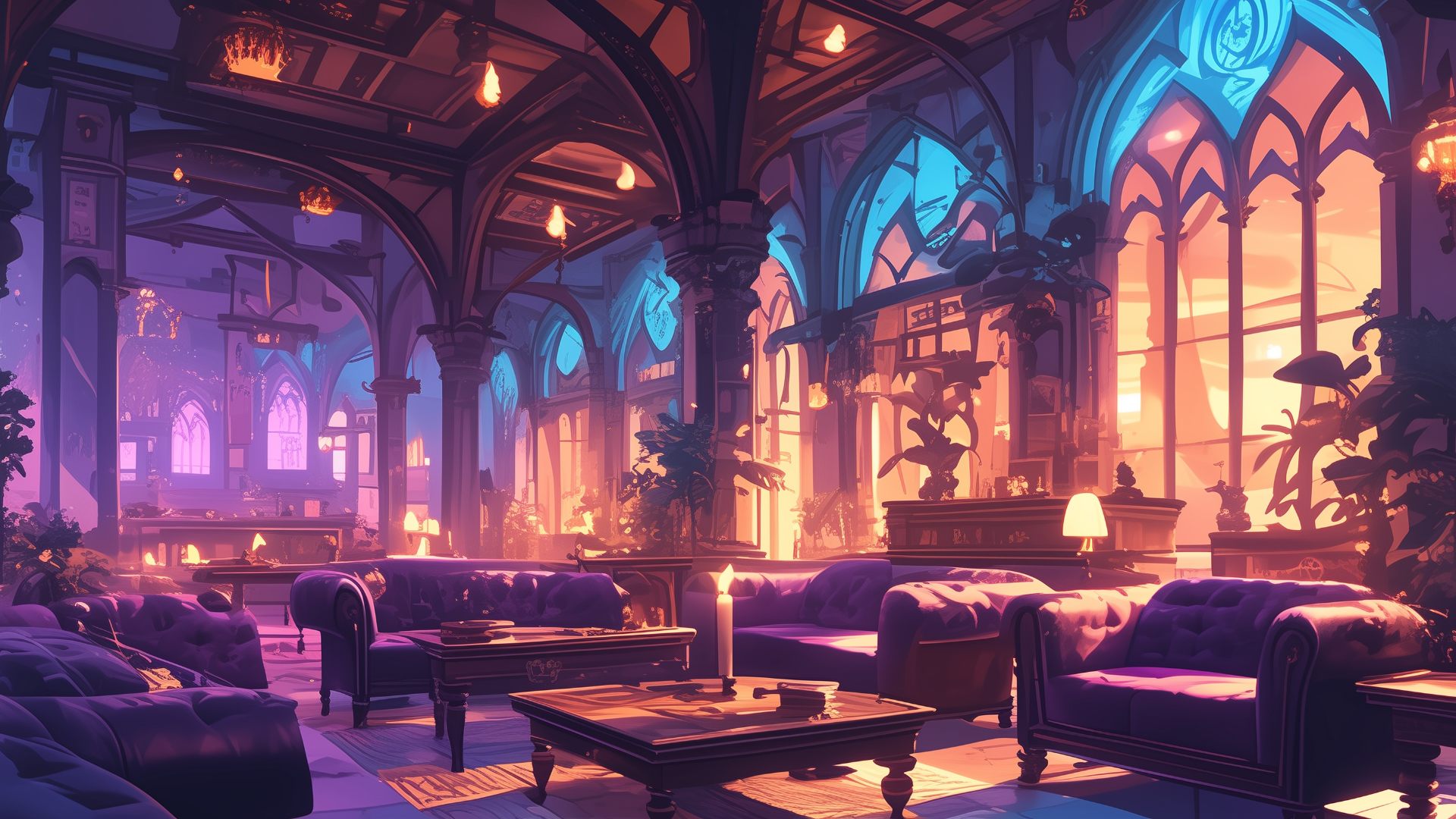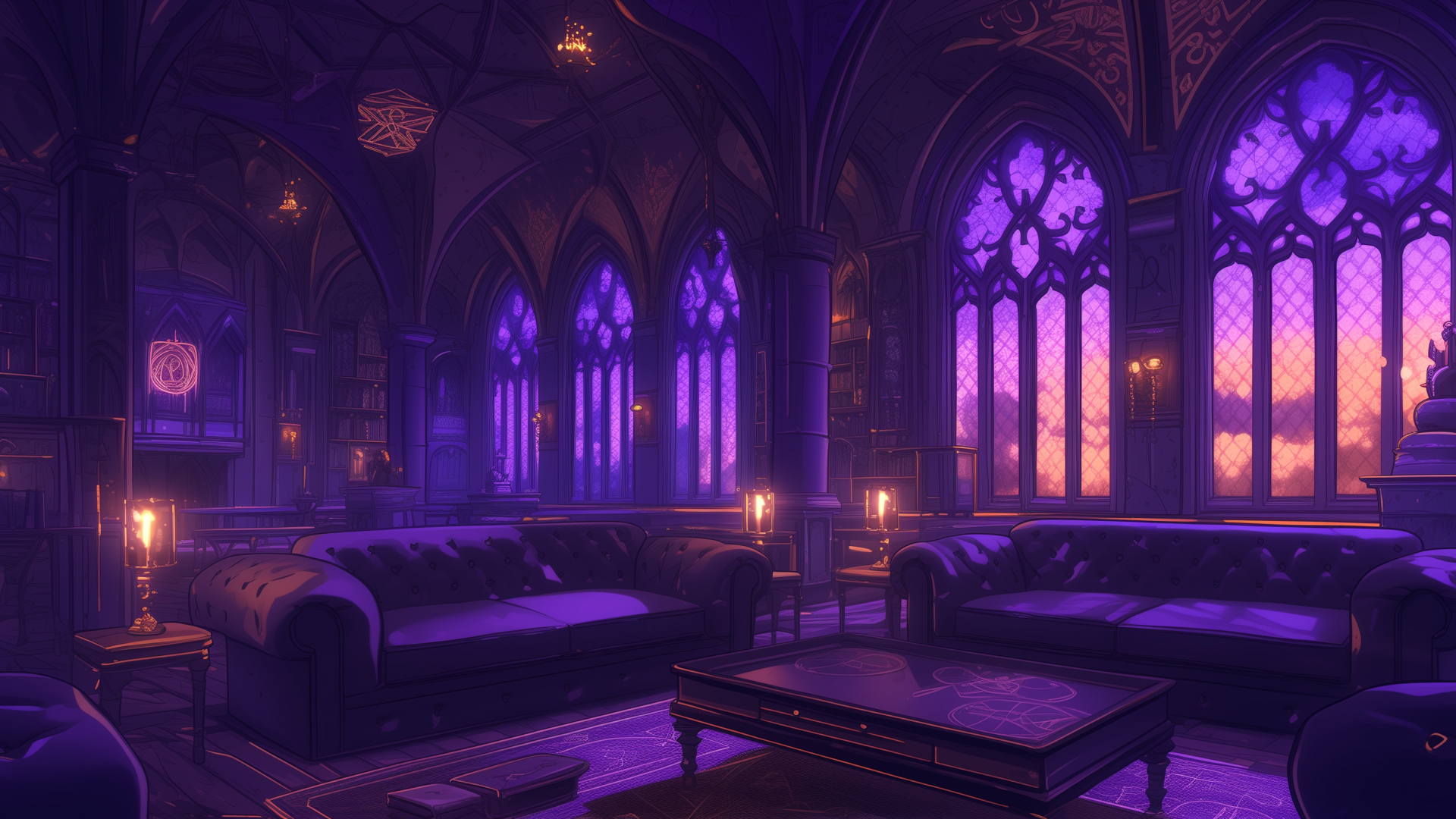magic-school, dormitory, dark-element, lounge, evening