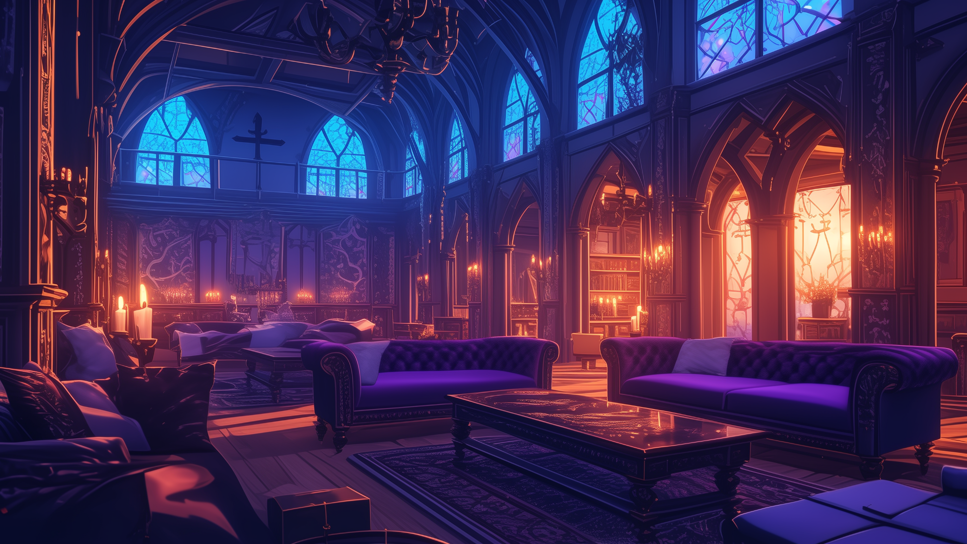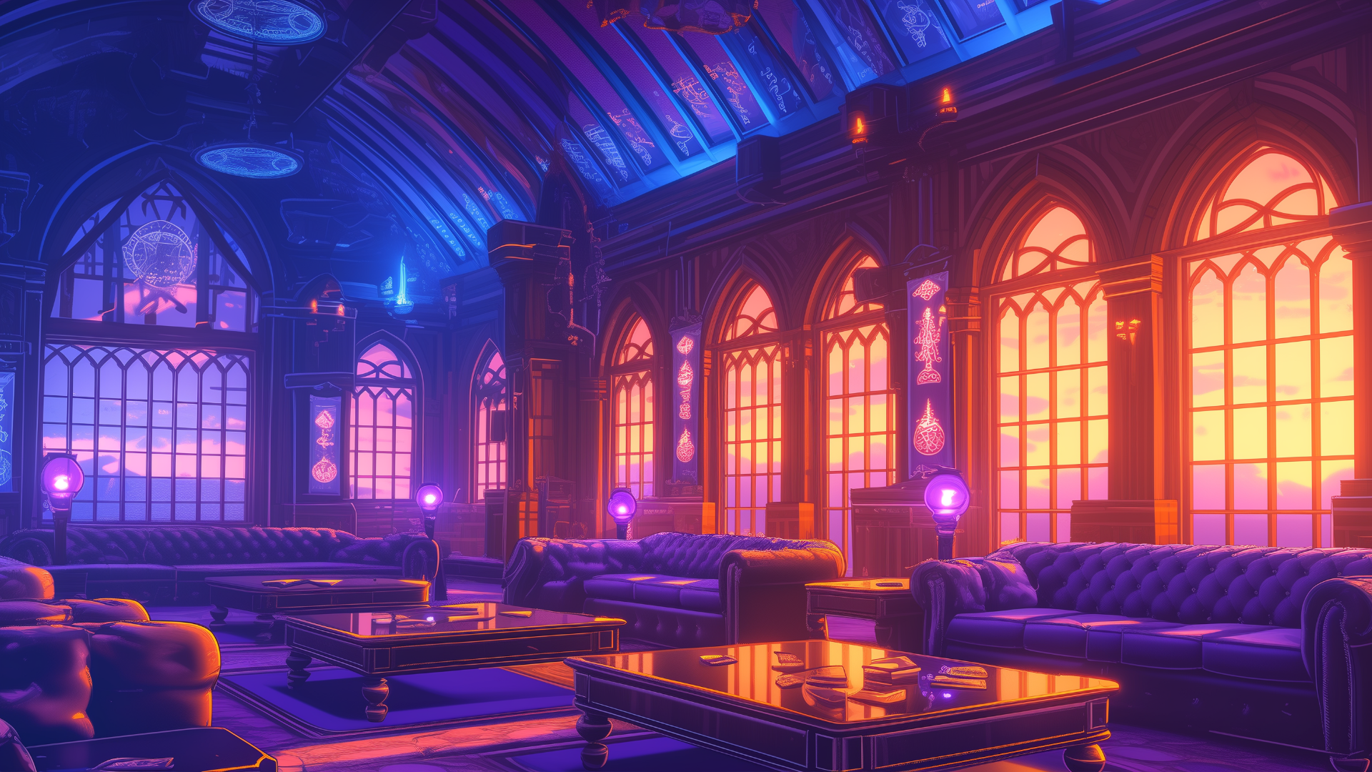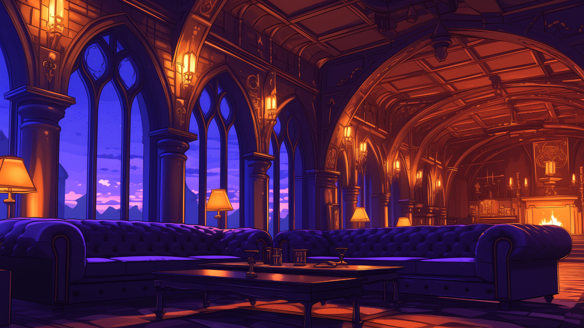 magic-school, dormitory, dark-element, lounge, evening