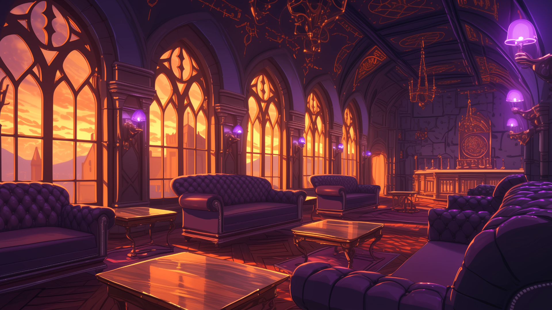 魔法学校の寮(闇属性・夕方)、共用ラウンジのフリー背景素材です。