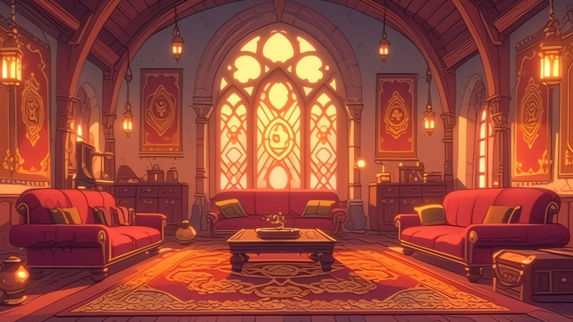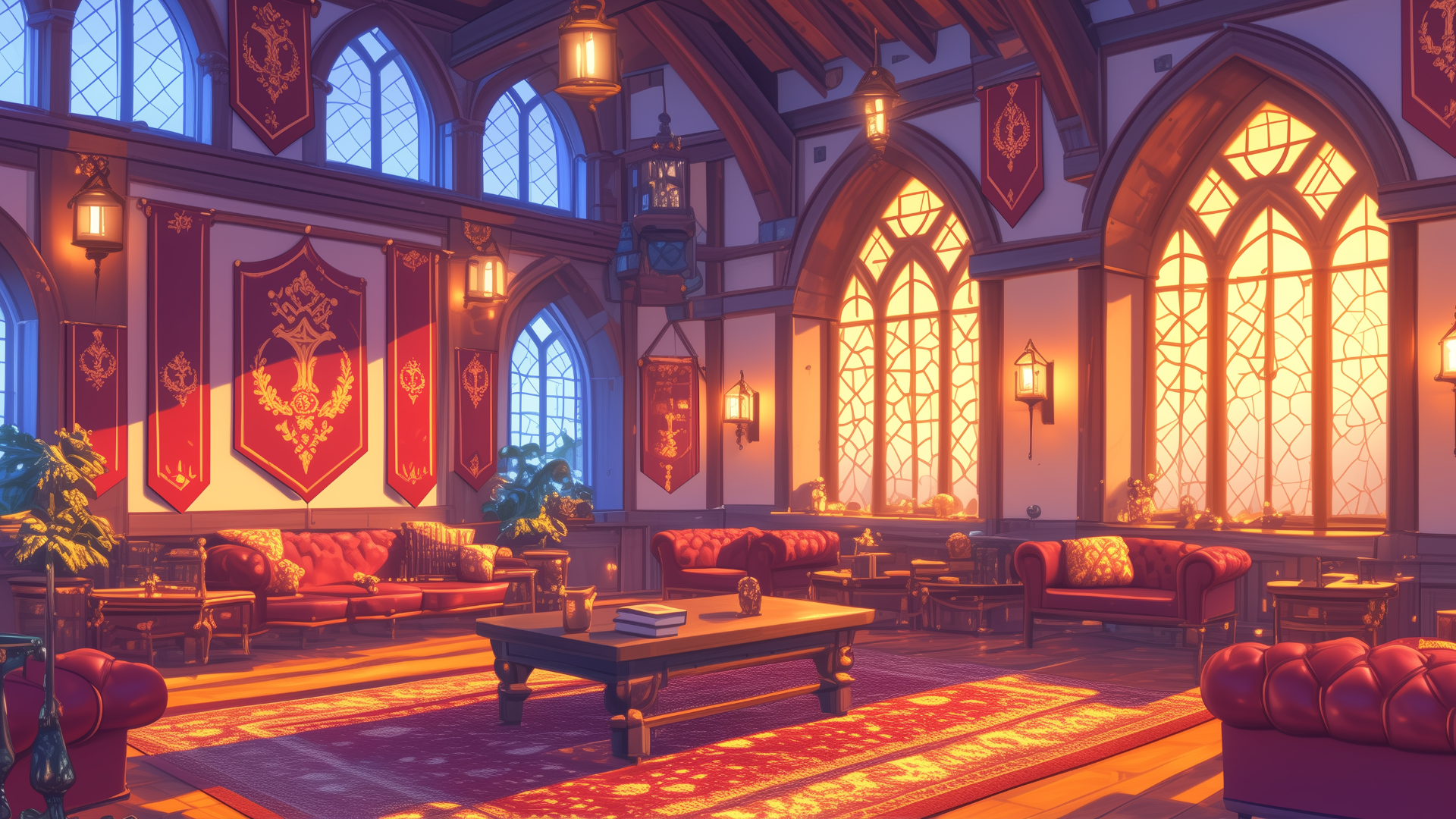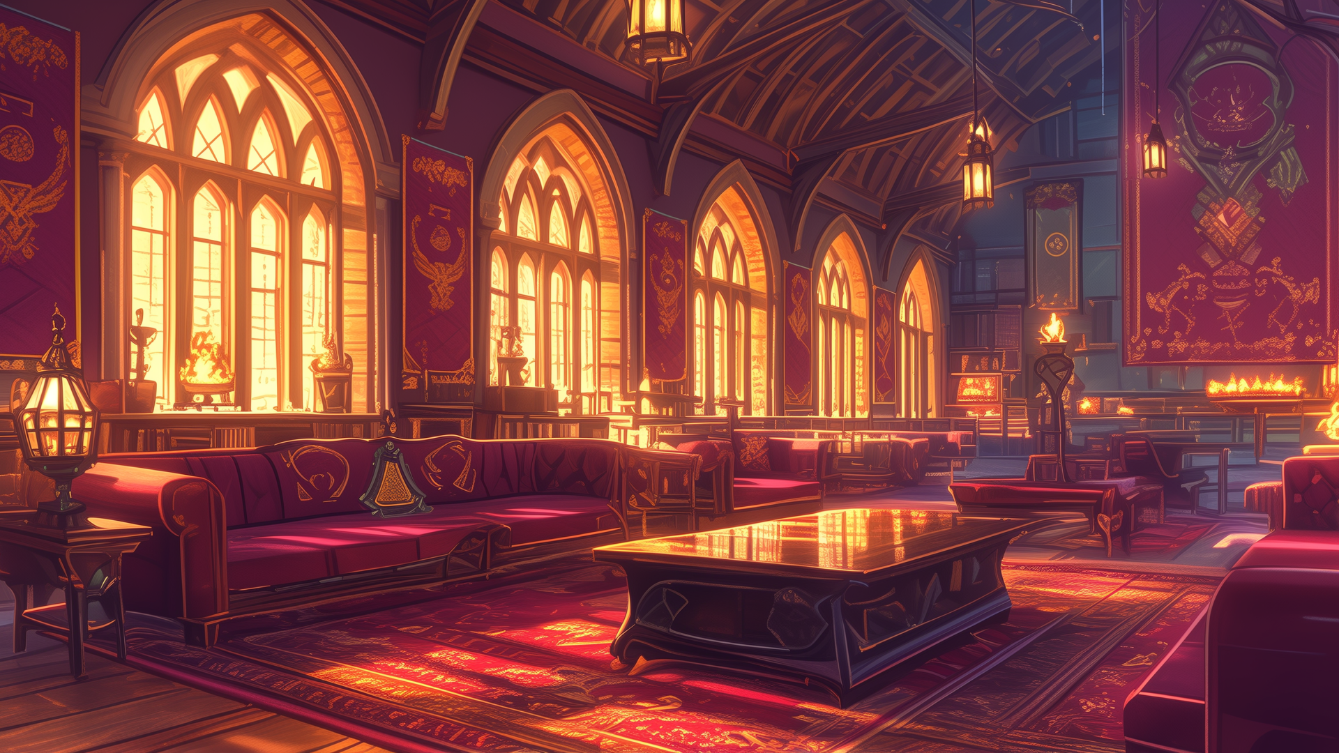 魔法学校の寮(炎属性・夕方)、共用ラウンジのフリー背景素材です。