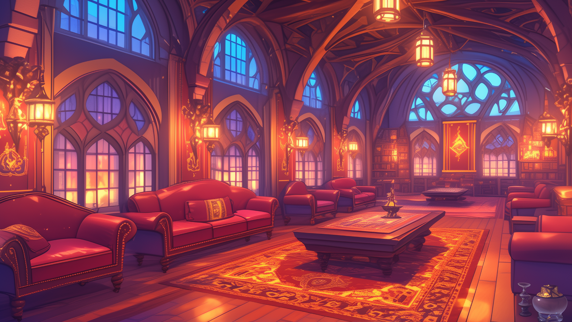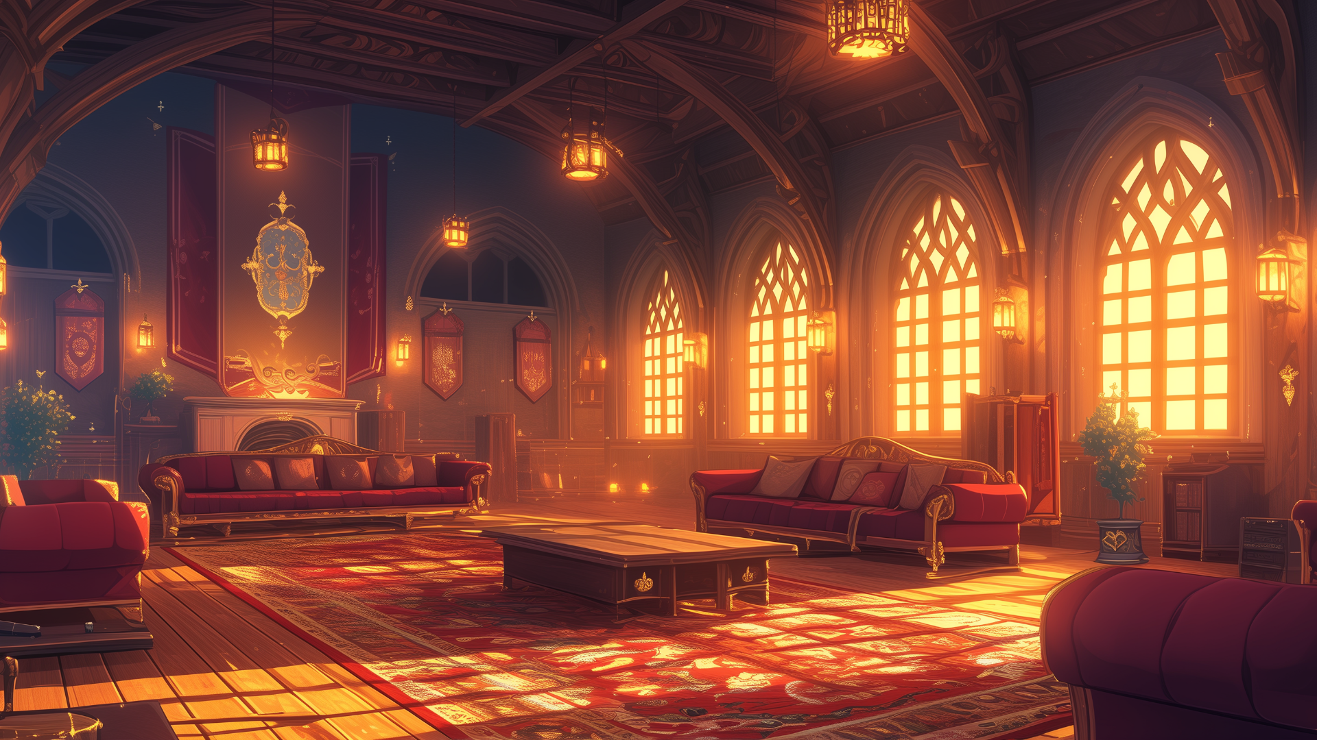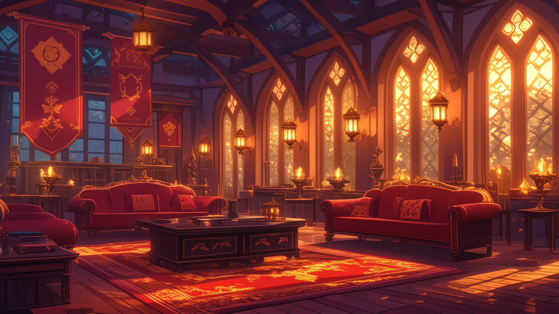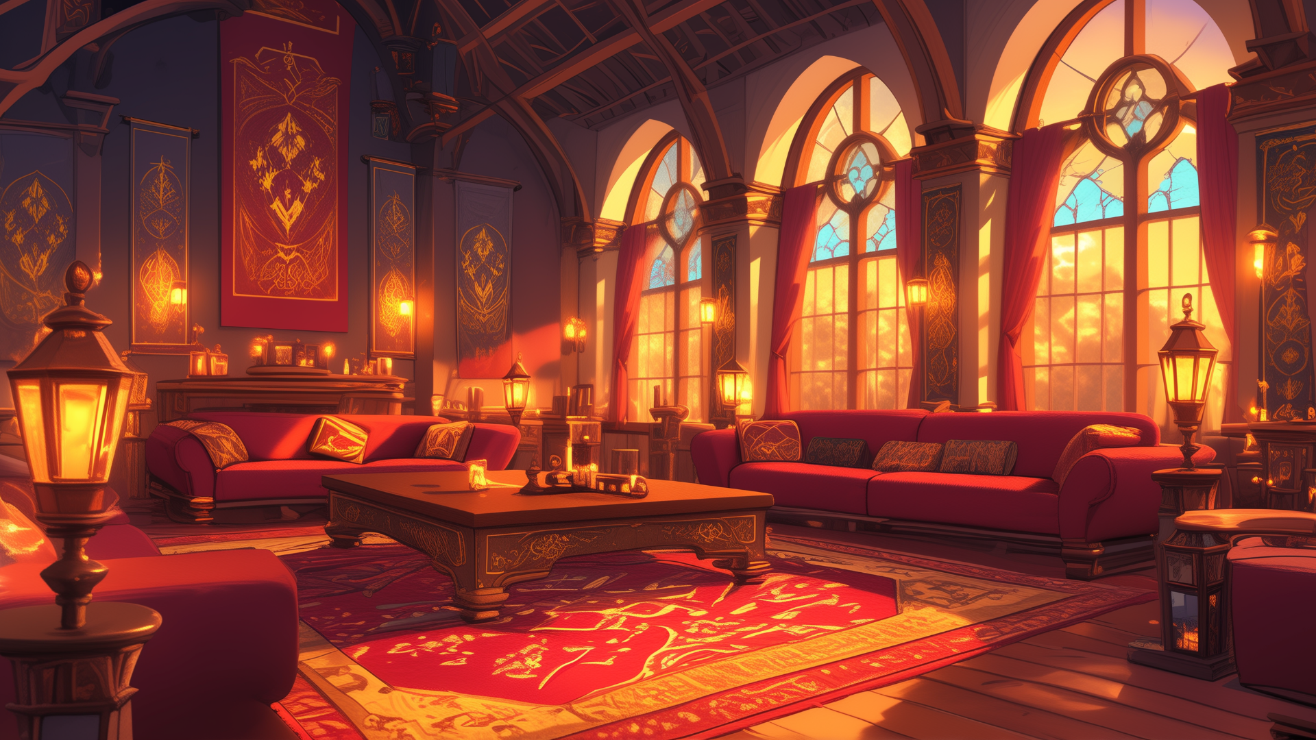 装飾の施されたランプが並ぶ荘厳なラウンジ。窓の外の夕暮れの光が、赤と金のインテリアを幻想的に浮かび上がらせている。魔導士の寮での夕食前の会話や、魔法をめぐる学園のシナリオに活用できるTRPG向けのフリー背景画像。