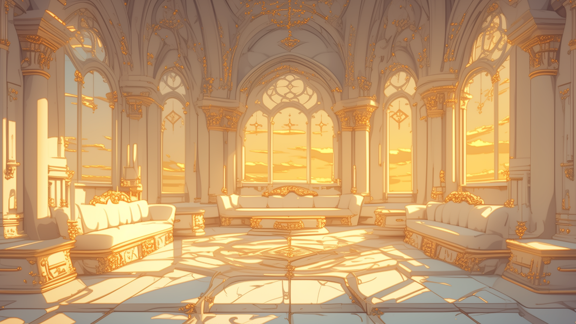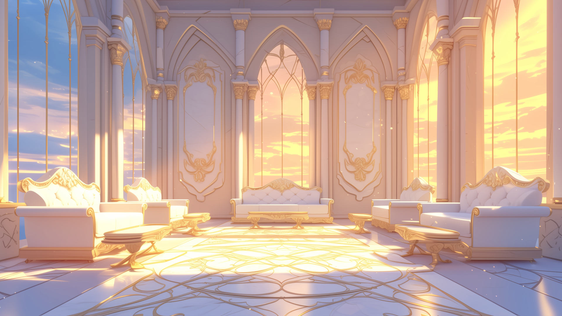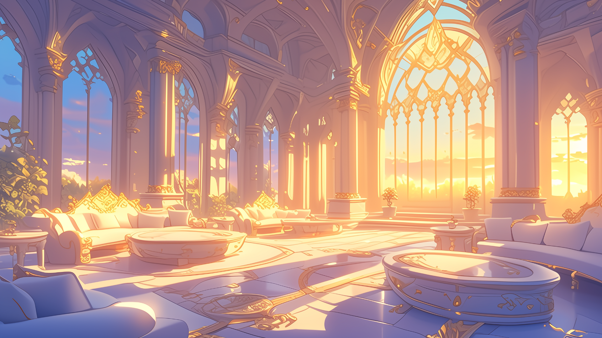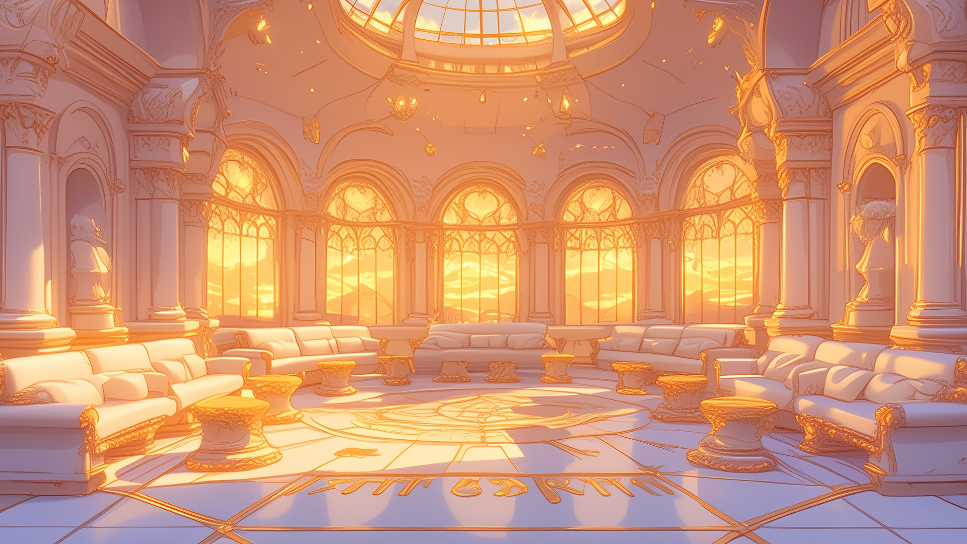 魔法学校の寮(光属性・夕方)、共用ラウンジのフリー背景素材です。