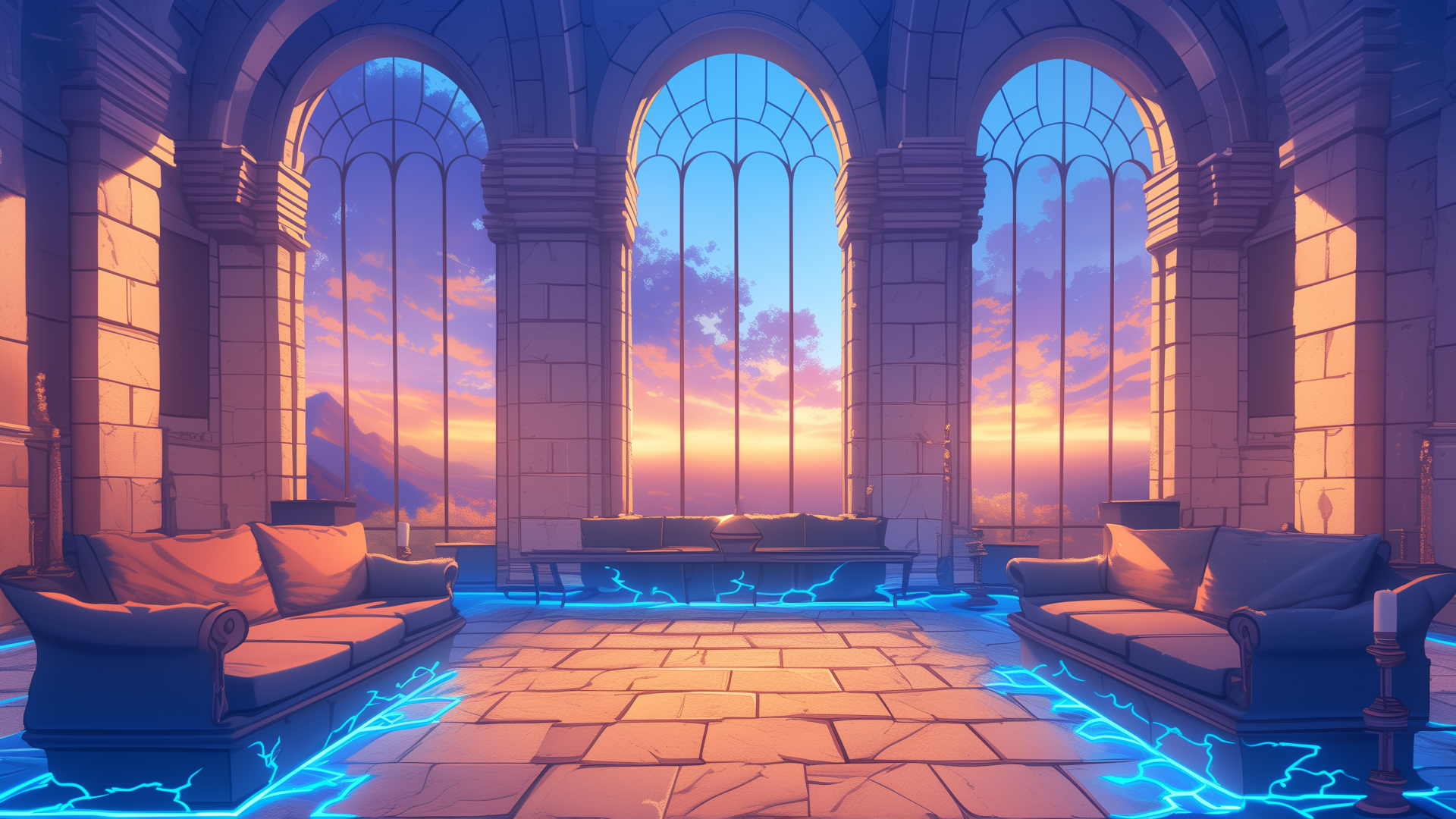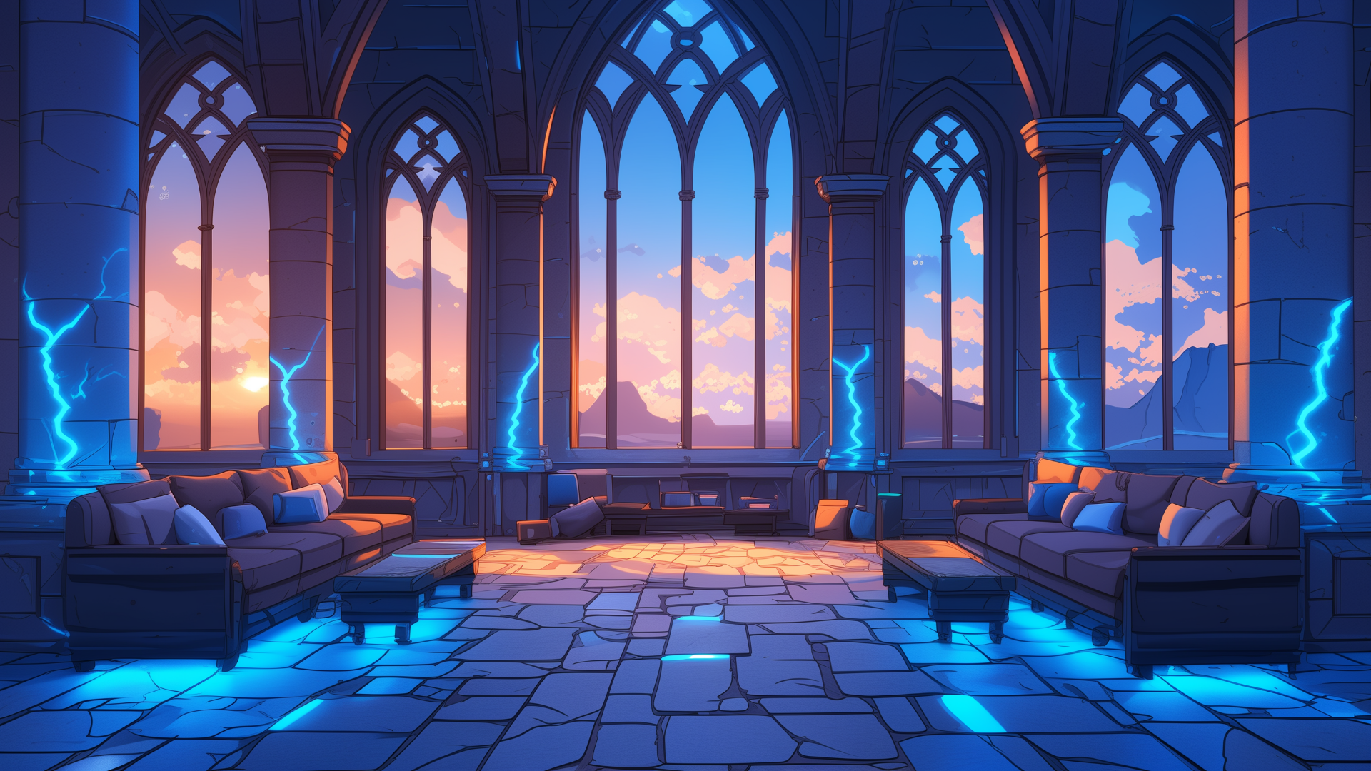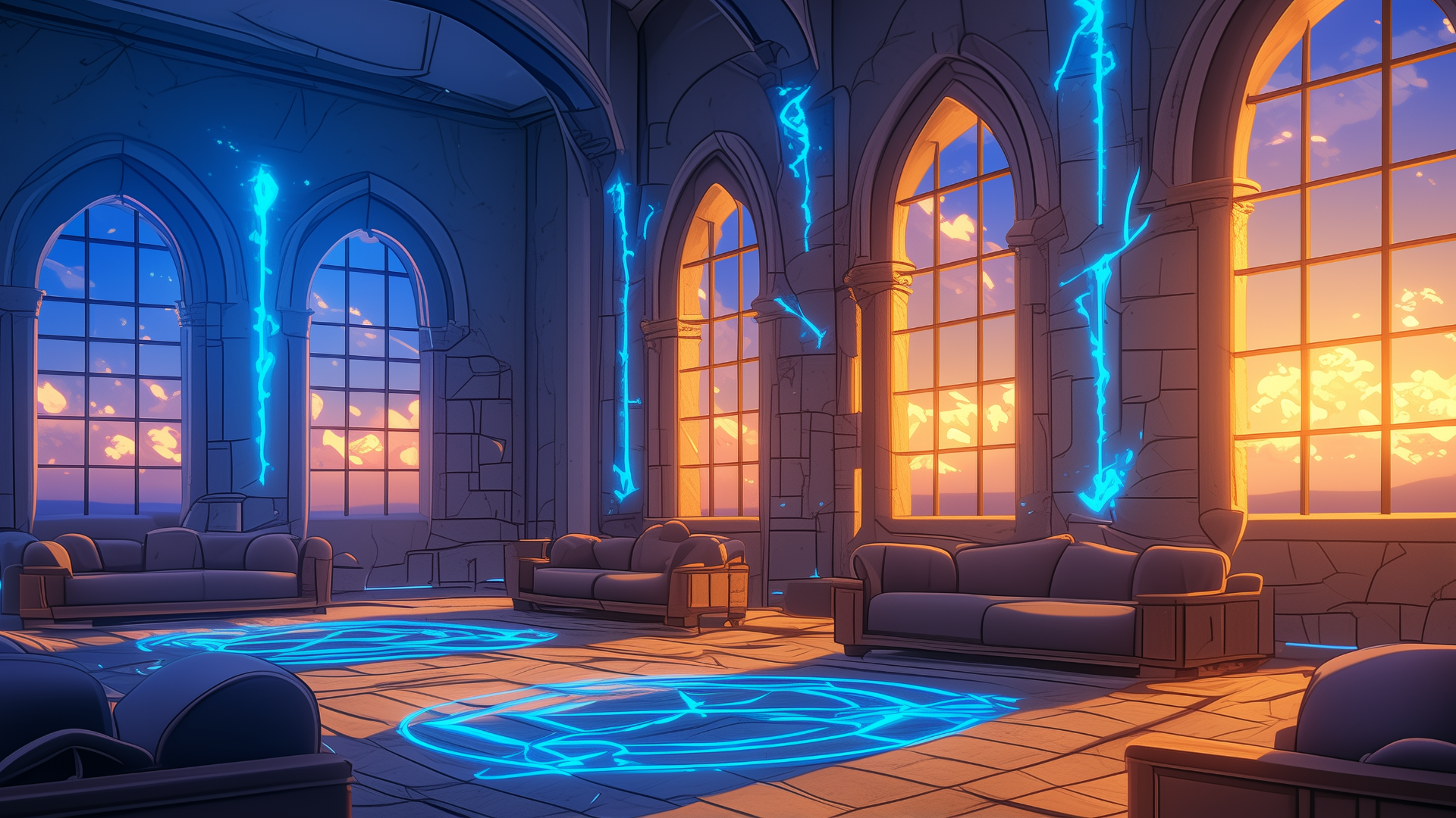 魔法学校の寮(雷属性・夕方)、共用ラウンジのフリー背景素材です。