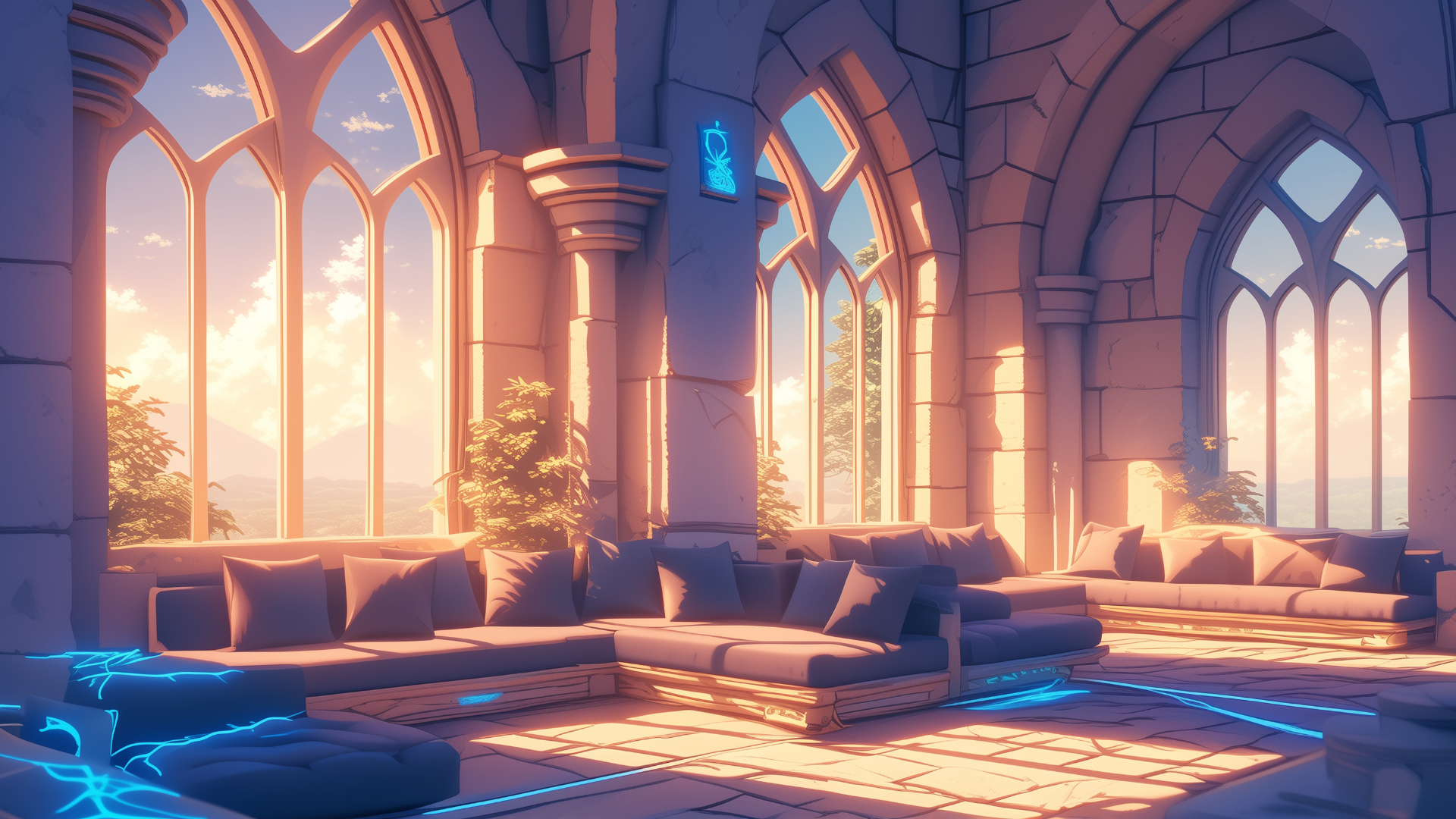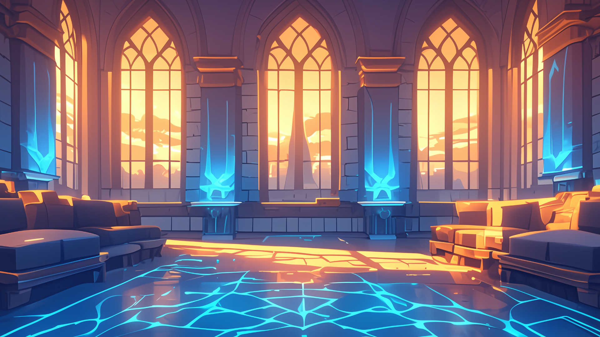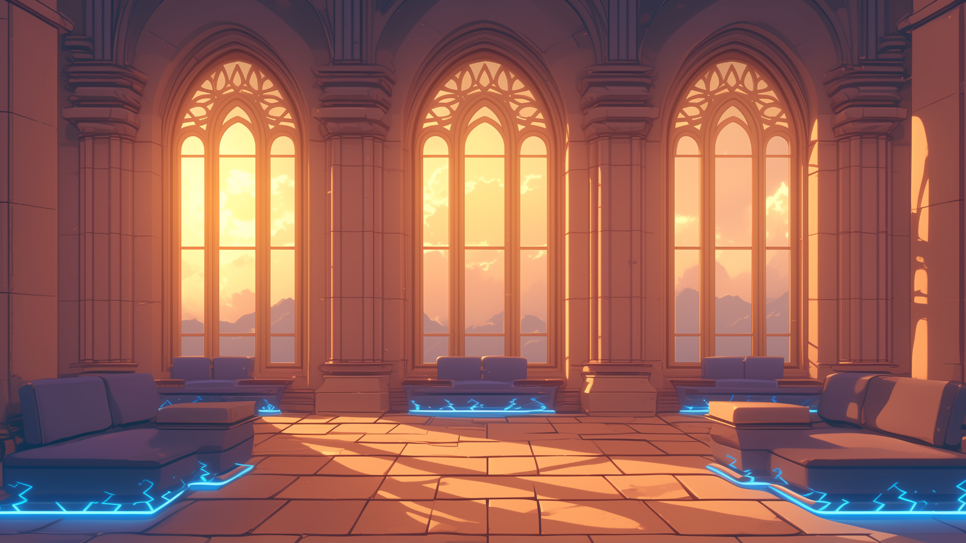 魔法学校の寮(雷属性・夕方)、共用ラウンジのフリー背景素材です。