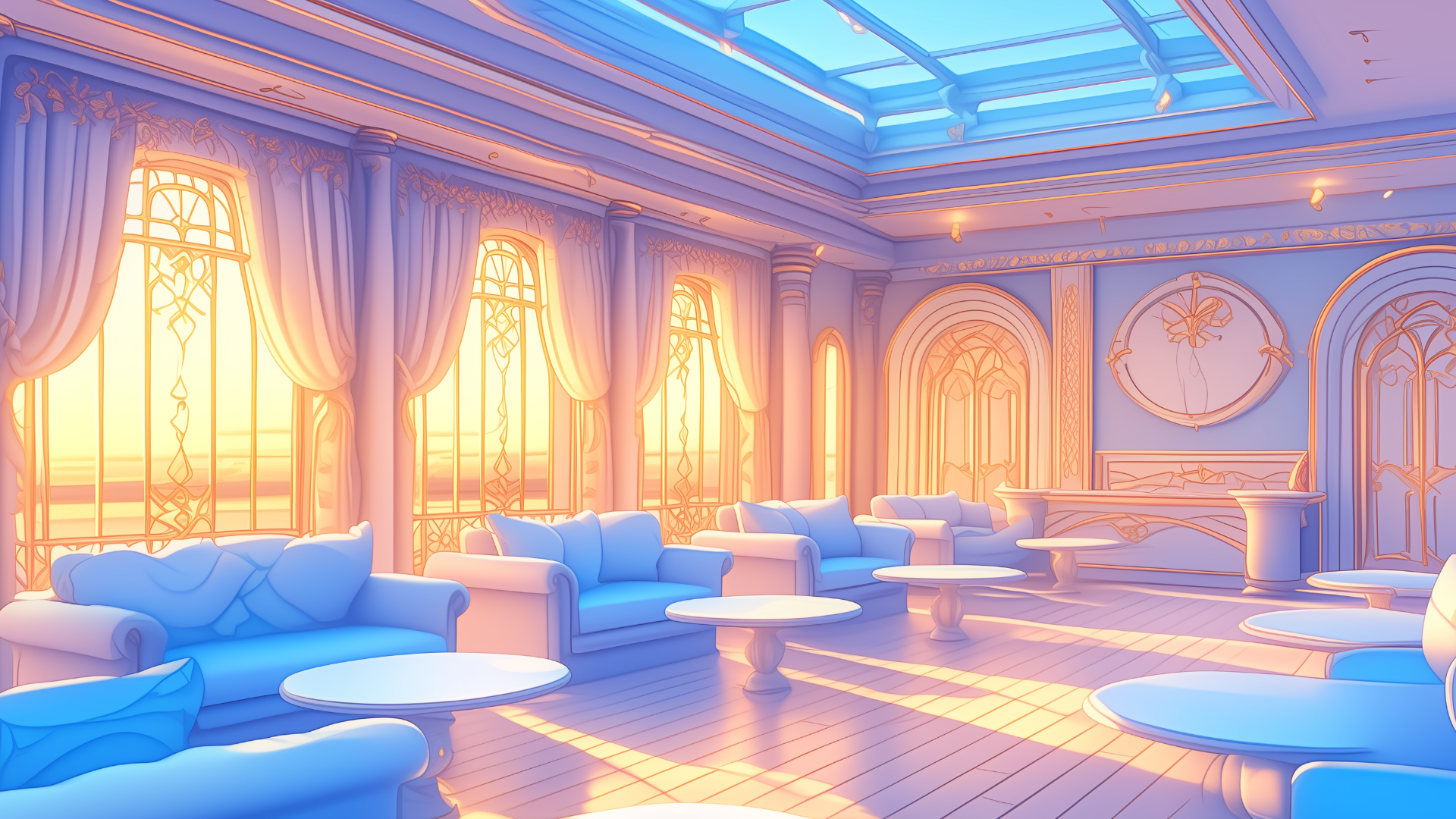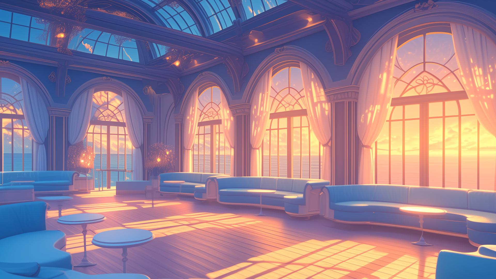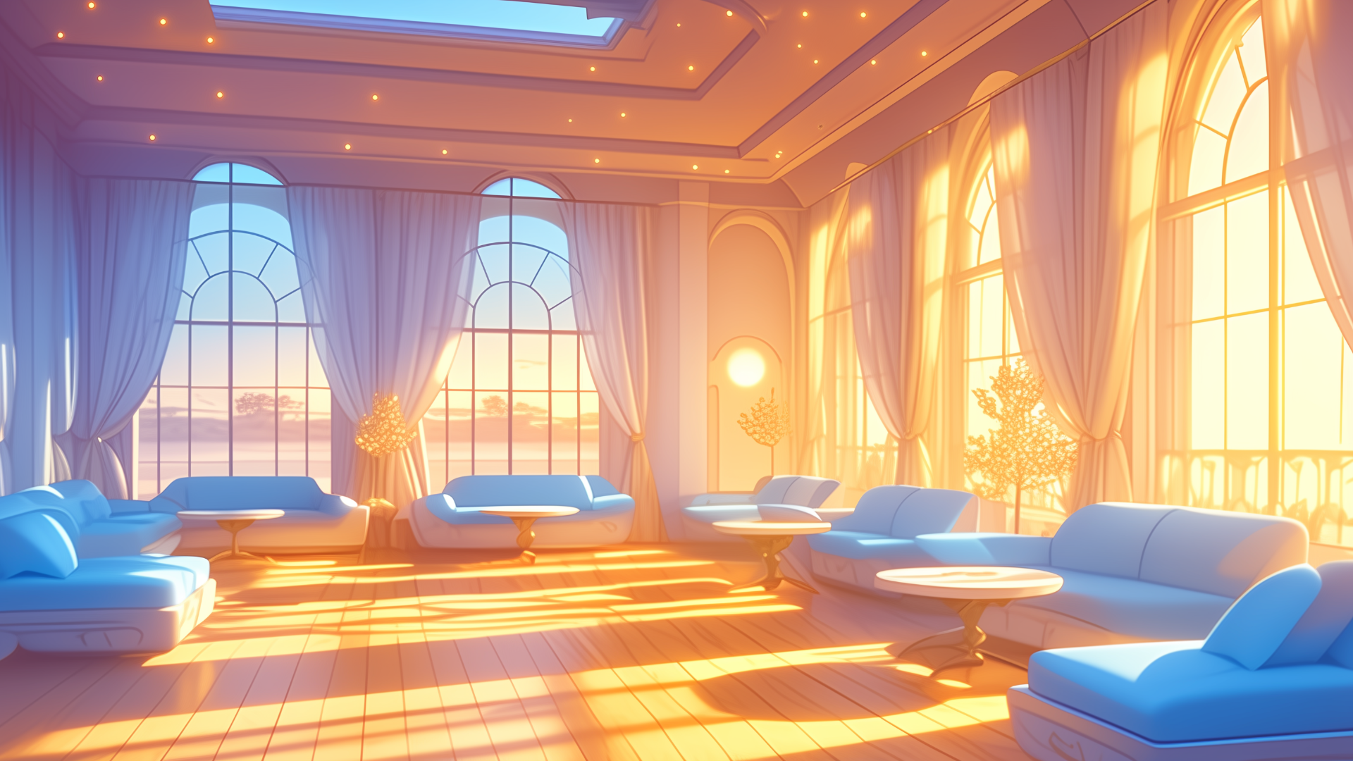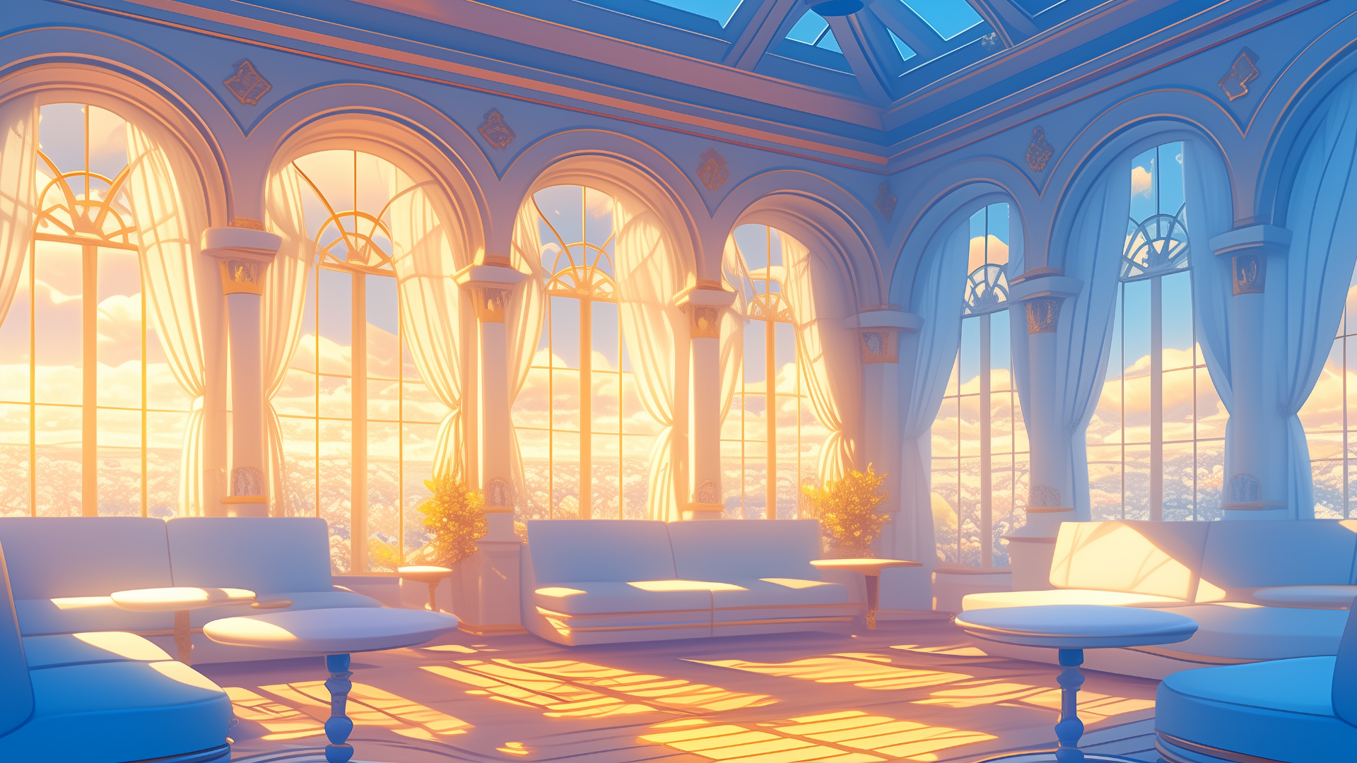 曲線が美しい大きな窓から、夕日がふんだんに差し込む吹き抜けのラウンジ。白と青を基調にしたインテリアが爽やかな印象を与え、天井からの自然光が室内を柔らかく照らす。風の寮をテーマにした物語や、TRPGシナリオに使えるフリー背景素材。