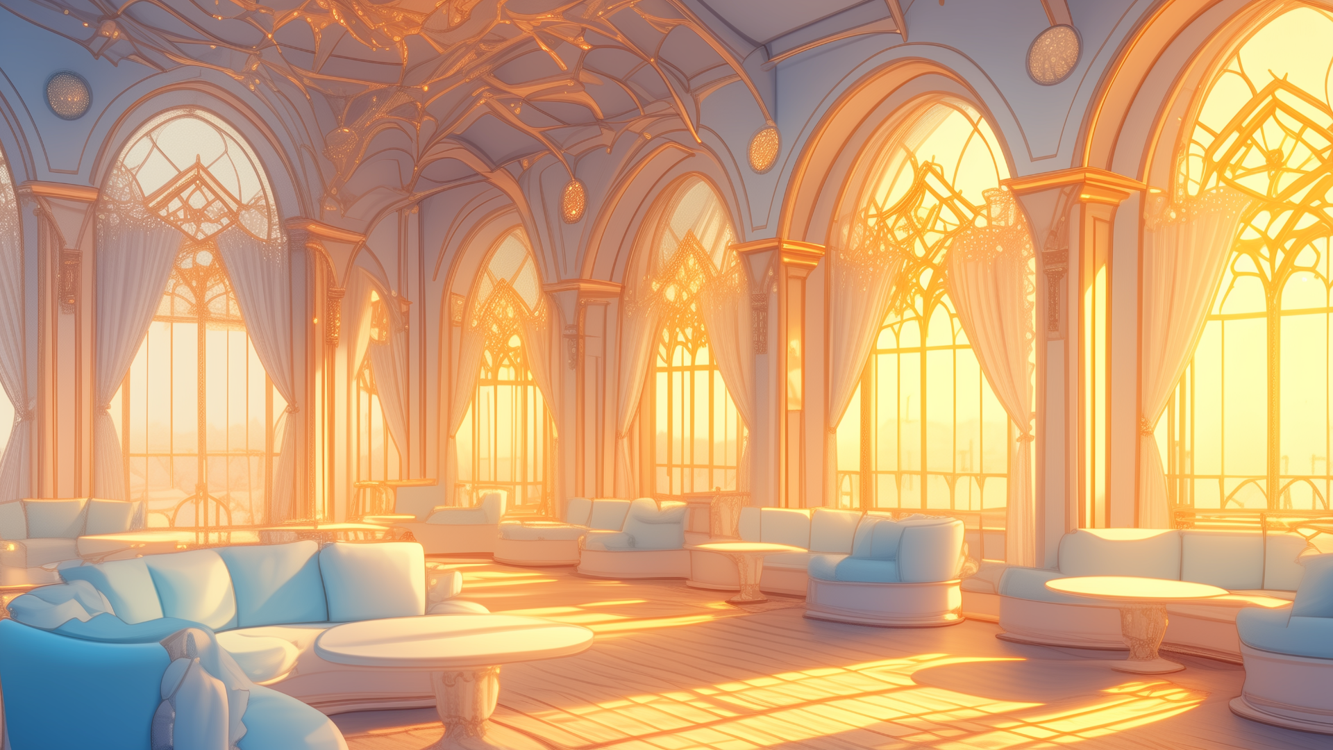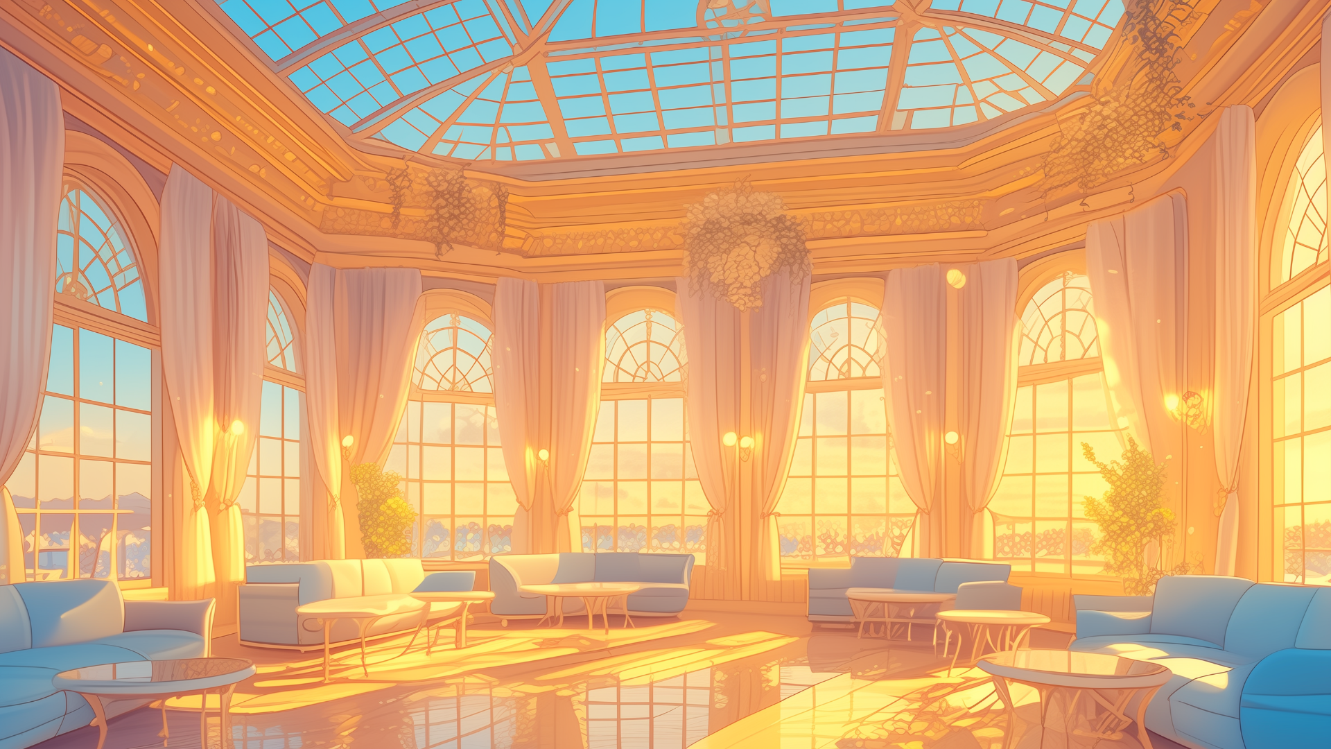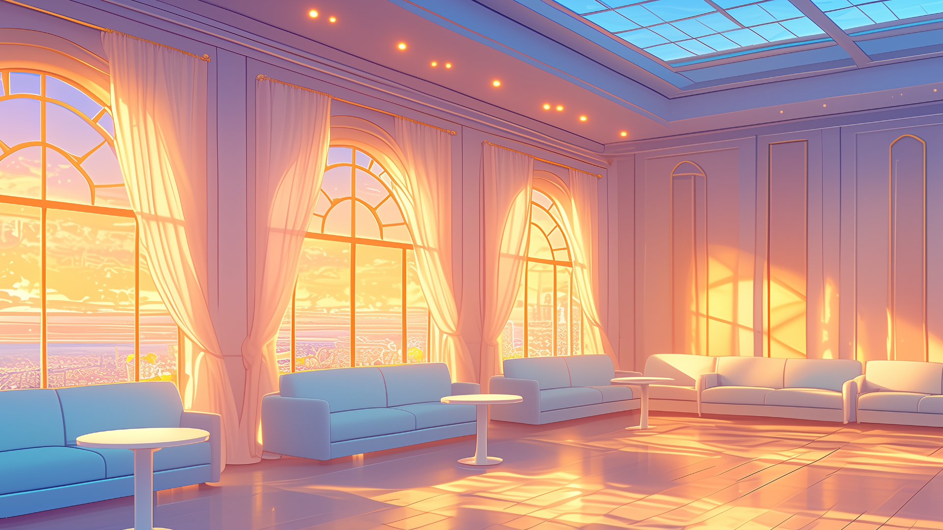 開放感のあるガラス天井と大きな窓が特徴のラウンジ。夕日の光が室内に優しく広がり、柔らかなカーテンがそよぐ中、シンプルな白いソファが整然と配置されている。風の寮らしい軽やかさを表現したフリー背景で、学園ものや魔法系TRPGに適したシーンです。