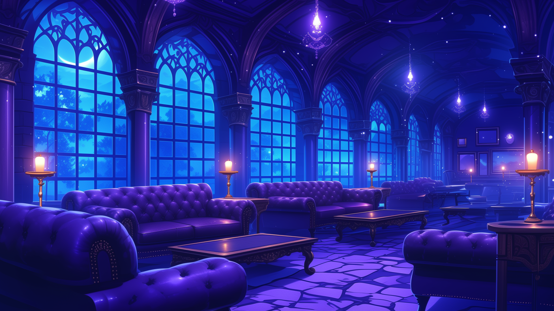 星空と幻想的な建築が映える、荘厳なゴシックスタイルのラウンジ。紫のソファが配置され、深い夜の空気が感じられます。 静けさと高貴さが調和した空間で、物語の緊張感を高める演出が可能です。 推理や陰謀を含むTRPGセッションに適した、フリーの背景画像です。