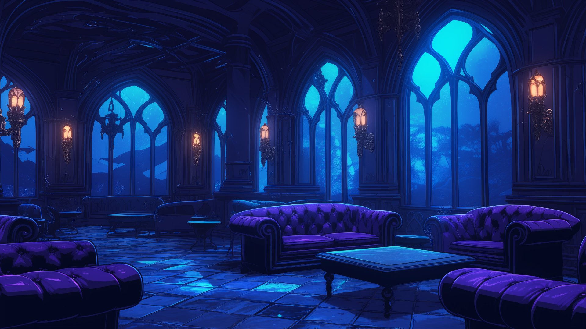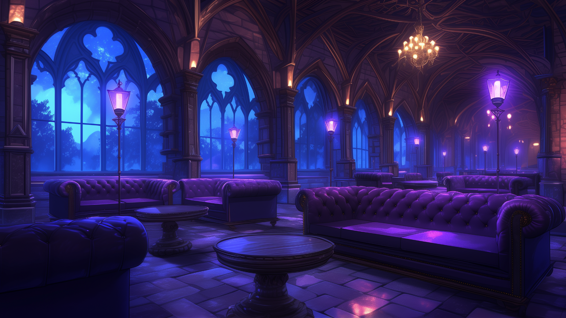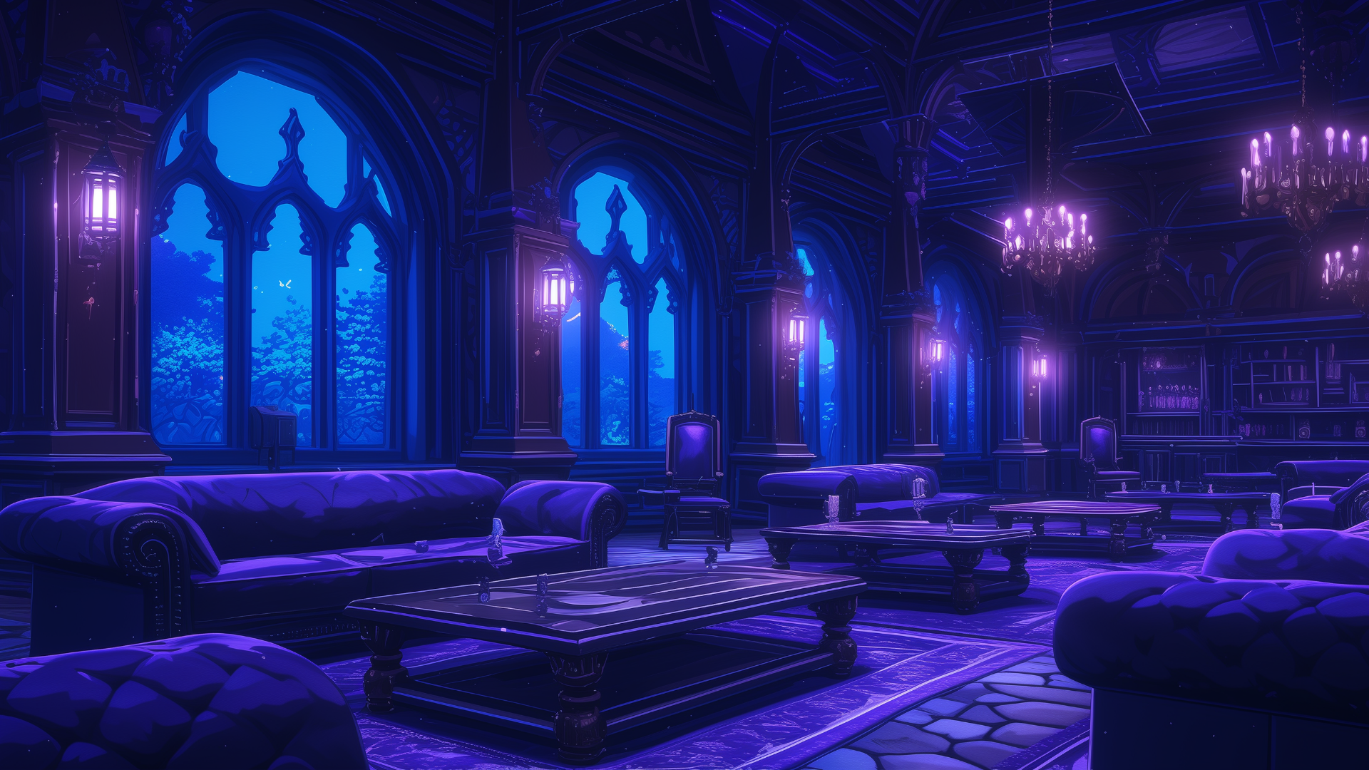 複雑なアーチ構造とゴシック風の照明が演出する、幻想的なラウンジ。紫が基調のインテリアが高級感を漂わせます。 静寂の中で浮かぶ灯りが、不気味さと上品さを同時に感じさせる空間となっています。 ホラーテイストやダークファンタジーのTRPGに適した、フリーの背景素材。
