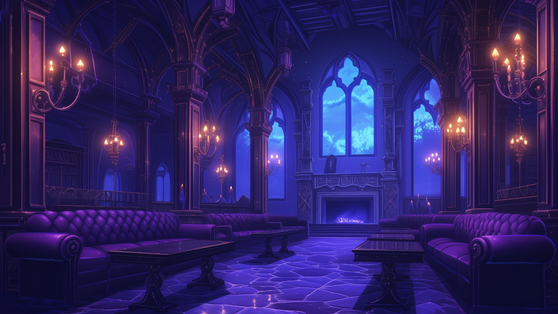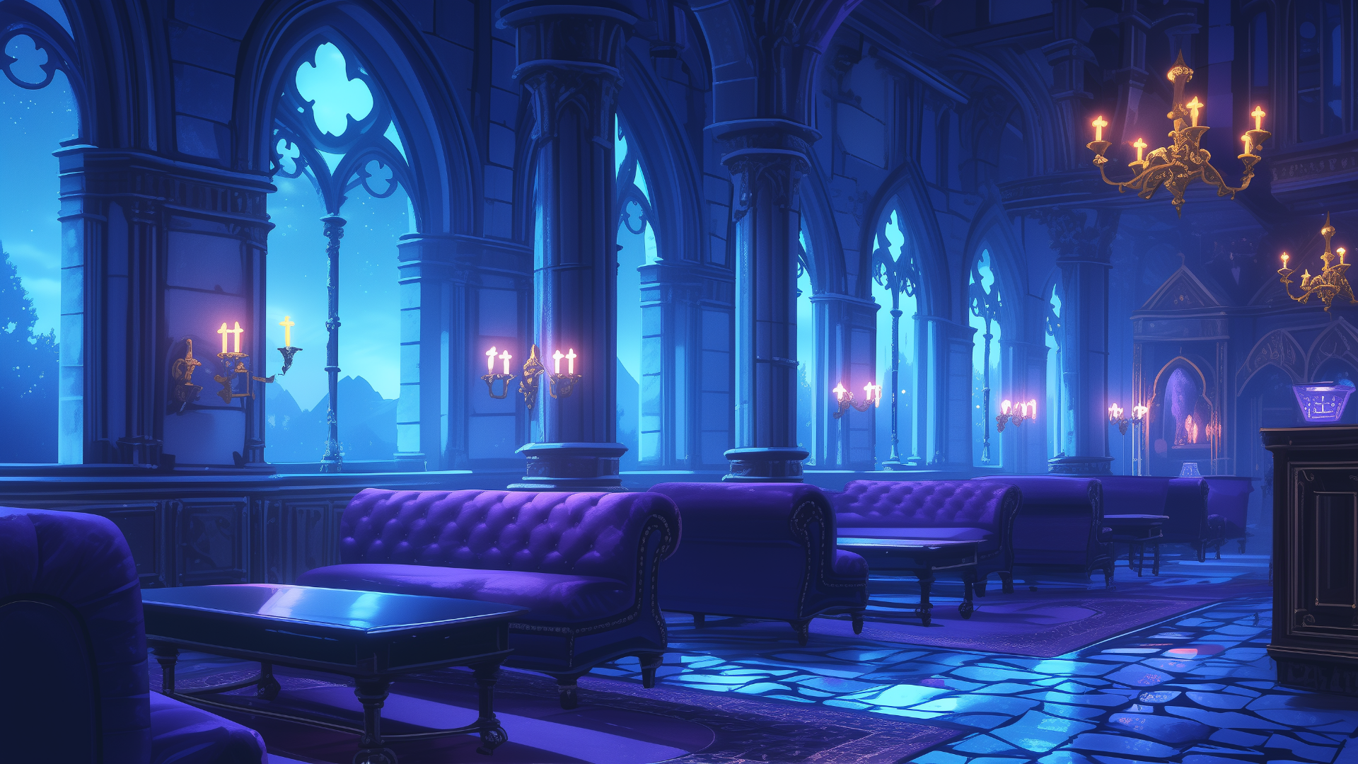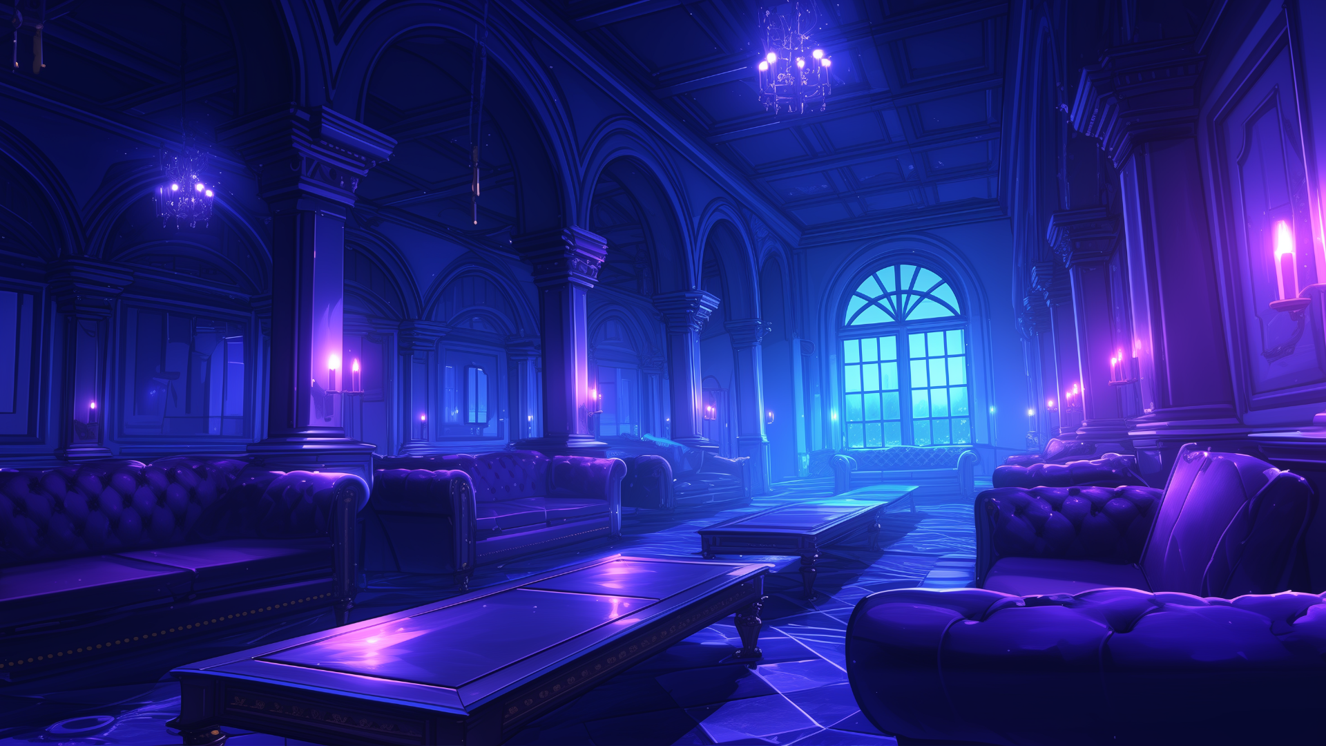 複雑なアーチ構造とゴシック風の照明が演出する、幻想的なラウンジ。紫が基調のインテリアが高級感を漂わせます。 静寂の中で浮かぶ灯りが、不気味さと上品さを同時に感じさせる空間となっています。 ホラーテイストやダークファンタジーのTRPGに適した、フリーの背景素材。