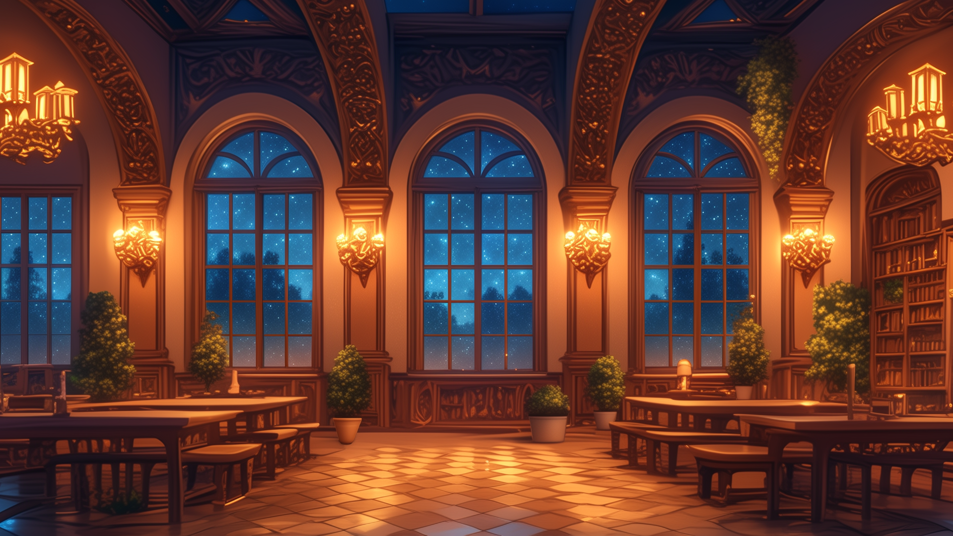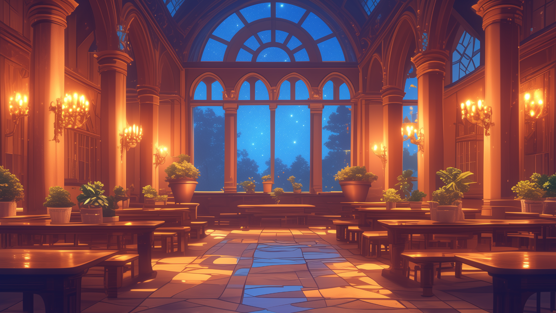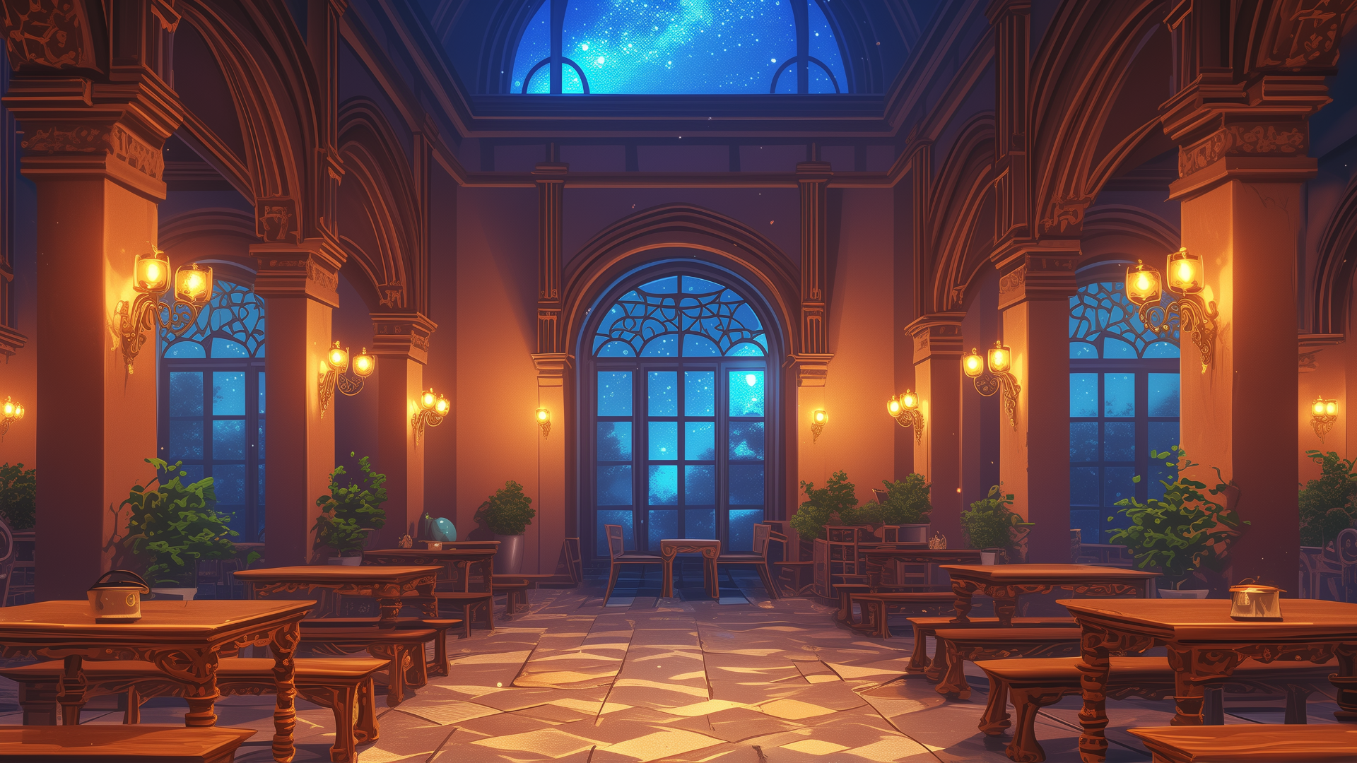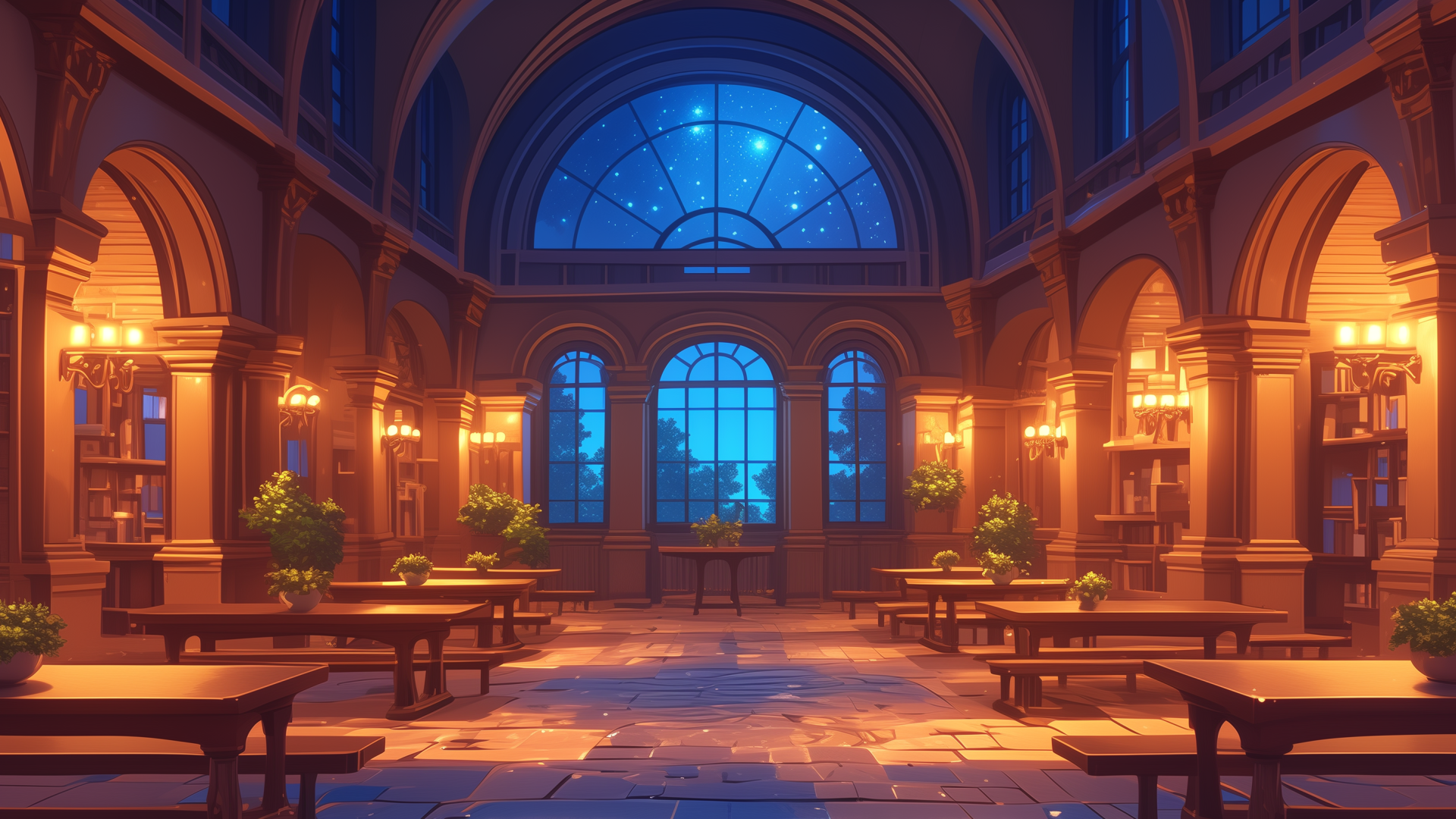 大きな窓の向こうに広がる星降る夜空と、整然と配置されたベンチと机が広がる談話スペース。植物が生い茂り、温もりある照明が優しく照らす。学園ものや魔法使いの拠点を演出するフリー背景素材。