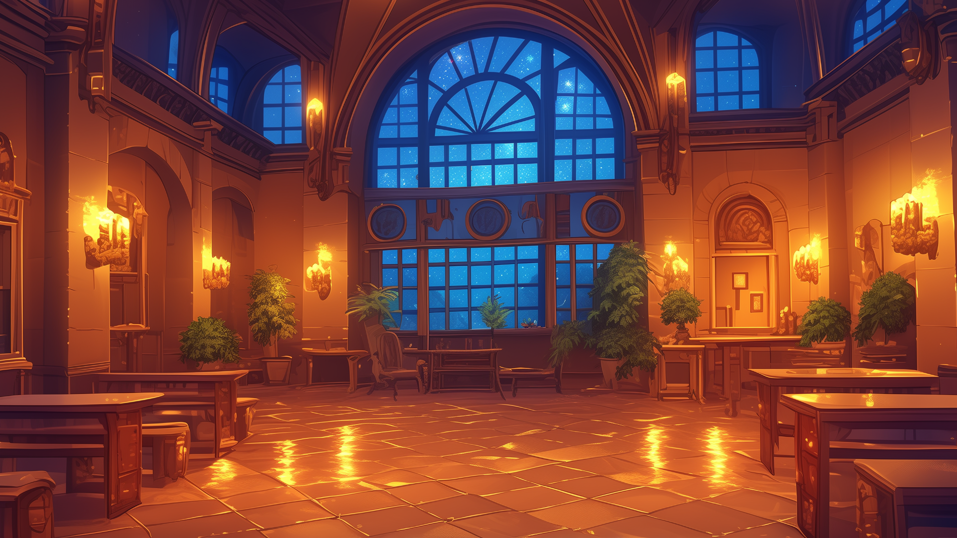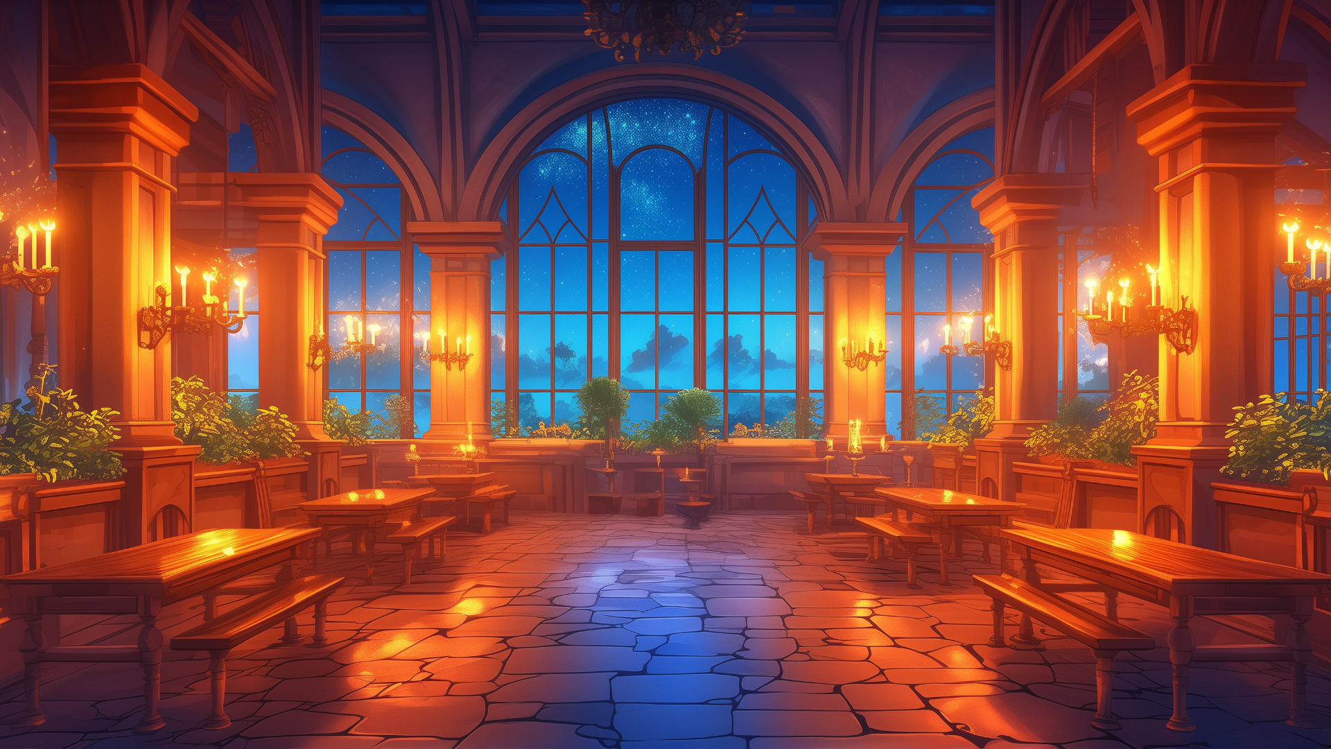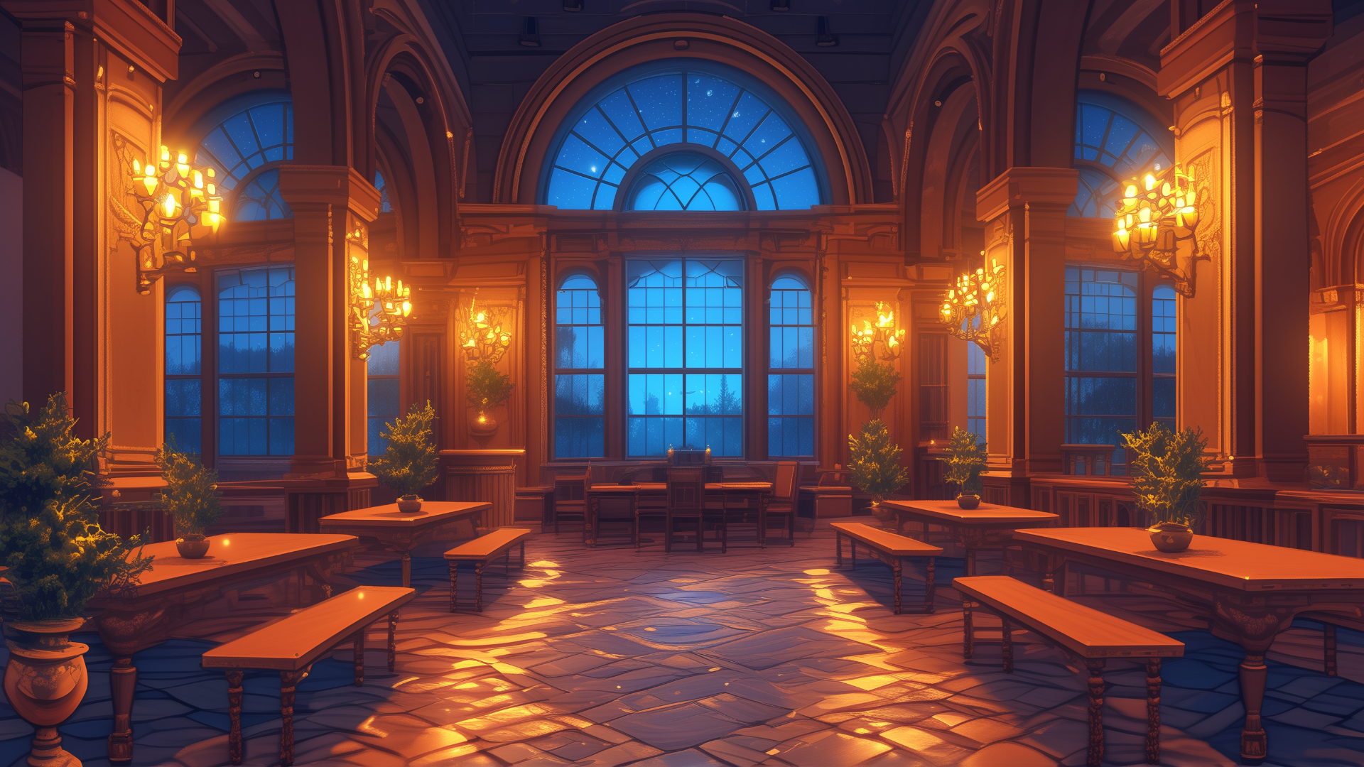 夜の静けさが広がる石造りのホールに、鉢植えの植物と温かなシャンデリアの光が彩りを加える。中世風の学校や地下組織の集会所など、物語の舞台に深みを与える幻想的なシーンにぴったりの背景素材。