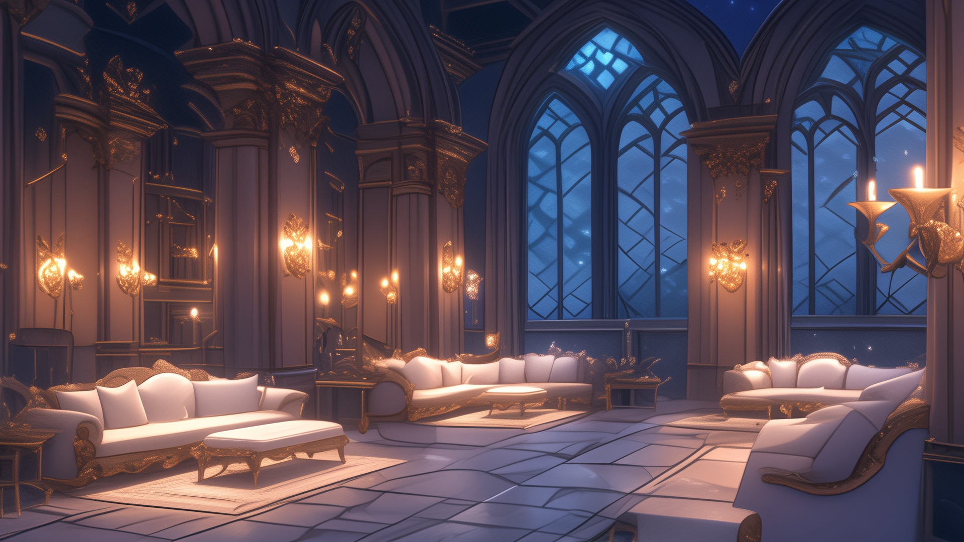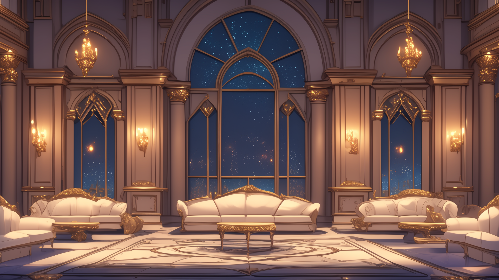 白と金を基調にした壮麗なラウンジに、大きな窓から広がる星空が映える夜の情景。シャンデリアの光が静かに揺れ、空間に神秘的な重厚感を与えています。TRPGの貴族系キャラクターの住まいや、儀式前の控室としても使えるフリー背景素材。