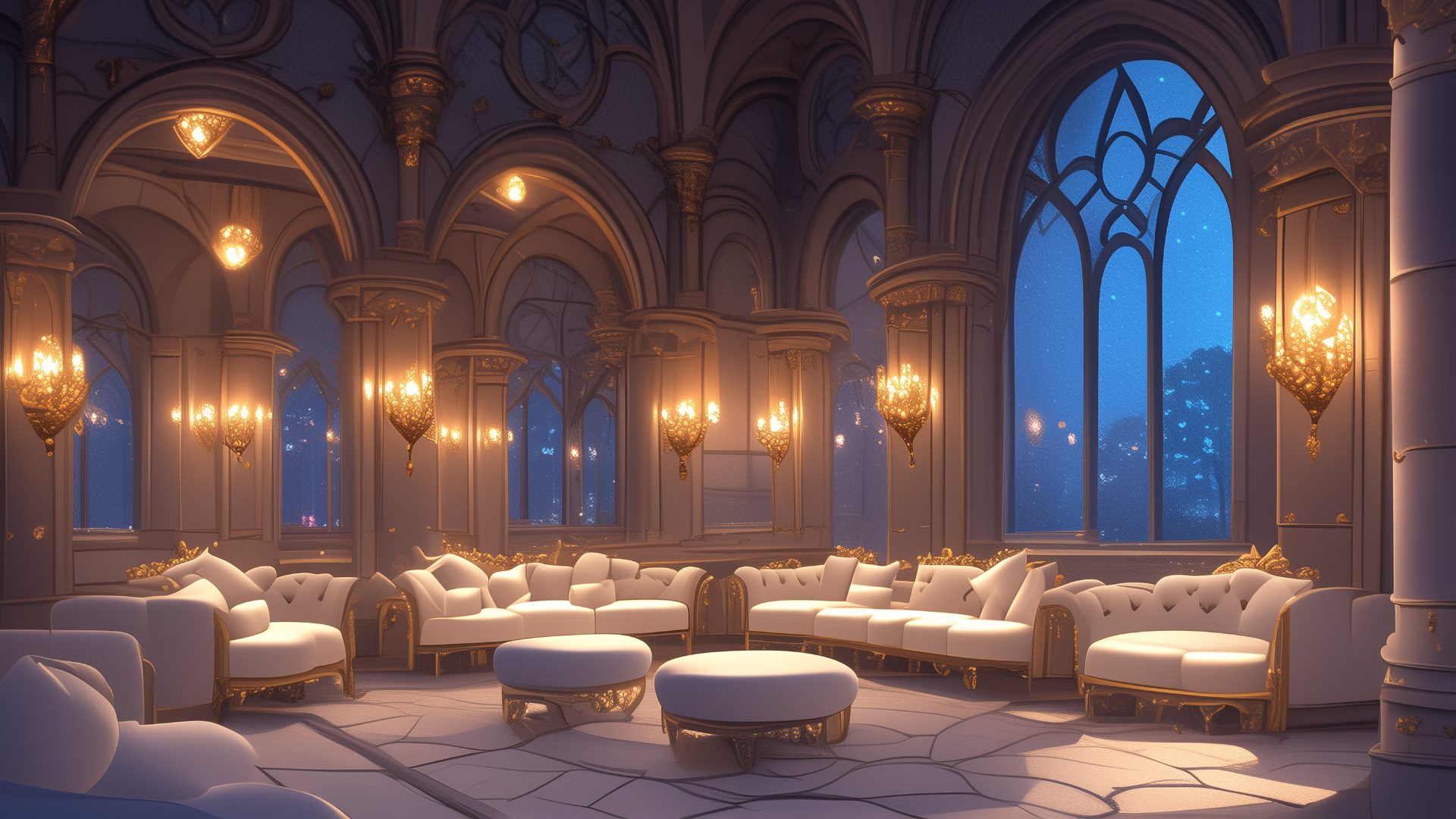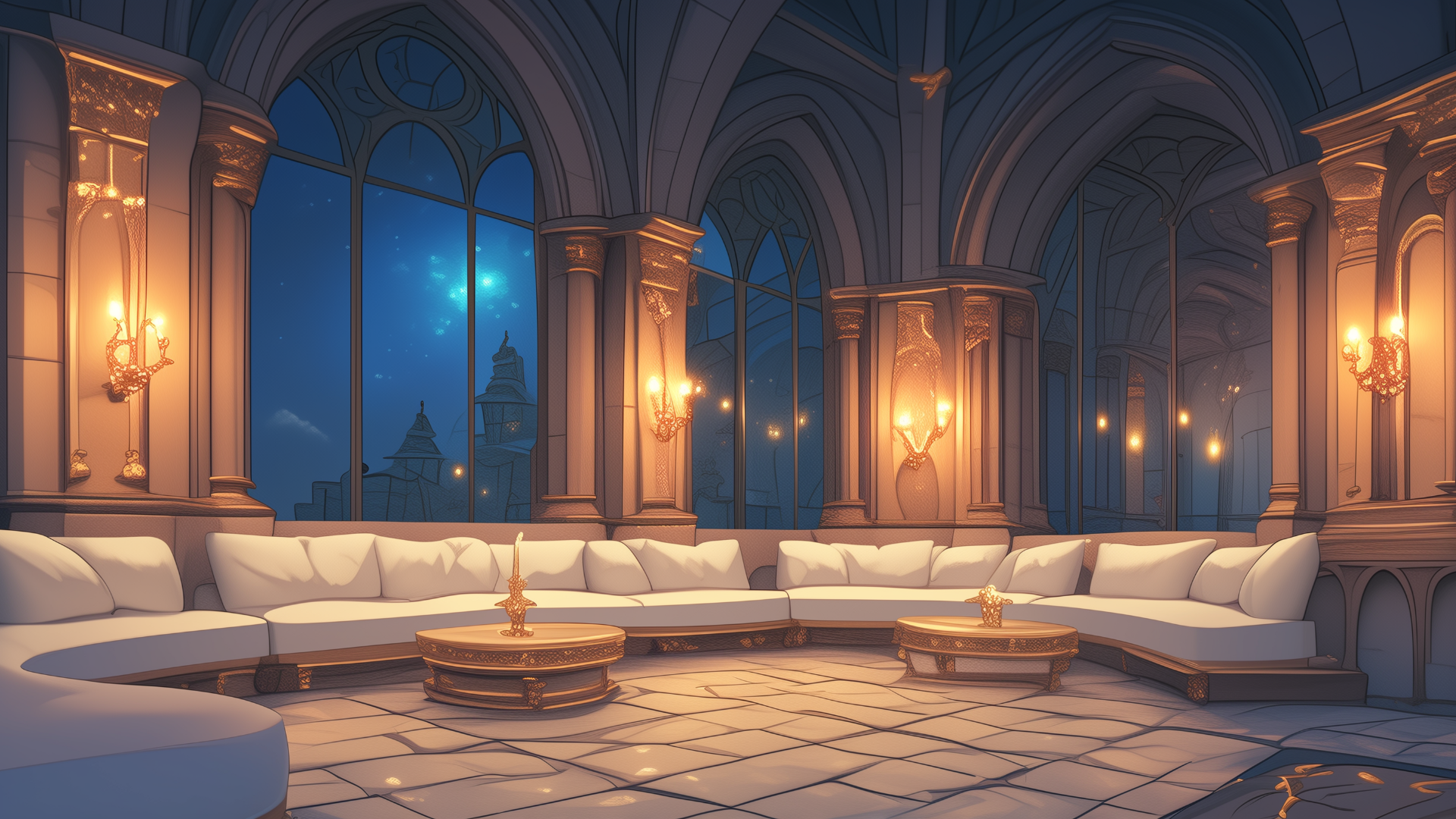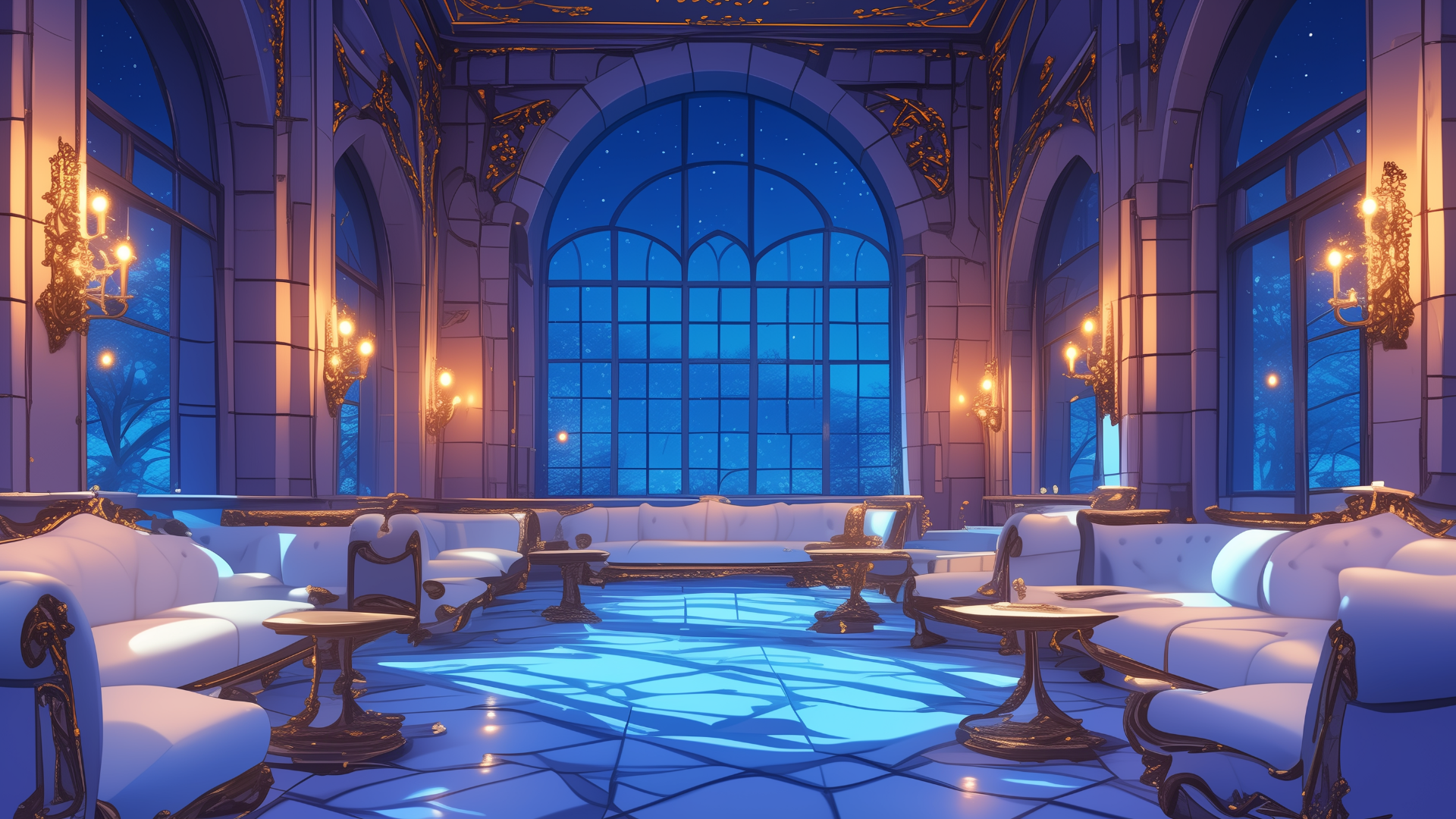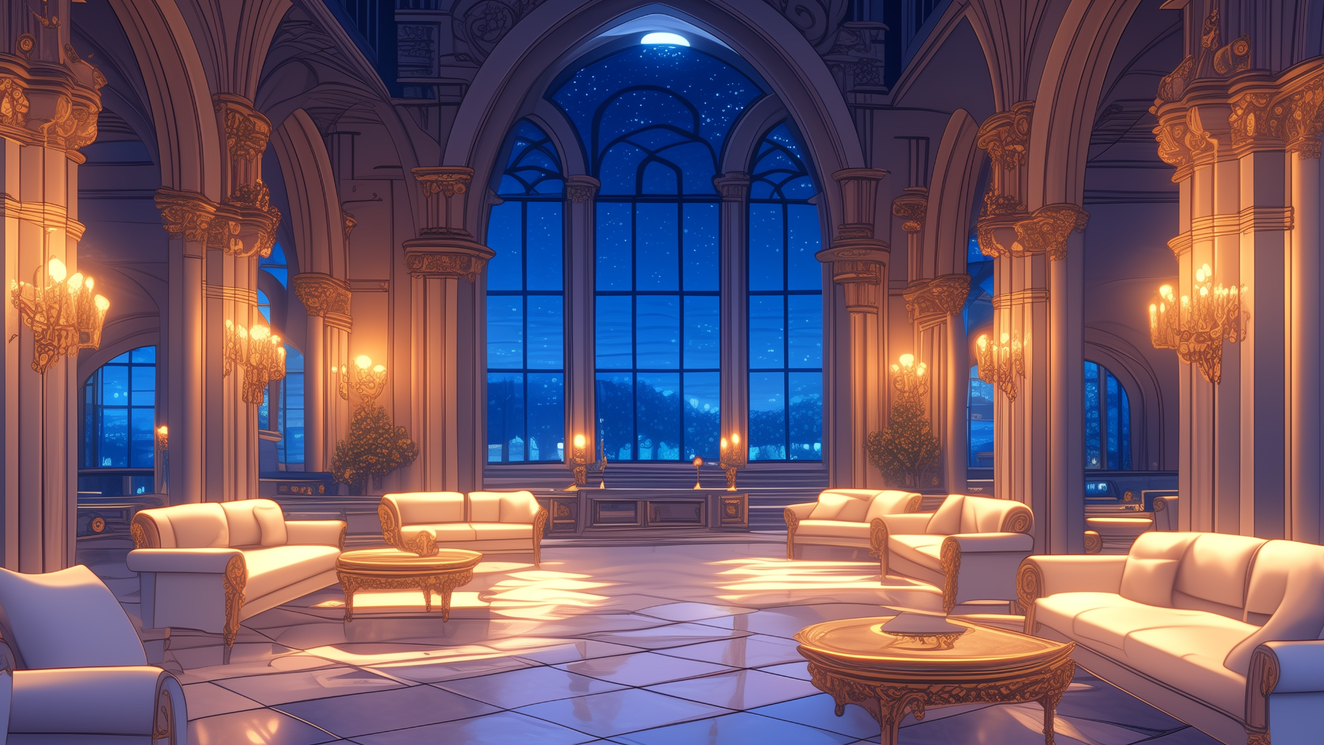 アーチ状の窓に囲まれた広々としたラウンジに、円形の白いソファが円卓を囲むように配置された空間。室内の灯りと夜空の青が調和し、落ち着いた対話の場として演出されています。TRPGの探索準備や密談イベントなどに最適なフリー背景素材です。