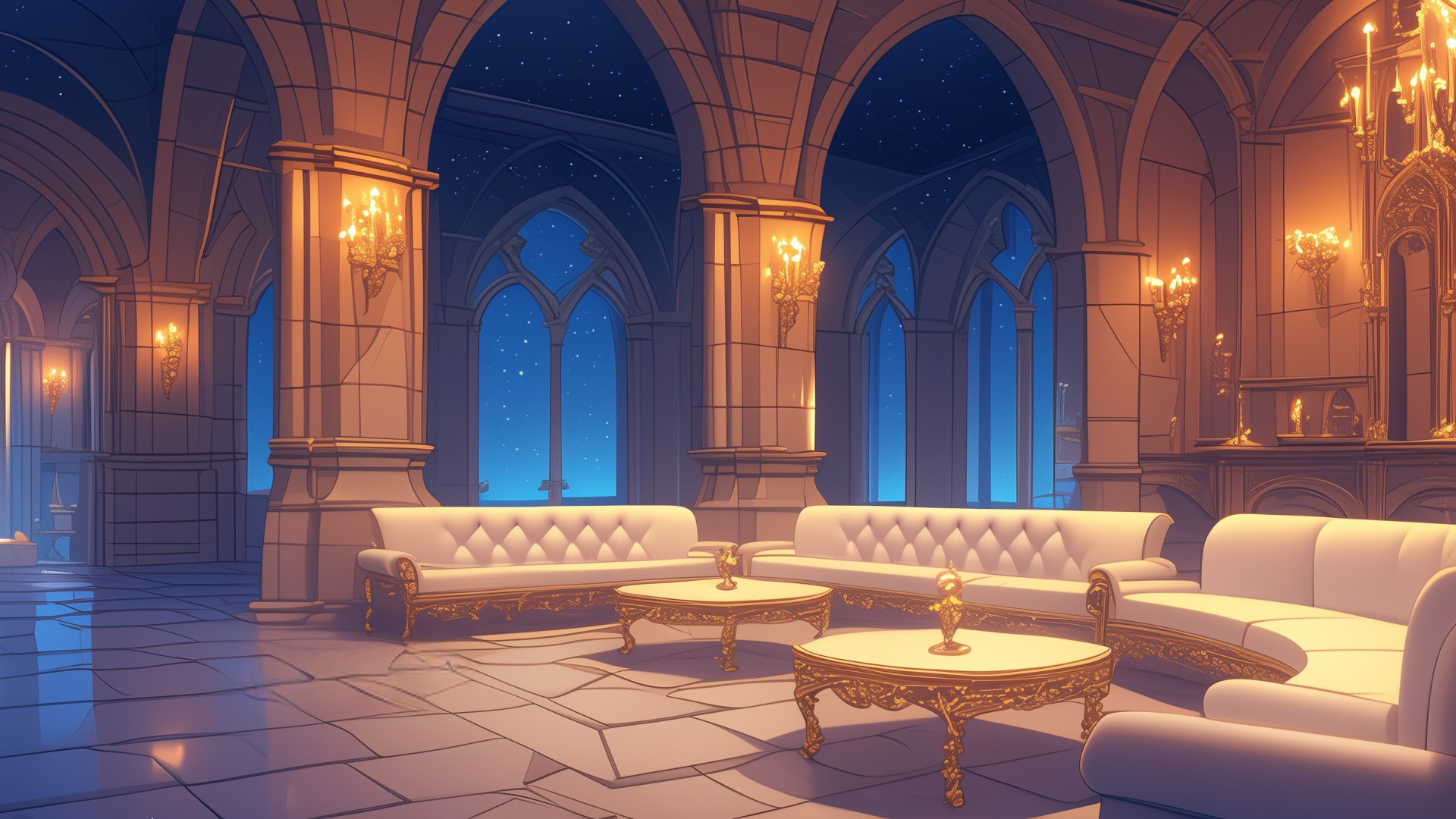 星空の下、高いアーチ天井に囲まれたクラシックなラウンジの風景。白いソファと金装飾のテーブルが、静けさの中に気品ある輝きを放っています。TRPGでの神聖な寮や魔法学校の夜のひとときに使えるフリー背景画像。