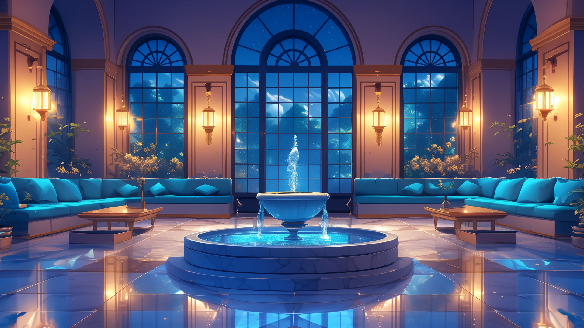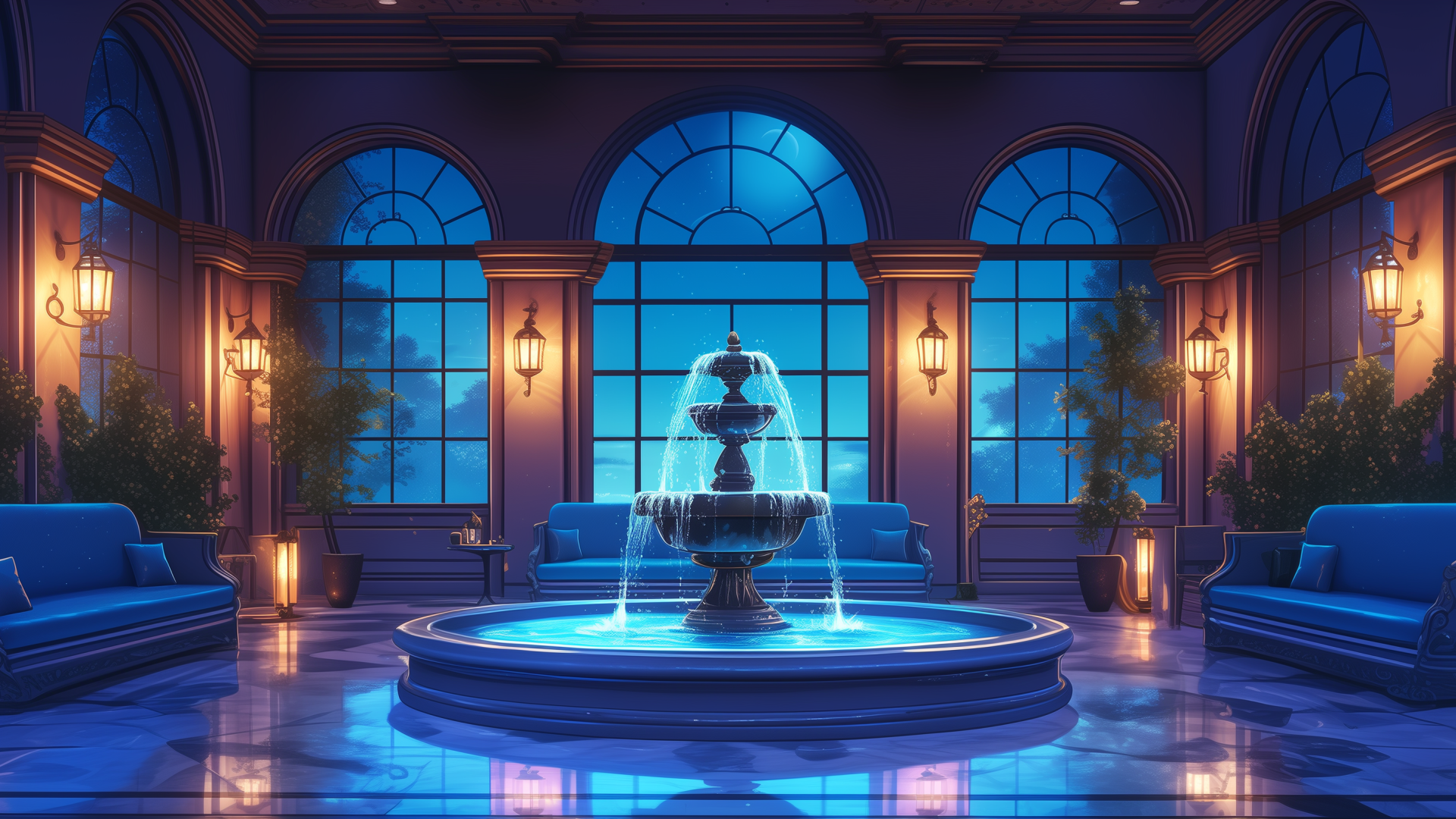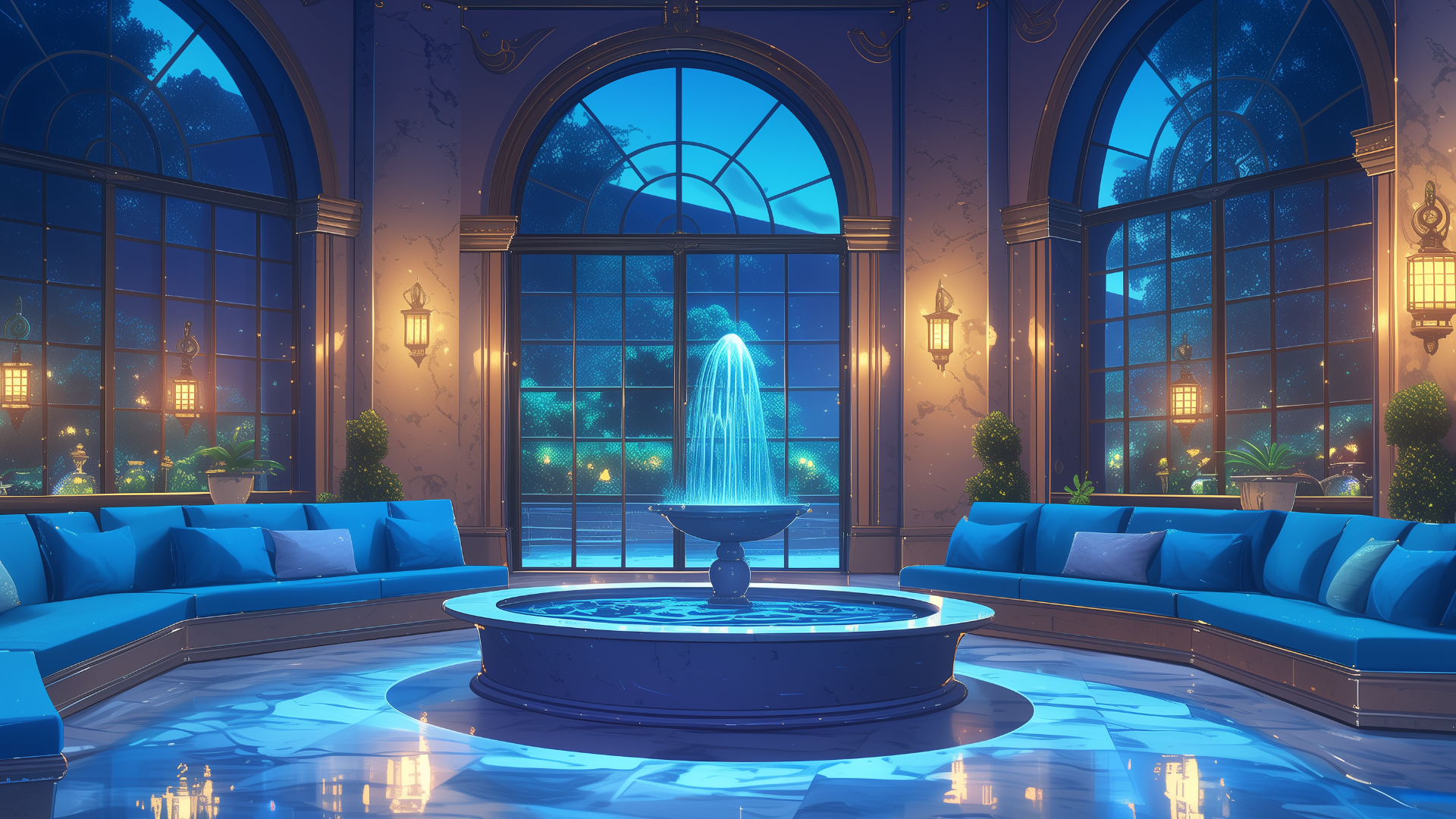 ラウンジの中央に据えられた水色の噴水が、夜の室内に幻想的な雰囲気を醸し出している。ソファの青と植物の緑がバランスよく配置され、全体に清涼感が広がる。TRPGでの静かな対話や感情的な場面演出に使えるフリー背景画像。