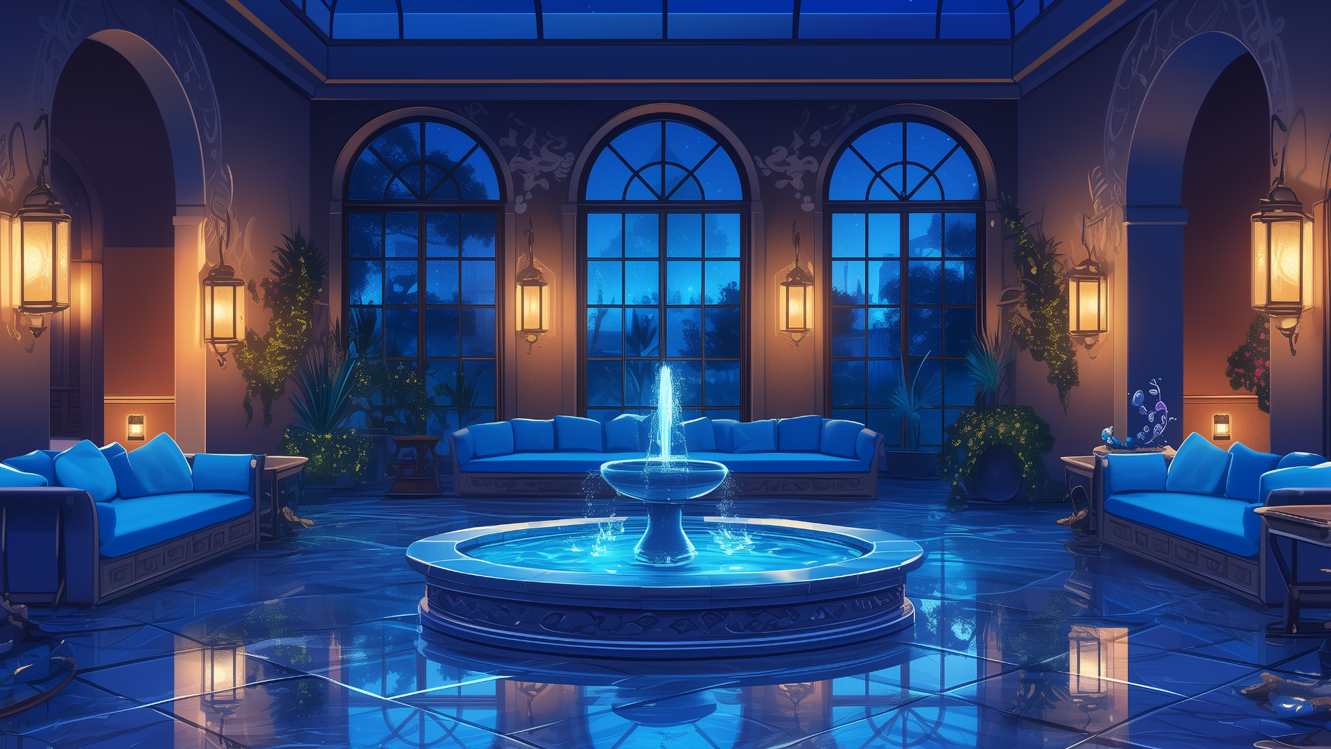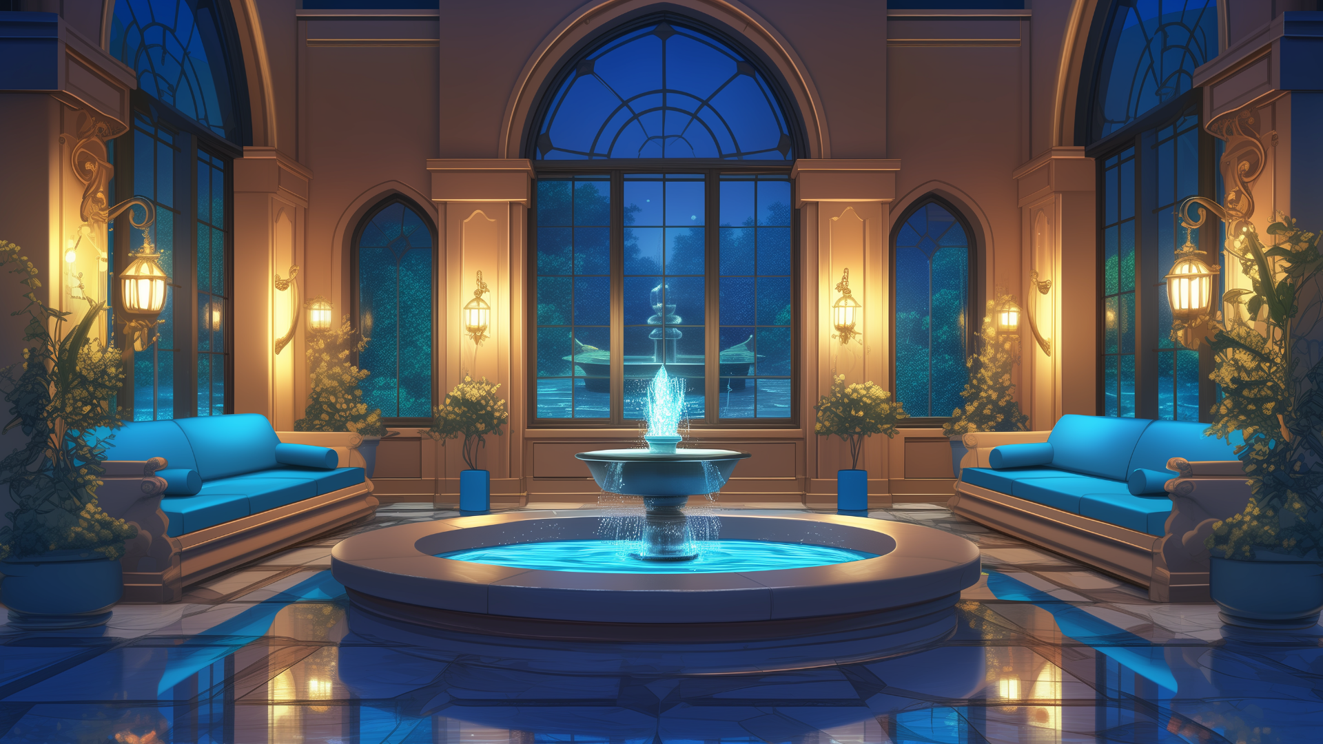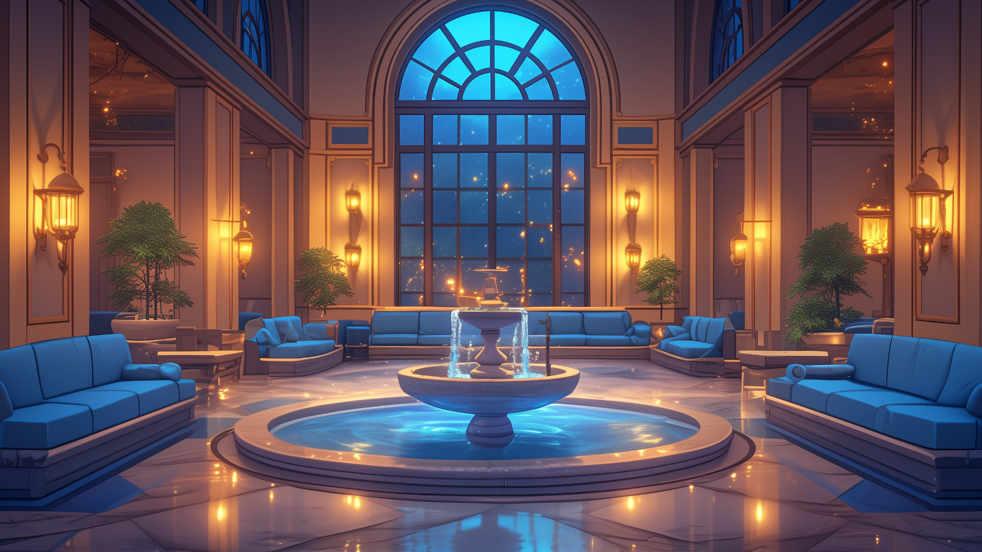 ラウンジの中央に据えられた水色の噴水が、夜の室内に幻想的な雰囲気を醸し出している。ソファの青と植物の緑がバランスよく配置され、全体に清涼感が広がる。TRPGでの静かな対話や感情的な場面演出に使えるフリー背景画像。