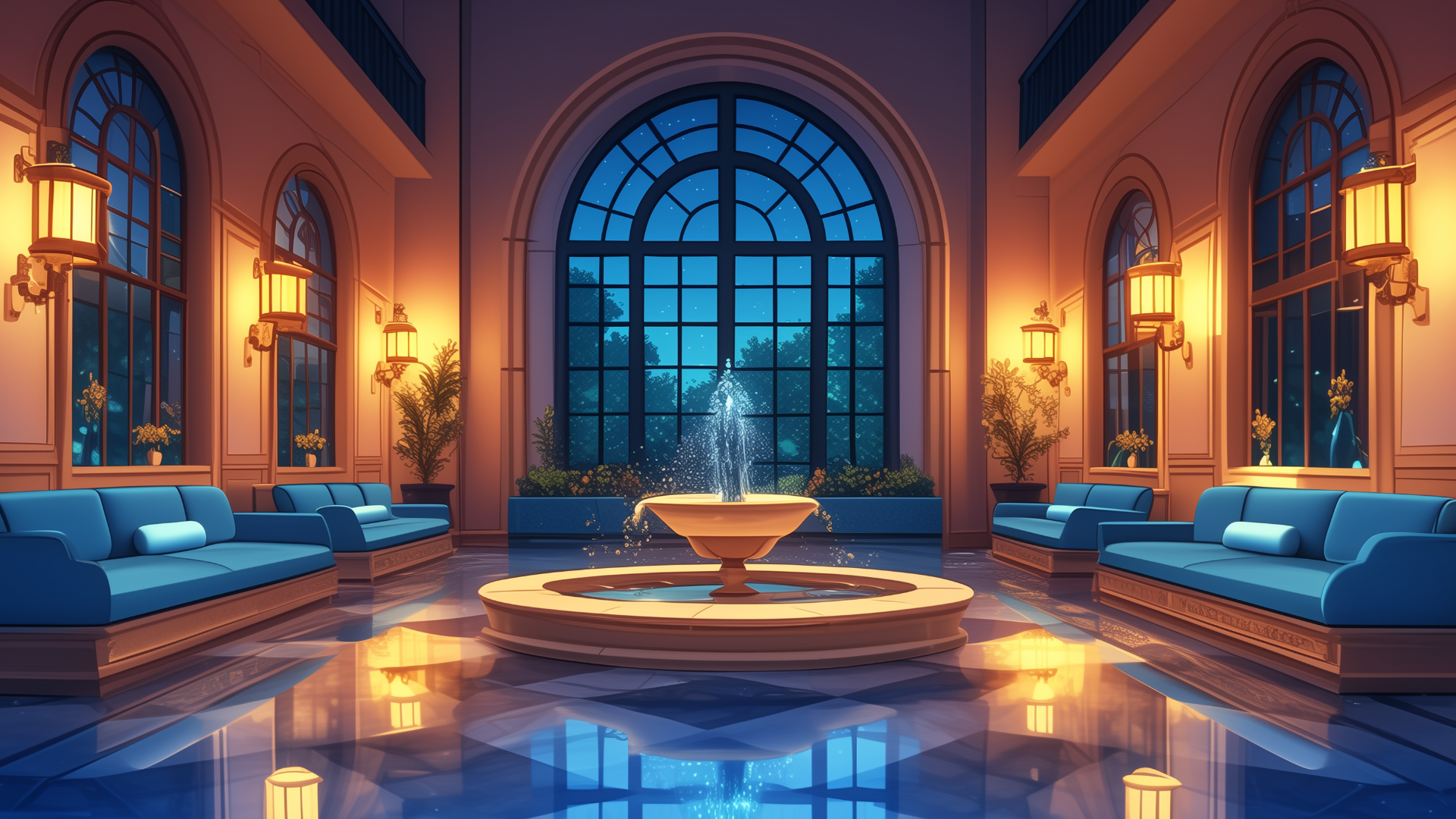 クラシックな装飾とアーチ型の窓が印象的な空間に、中央の噴水が穏やかに水を放っている。両側には水色のソファが配置され、温かな間接照明が夜の静けさを引き立てる。TRPGシナリオの夜の休憩や情報共有の場に最適なフリー背景素材。