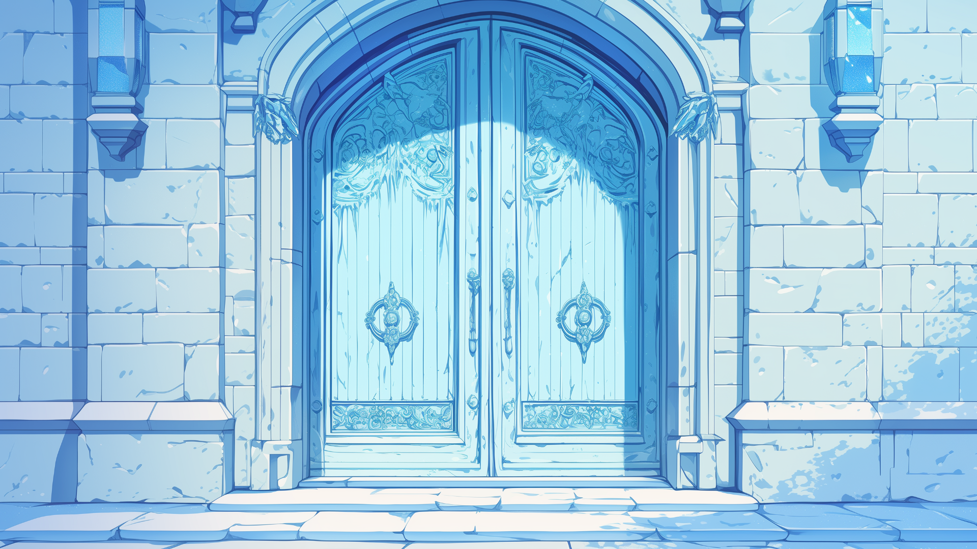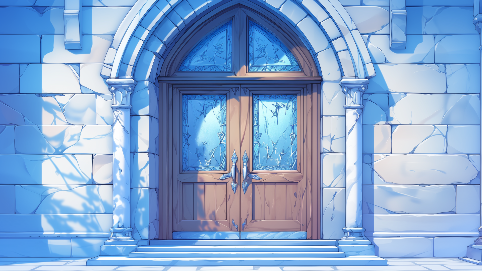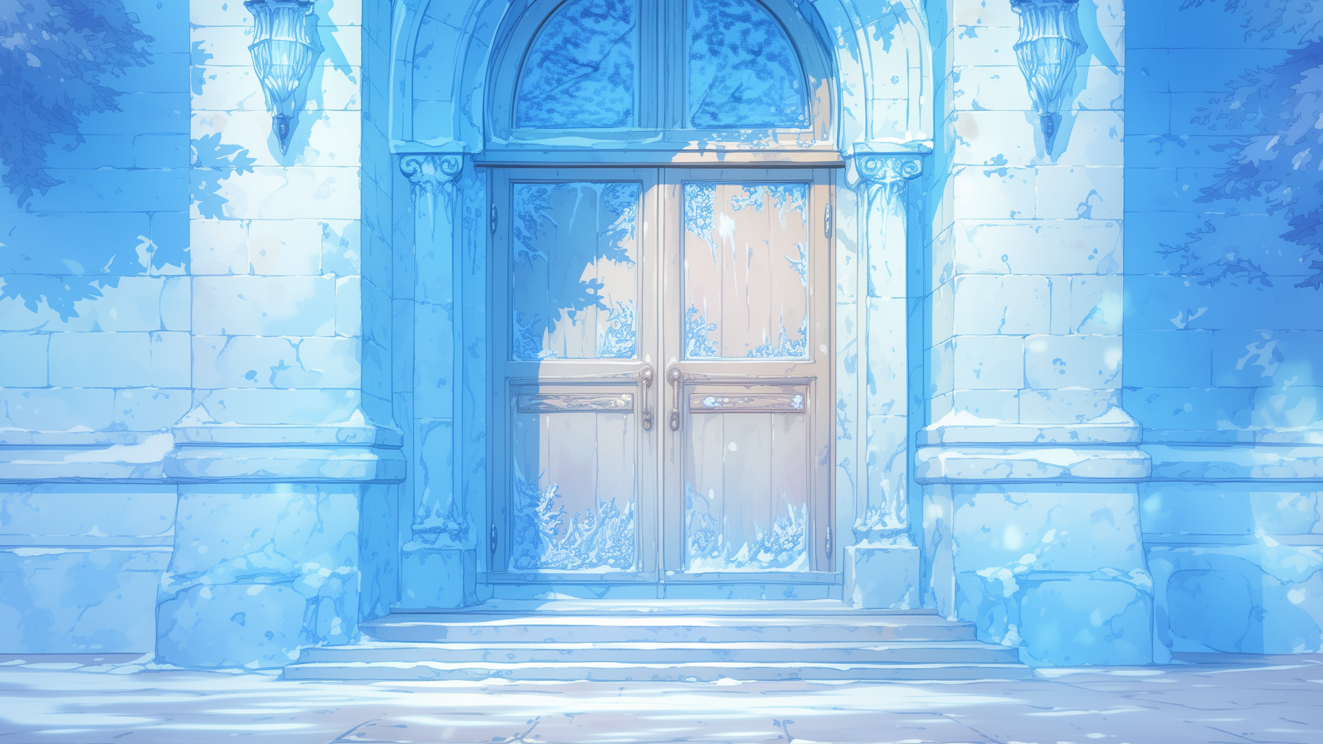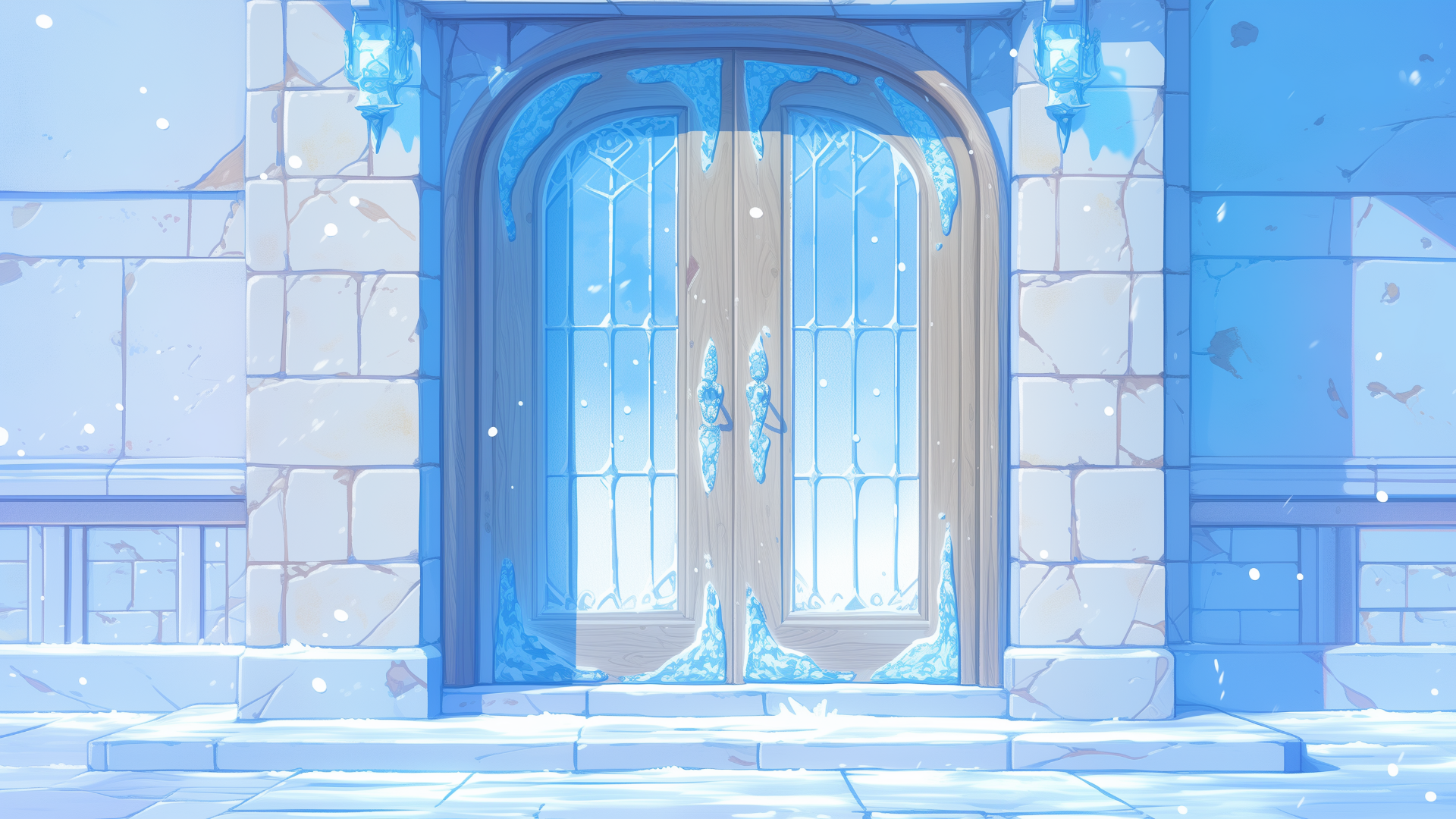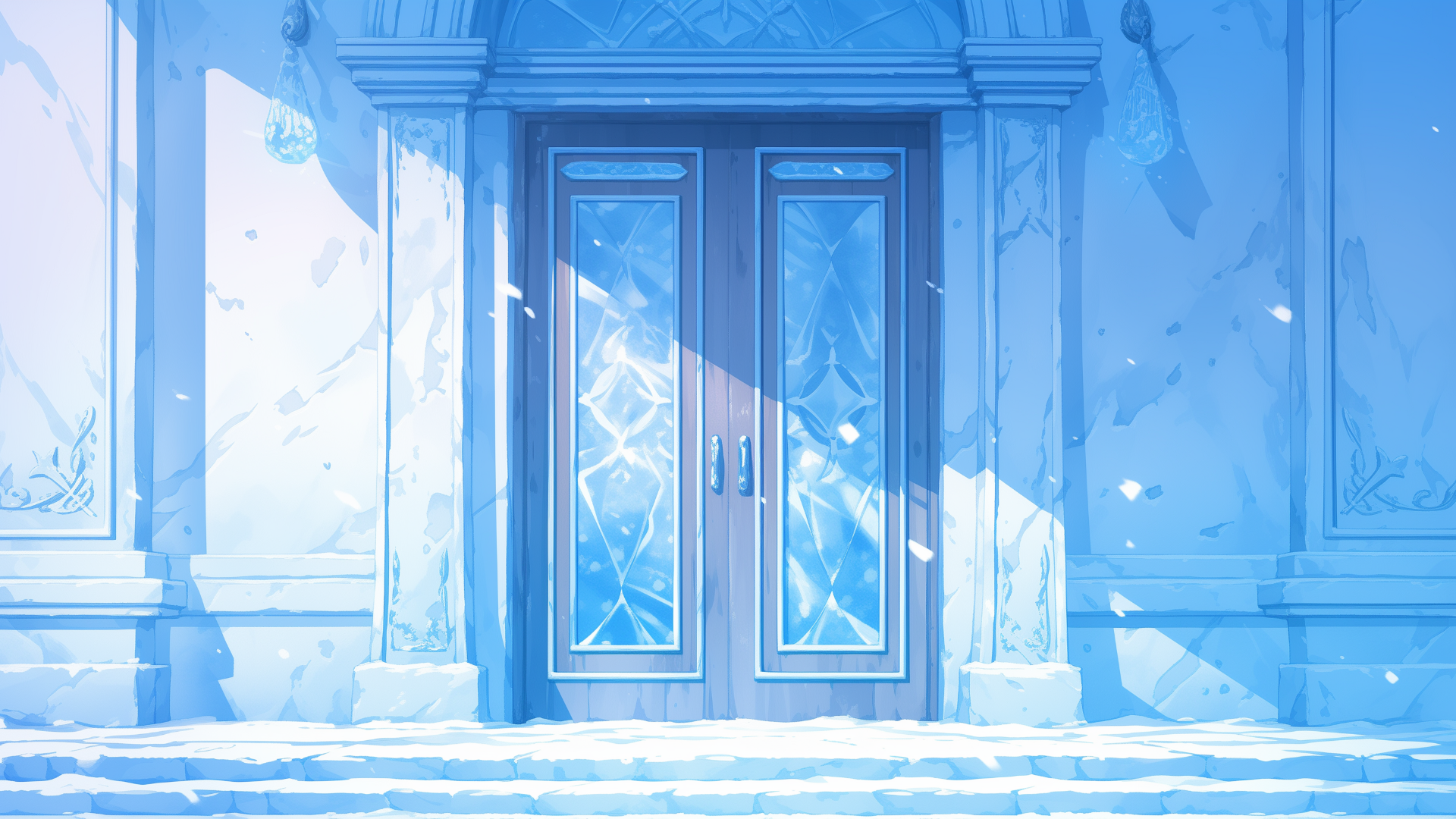 雪が積もる階段と、きらめく氷の模様が施されたクリスタル調のガラス扉が印象的。柔らかい光が扉を照らし、神秘的な雰囲気を演出します。氷の女王の居城や寒冷地域の施設などに使える背景素材。