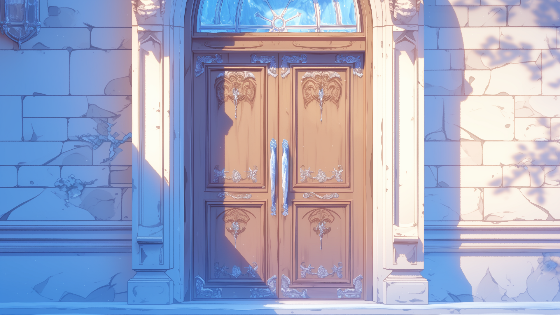 扉全体に繊細な彫刻と氷の装飾が施された木製ドア。日差しが差し込む中で氷がきらめき、幻想的な雰囲気を漂わせています。冬の魔法使いの学寮や氷雪の聖堂のシーンにぴったりのフリー背景素材。