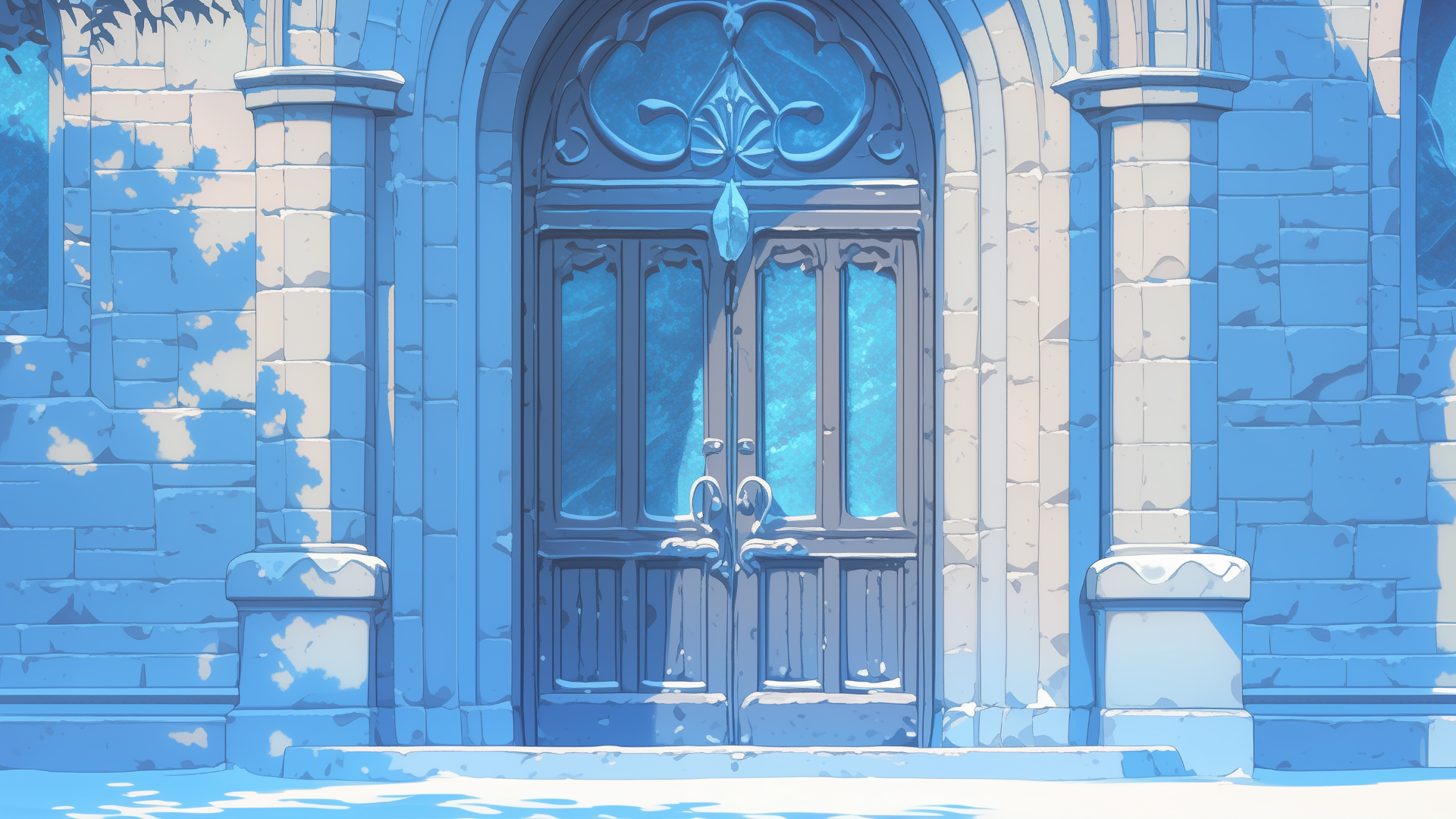 青く光るステンドガラスがはめ込まれた重厚な扉。全体が薄く雪に覆われ、冬の静寂を感じさせます。氷の結界や古の魔法研究施設など、幻想的なTRPGシーンに適したフリー背景素材。