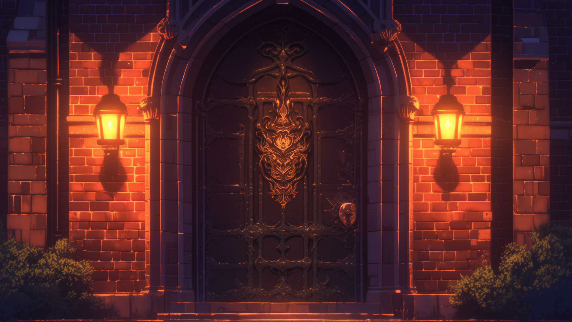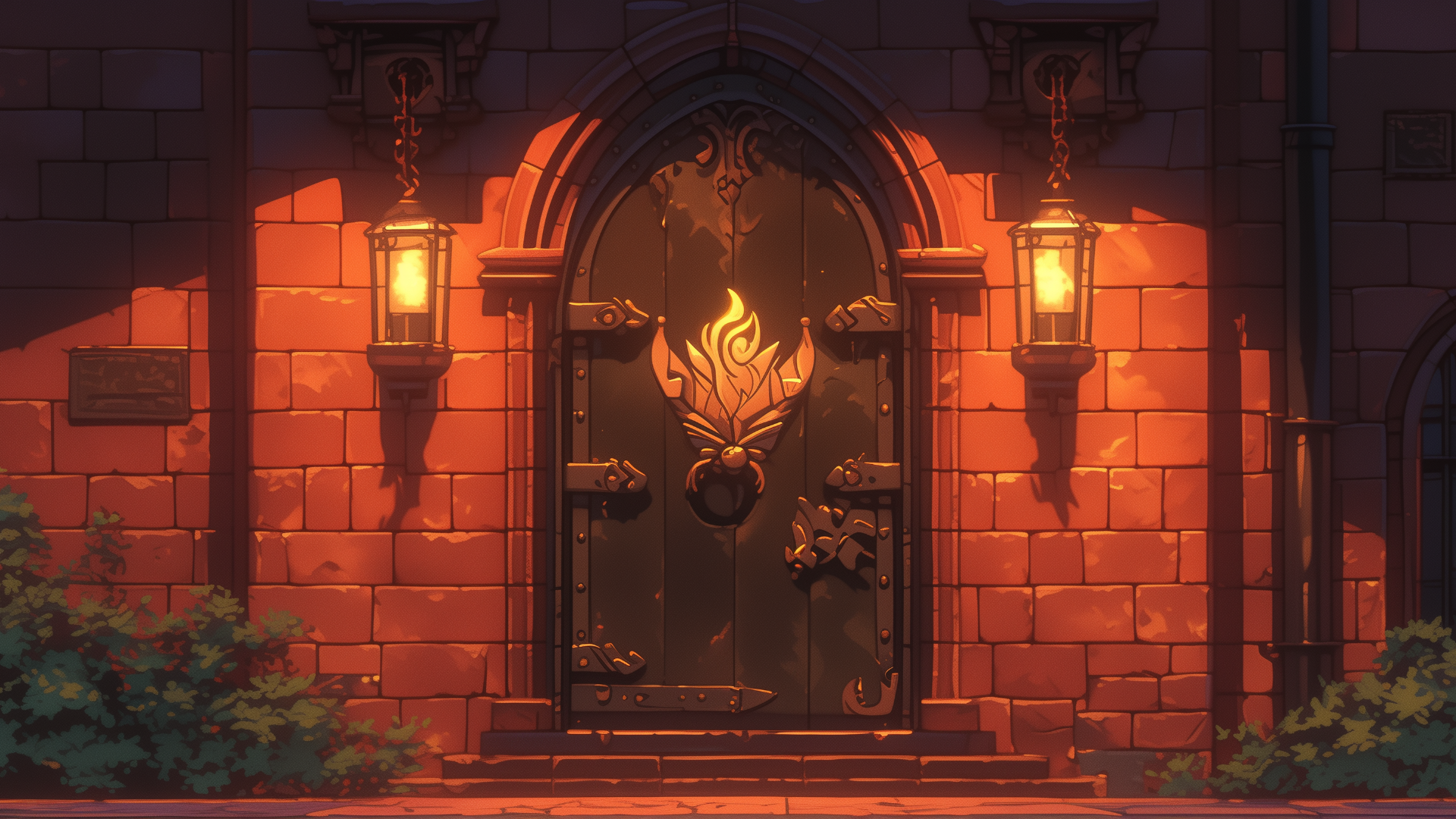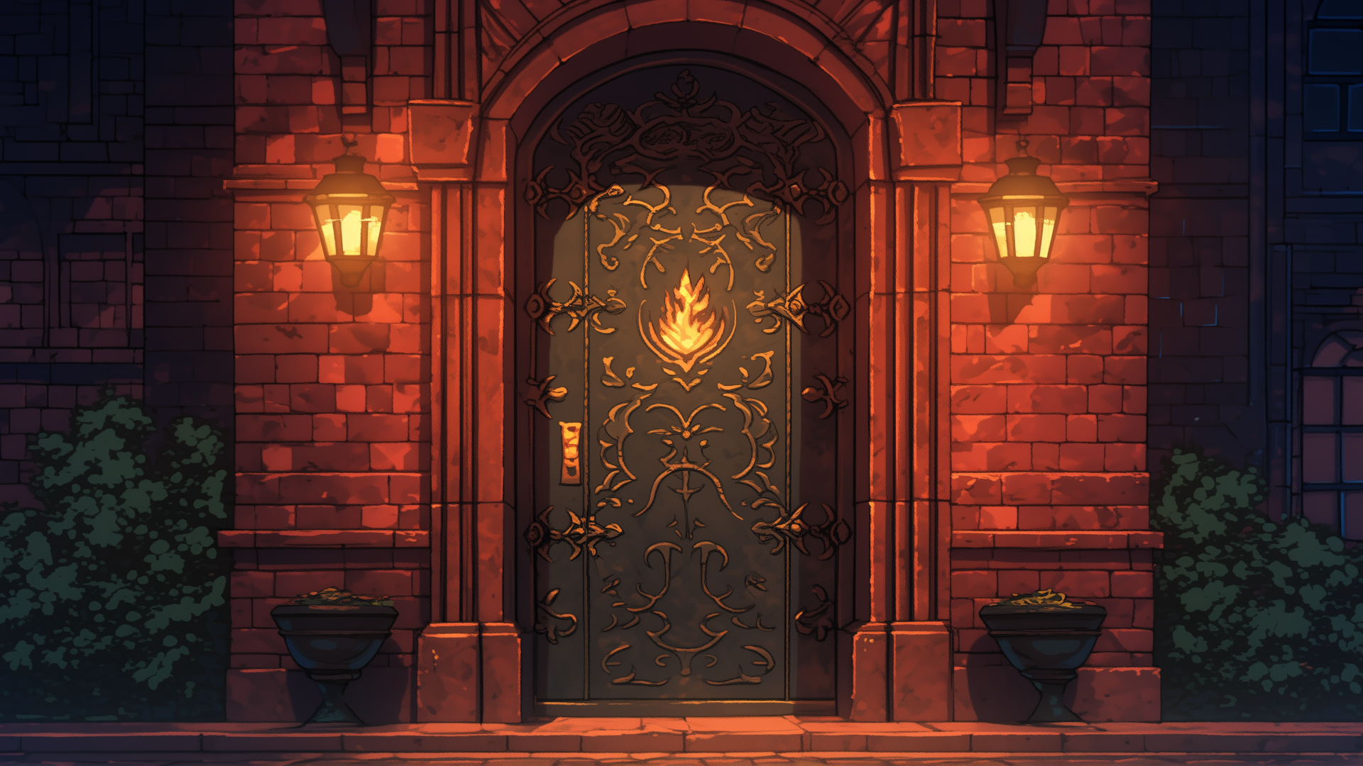 magic-school, dormitory, fire-element, entrance, night