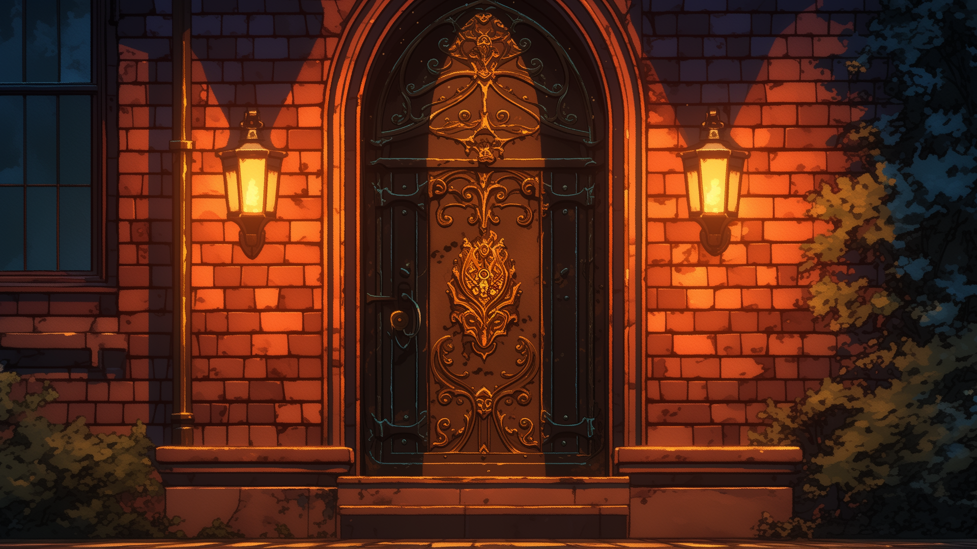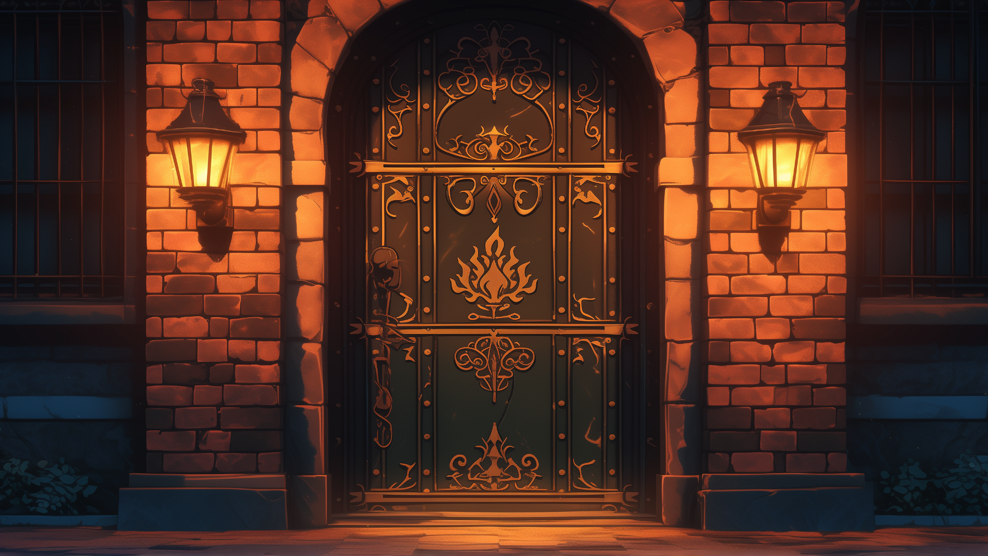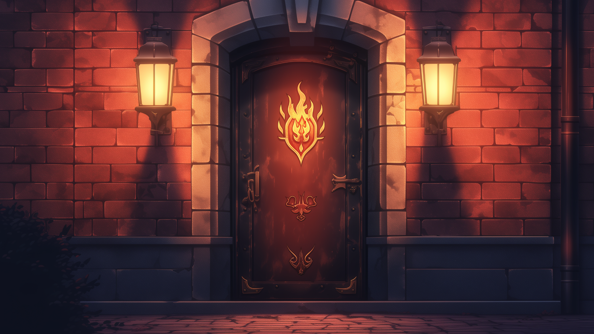 magic-school, dormitory, fire-element, entrance, night