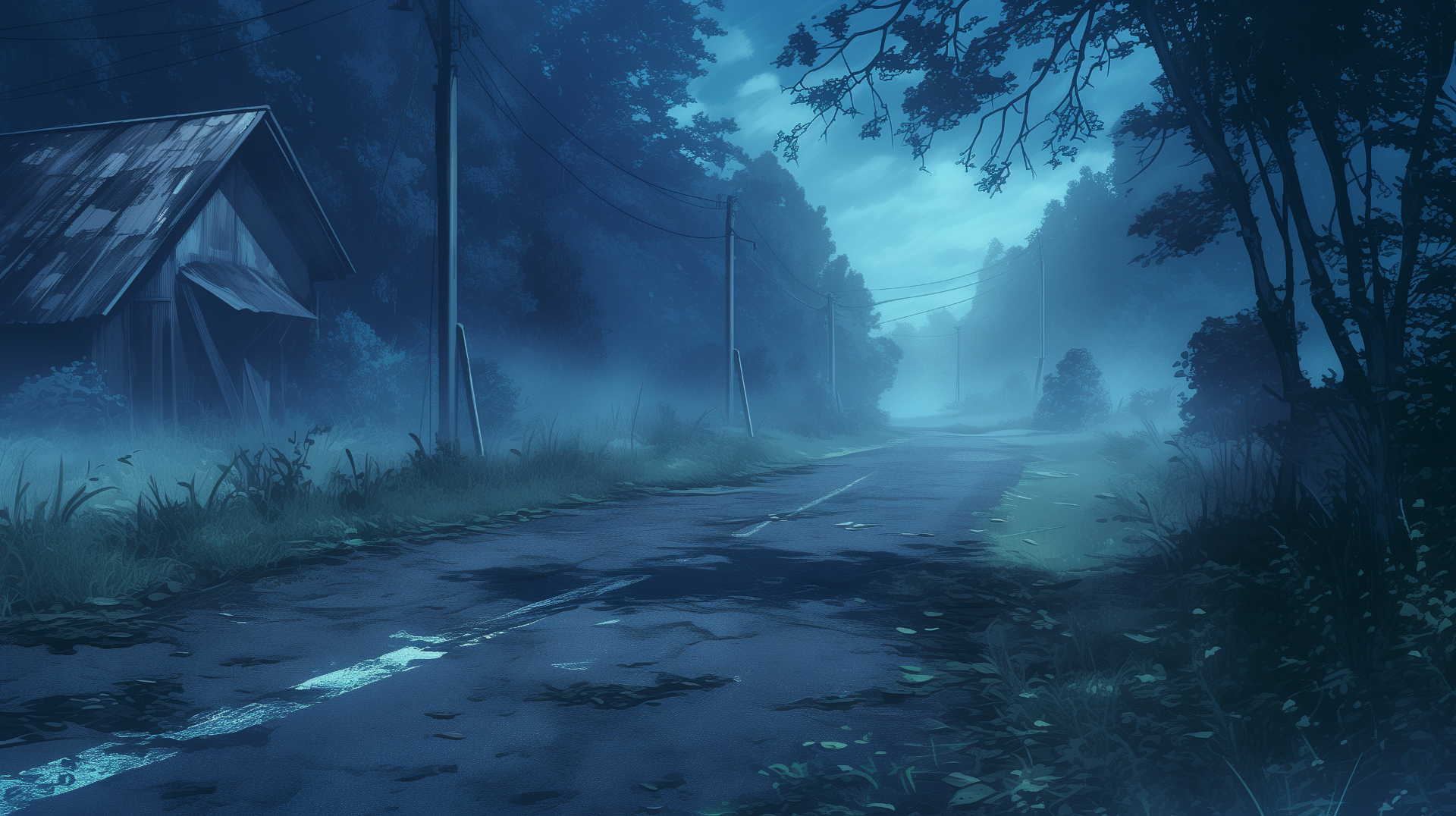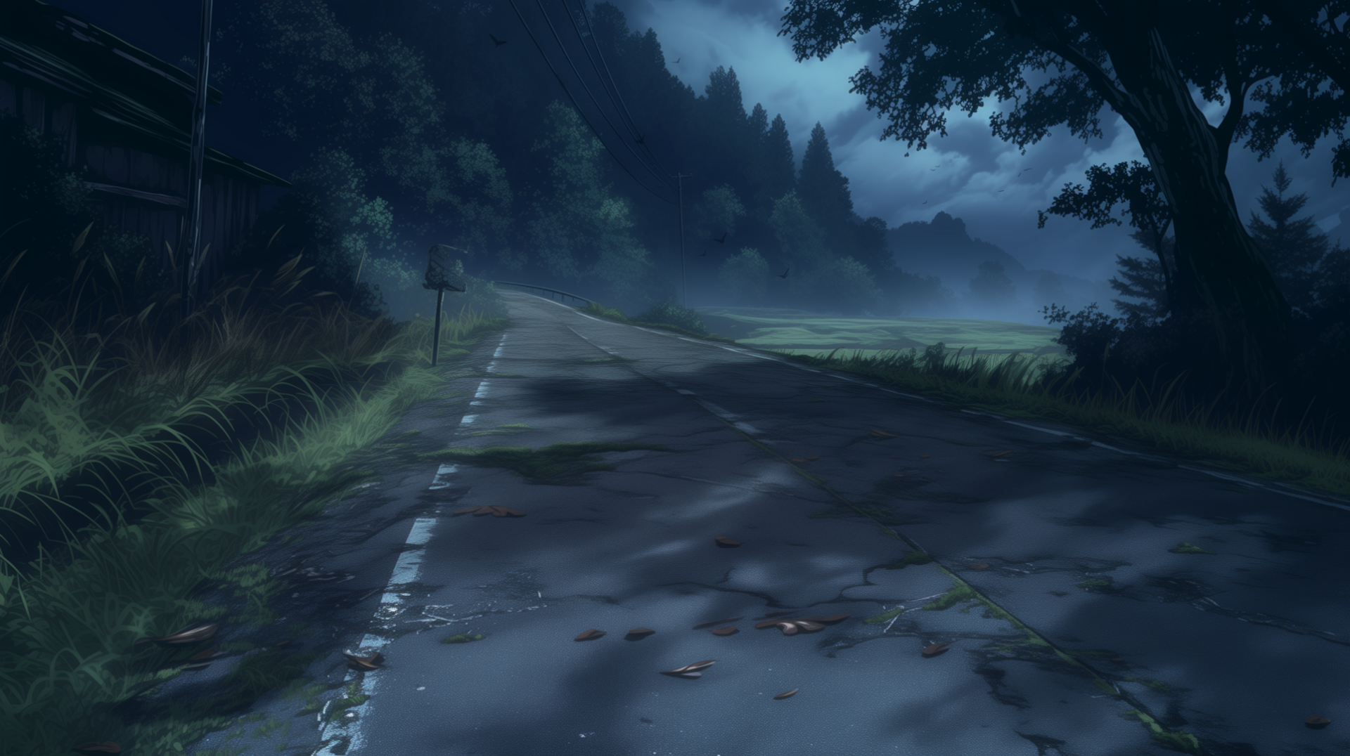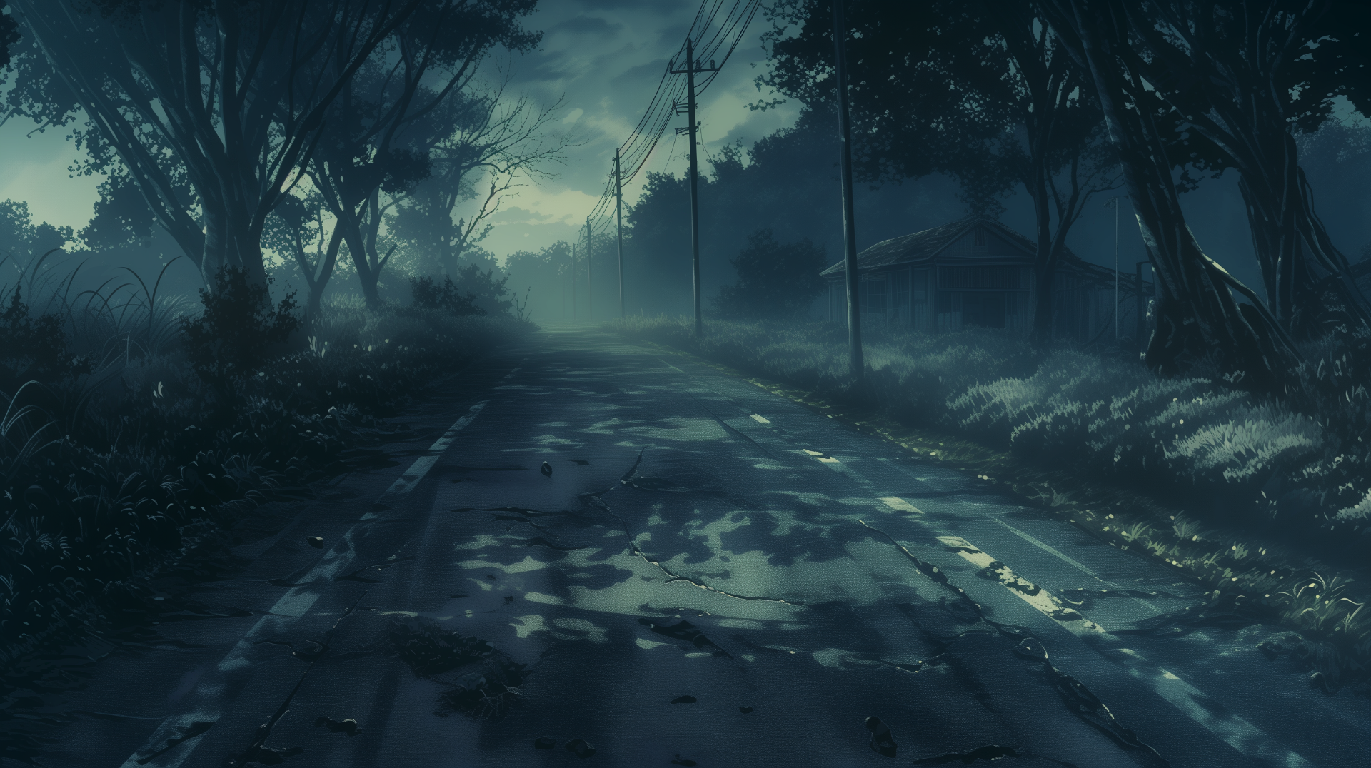 廃村へ続く山中の一本道を描いた、不気味な雰囲気のフリー背景素材です。