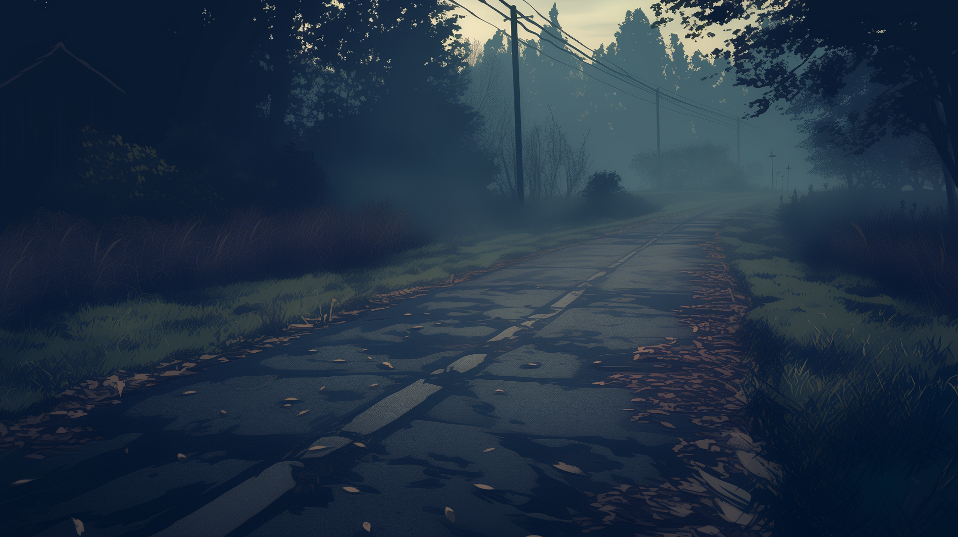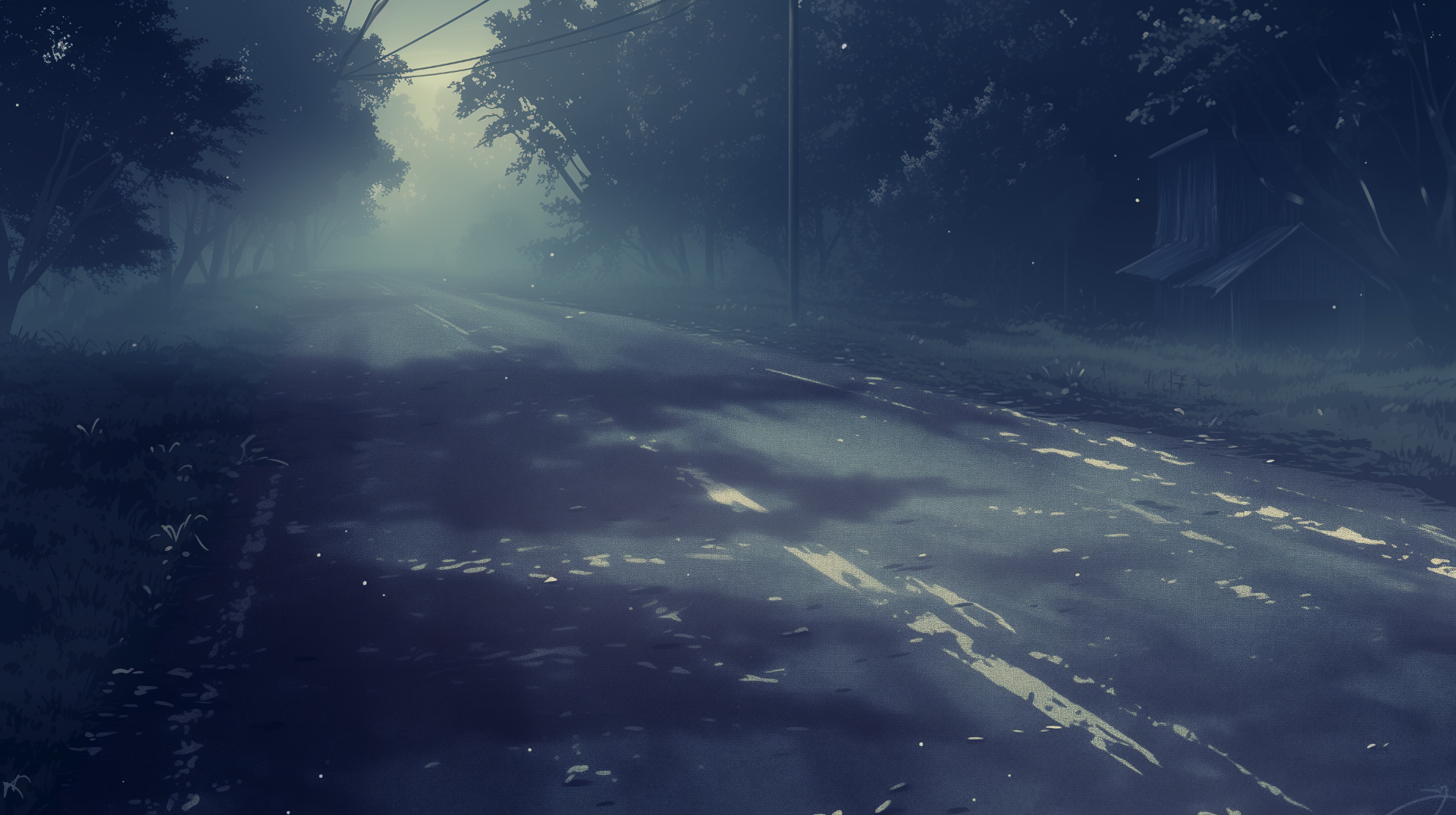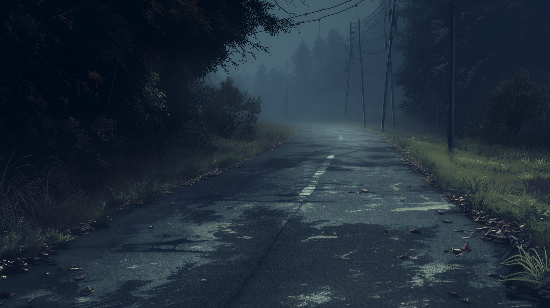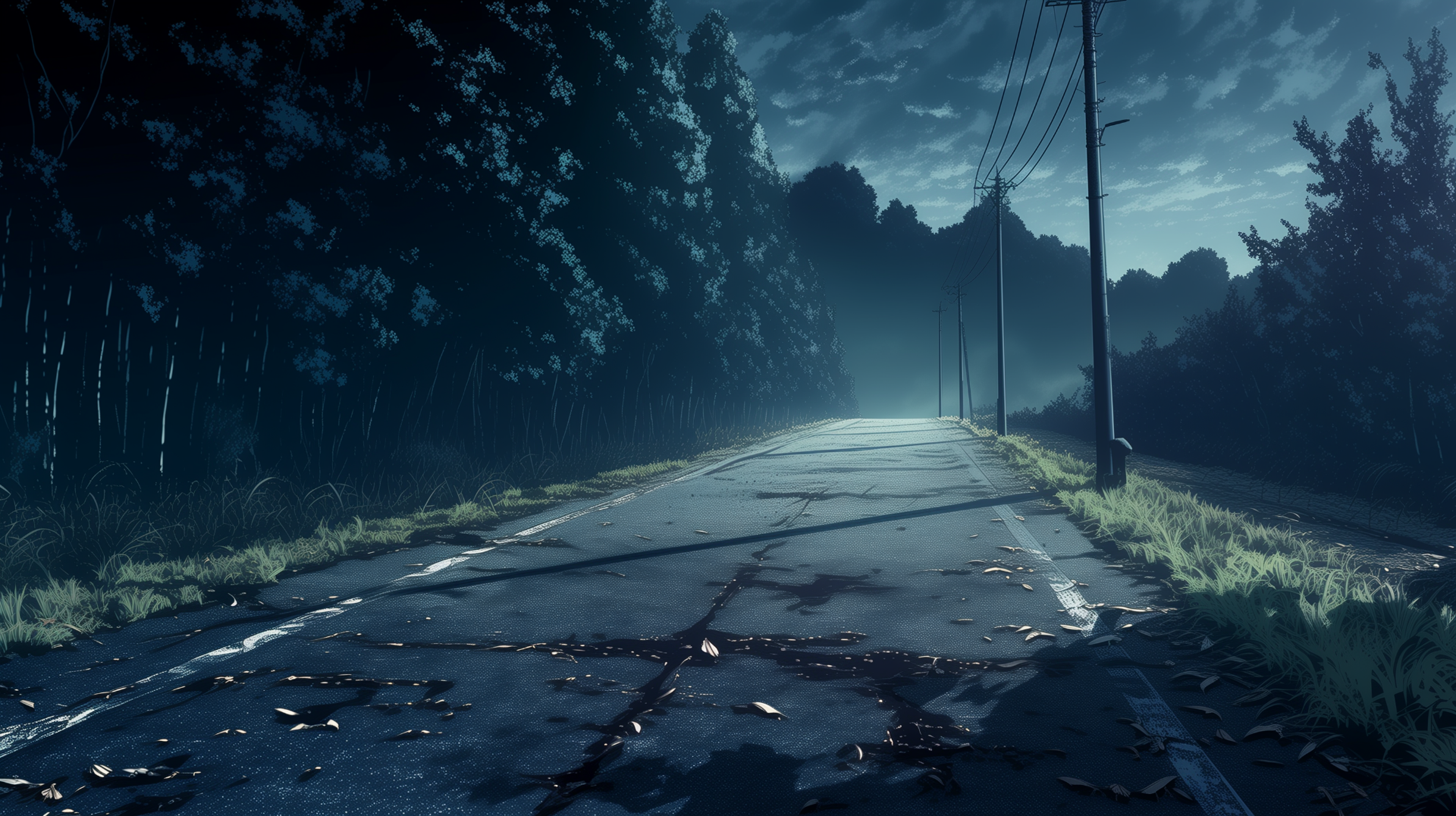廃村へ続く山中の一本道を描いた、不気味な雰囲気のフリー背景素材です。