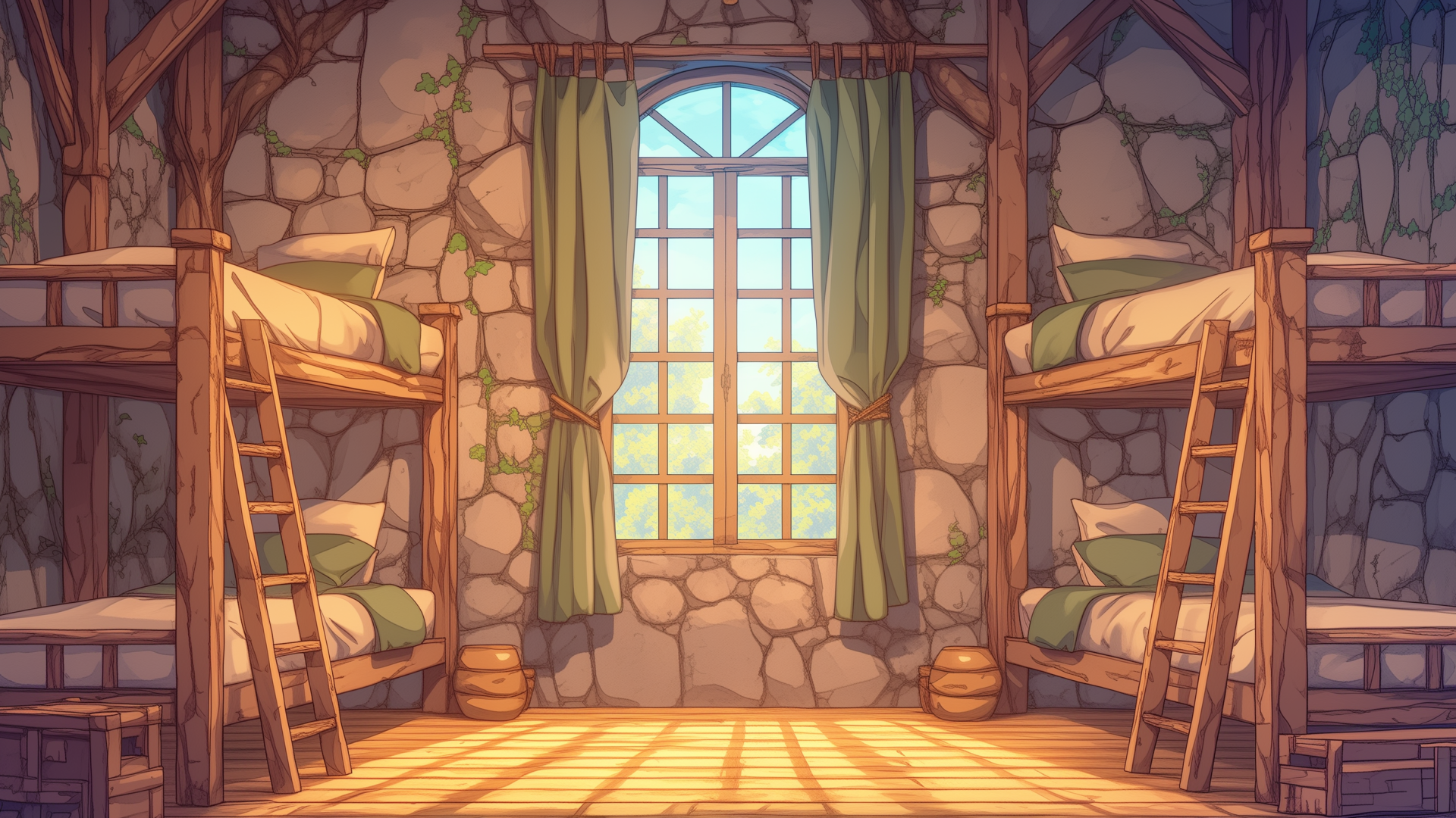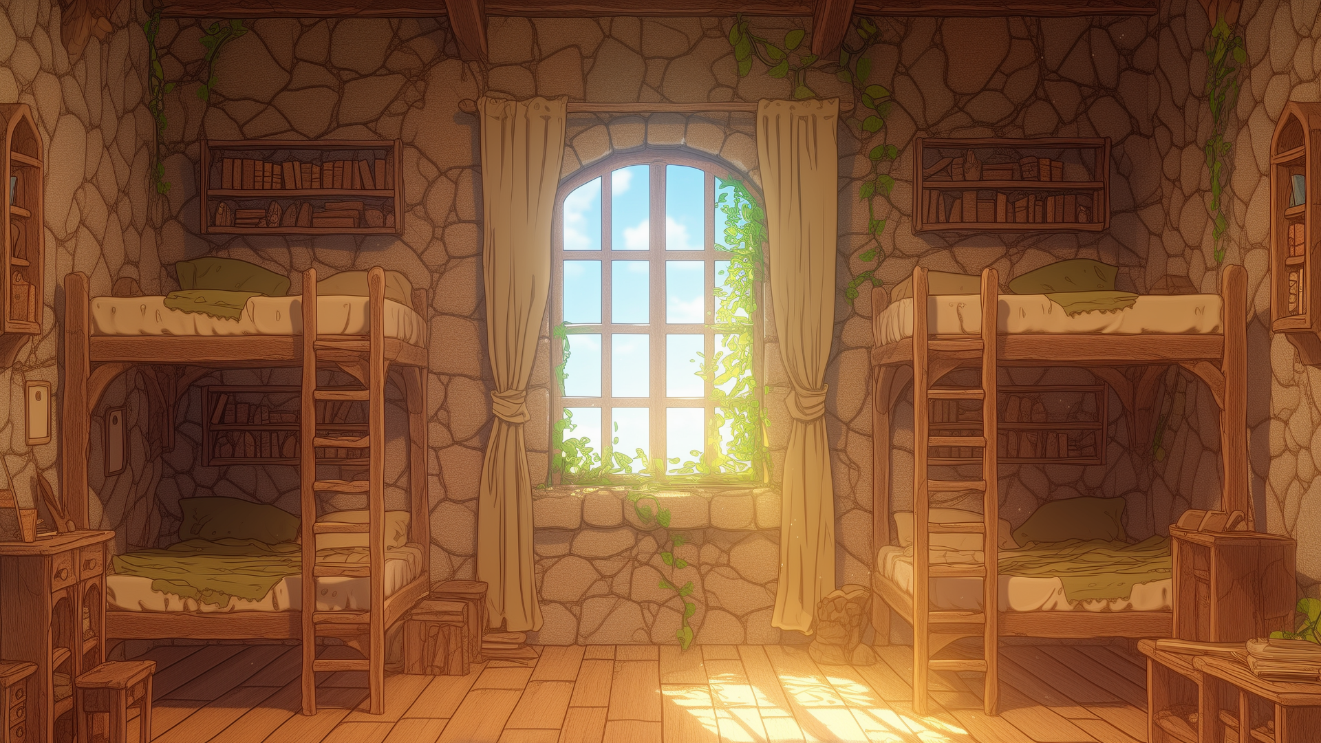 重厚な石壁と木製家具に囲まれた、自然光あふれる学寮風の部屋。差し込む光と影が印象的で、部屋の静けさと安心感を演出。中世ファンタジーや田舎の寄宿舎を舞台にしたTRPGシナリオにぴったりのフリー背景素材。