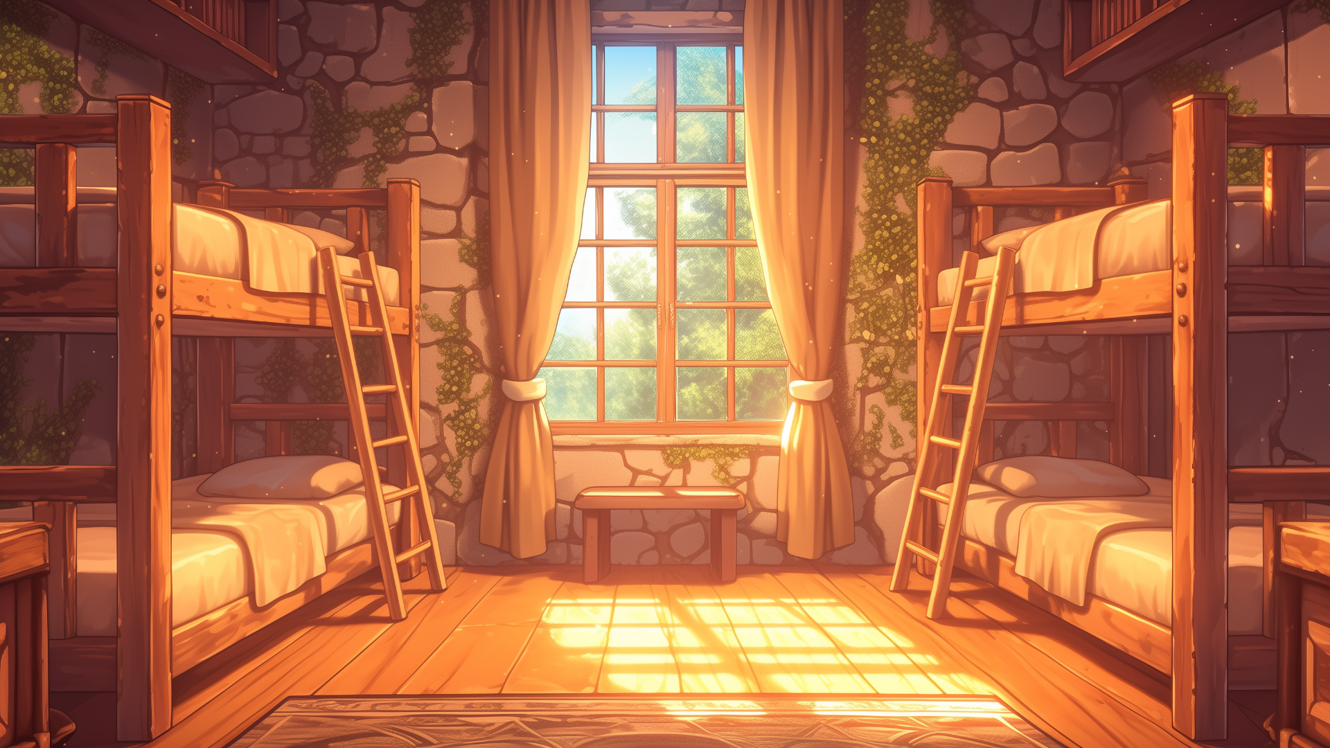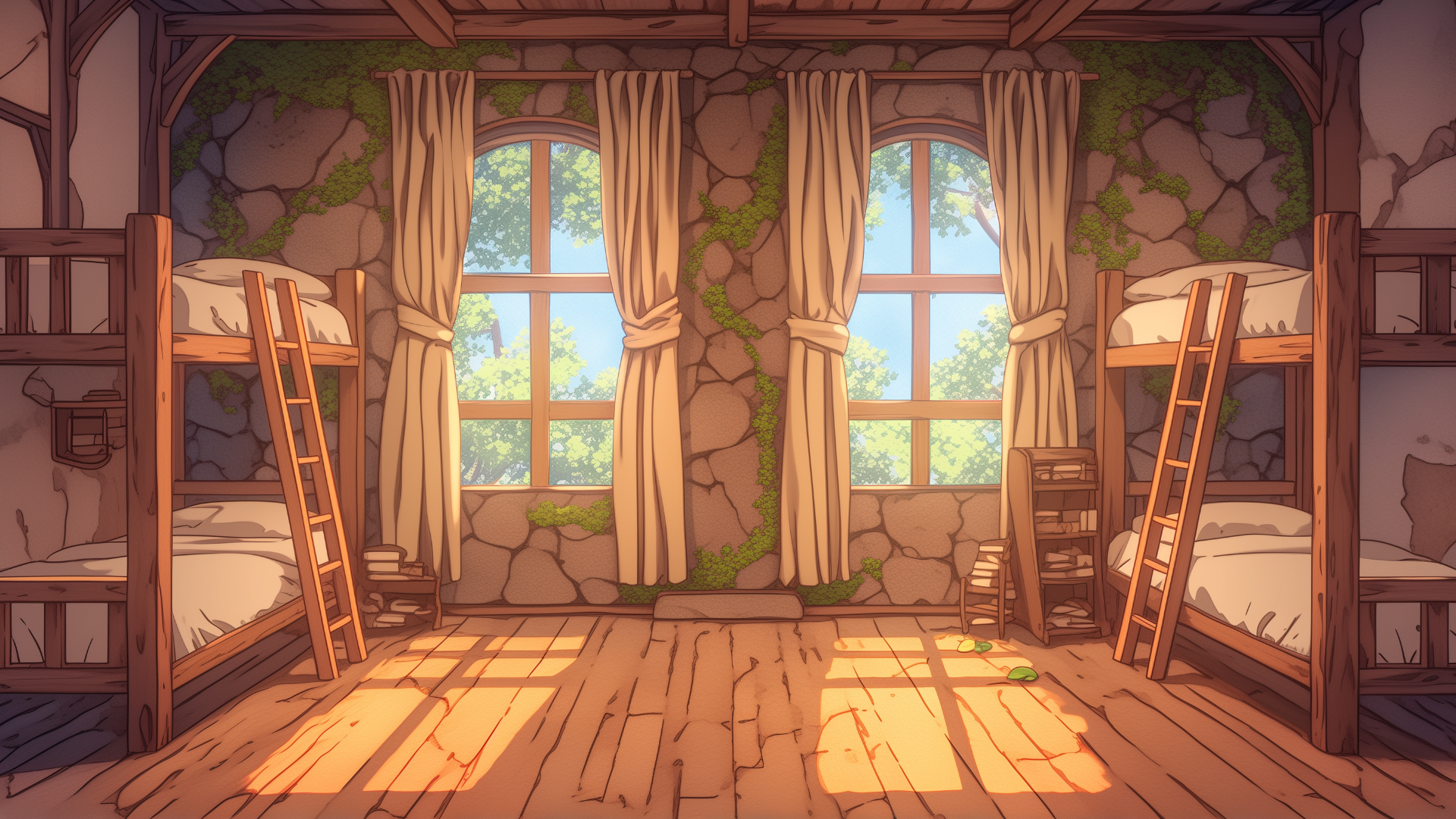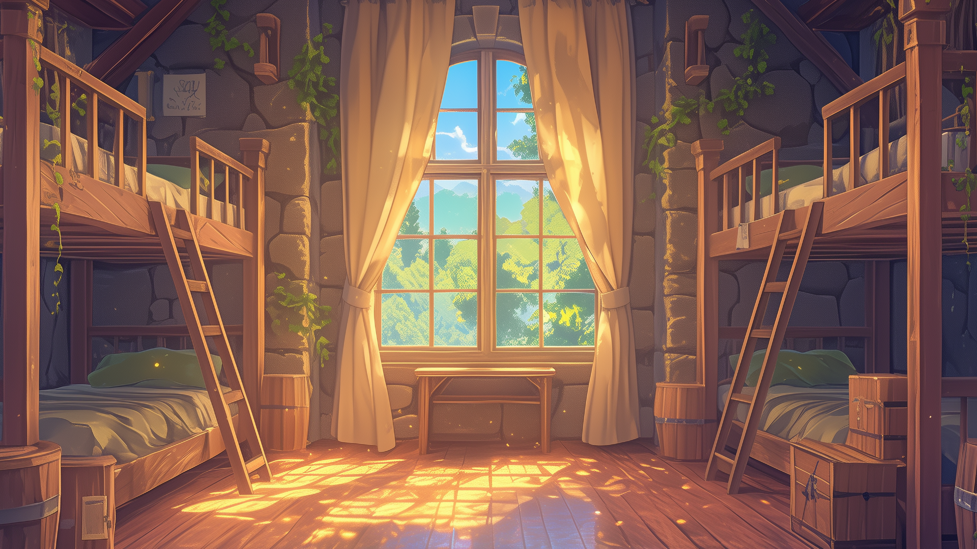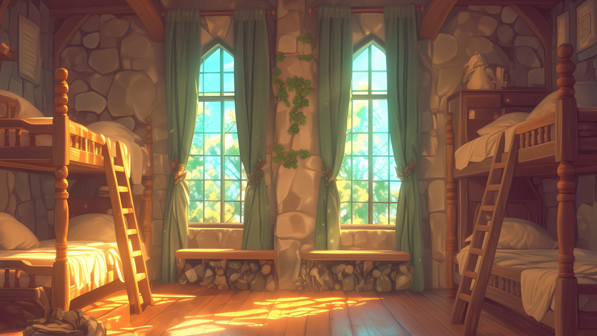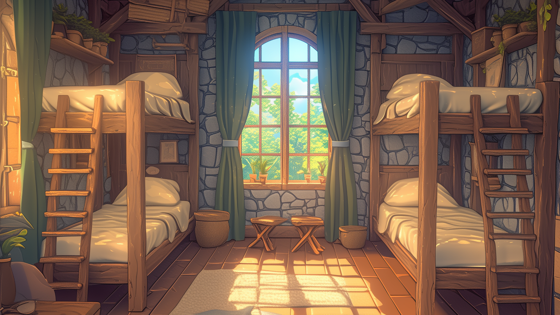 植物が飾られた窓辺と自然の光に満ちた木のぬくもりを感じる寮の4人部屋。素朴な調度品が揃い、居心地のよさを感じさせる空間。田舎の魔法学校や自然信仰の冒険者の拠点に合うTRPGシナリオ用のフリー背景素材。