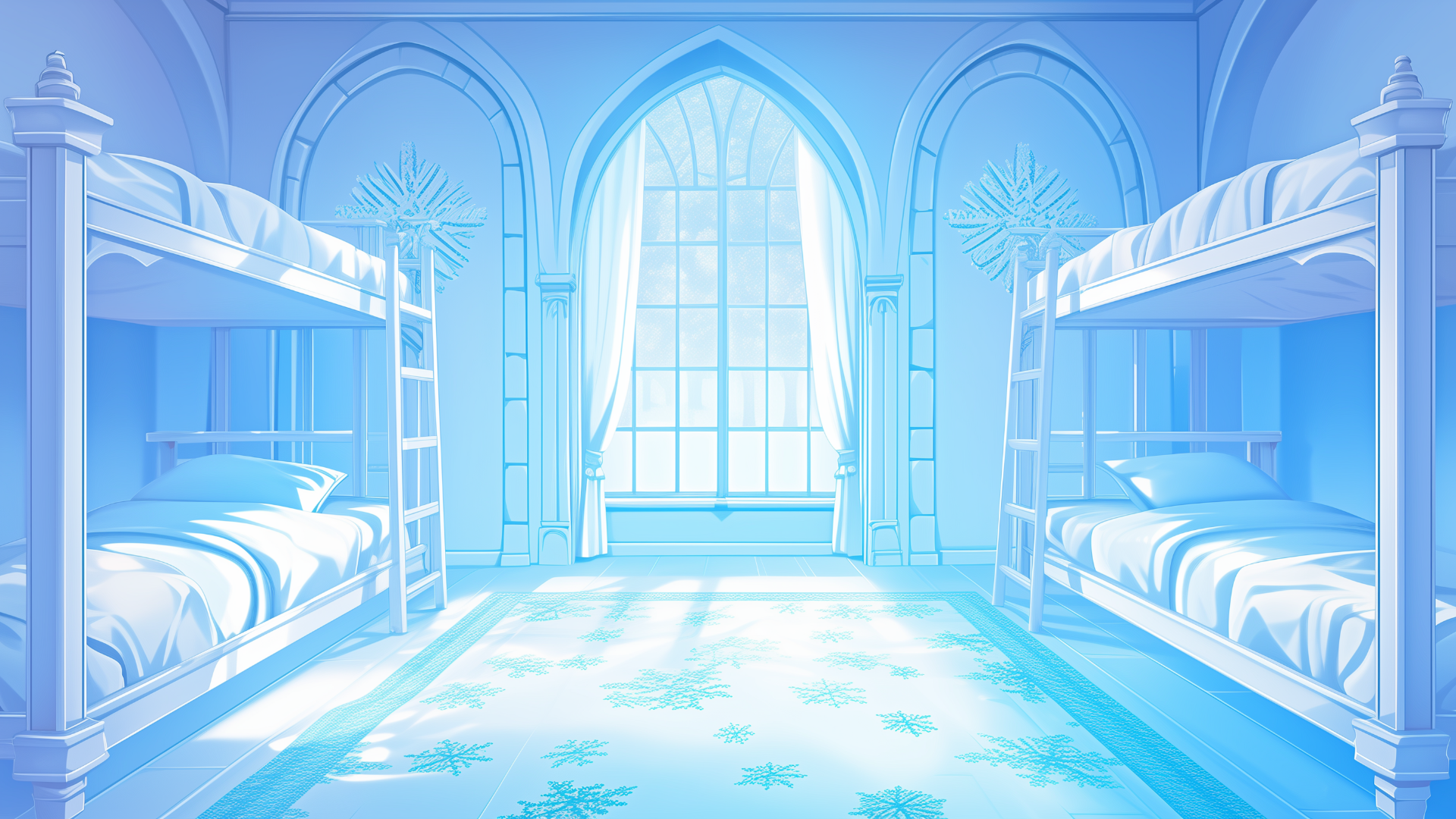 magic-school, dormitory, ice-element, four-person-room, bedroom, daytime