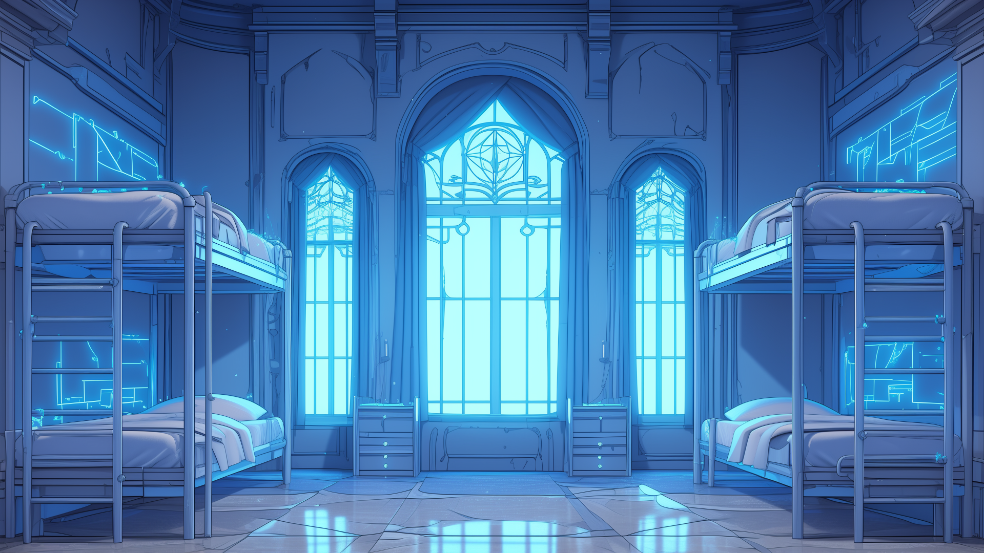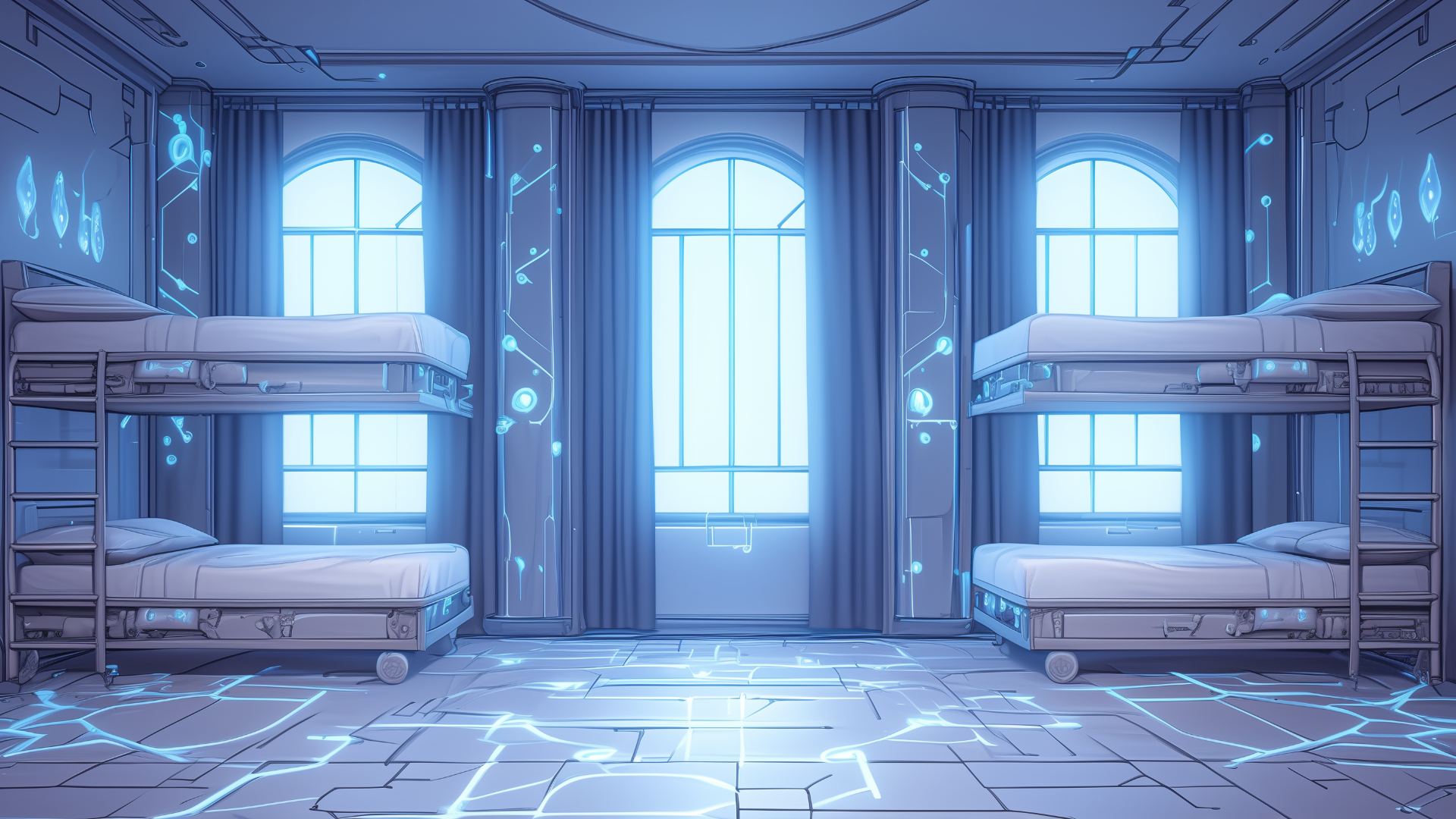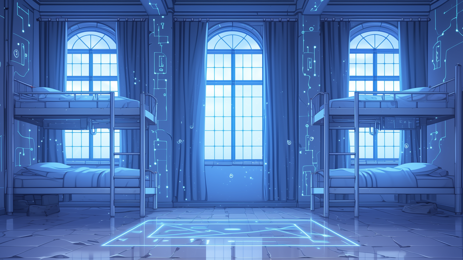 magic-school, dormitory, lightning-element, four-person-room, bedroom, daytime