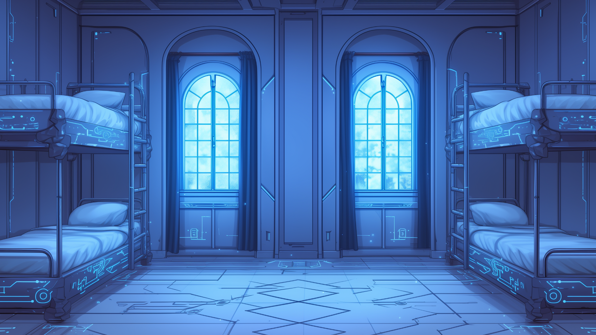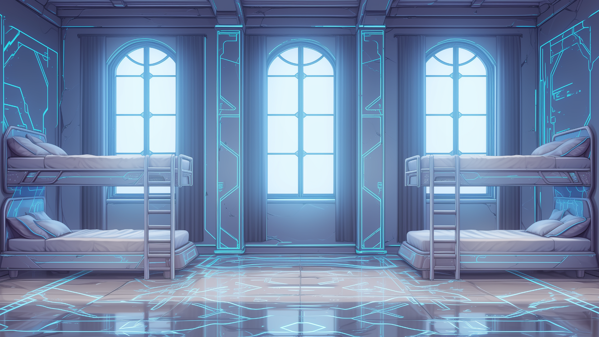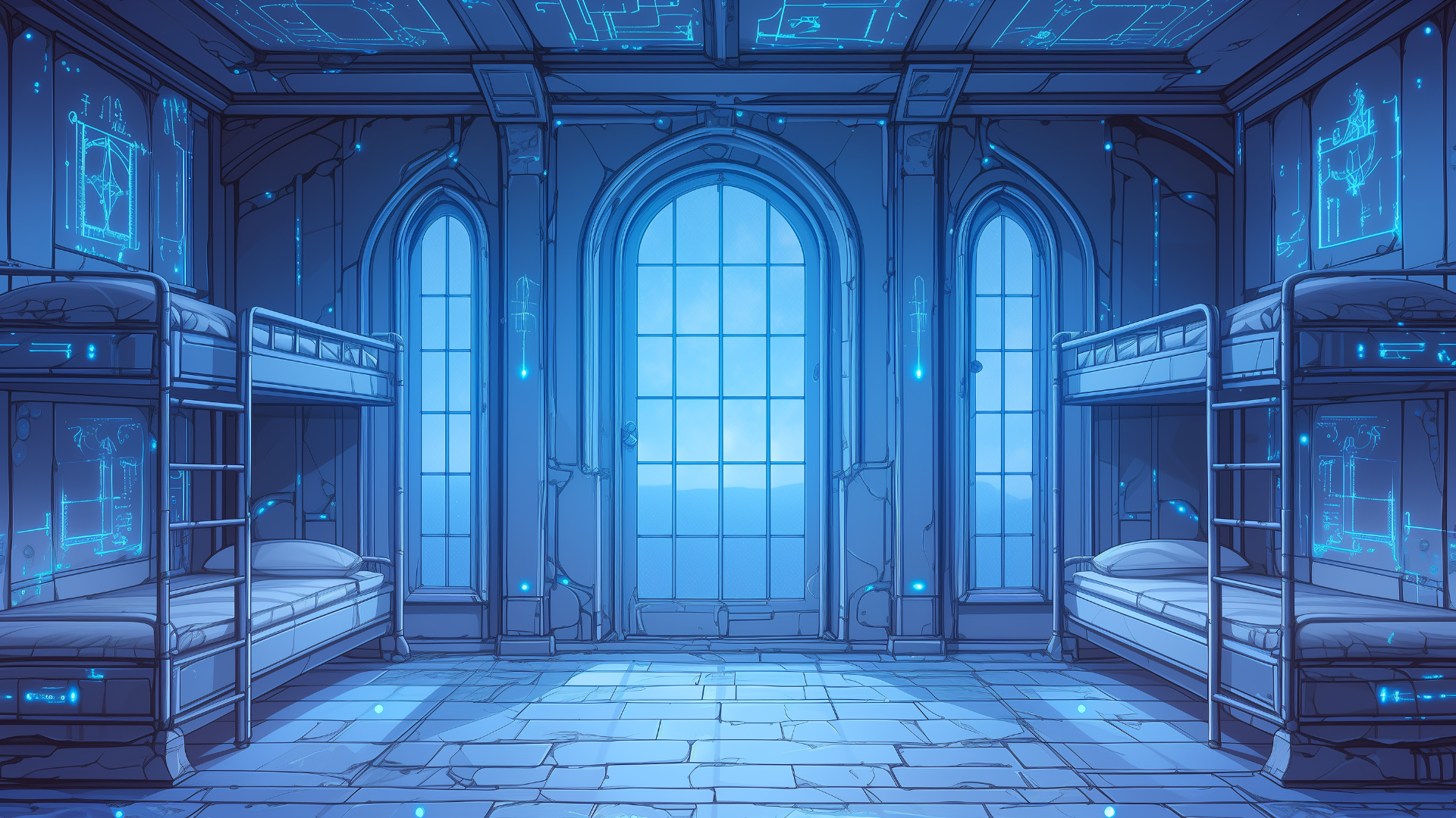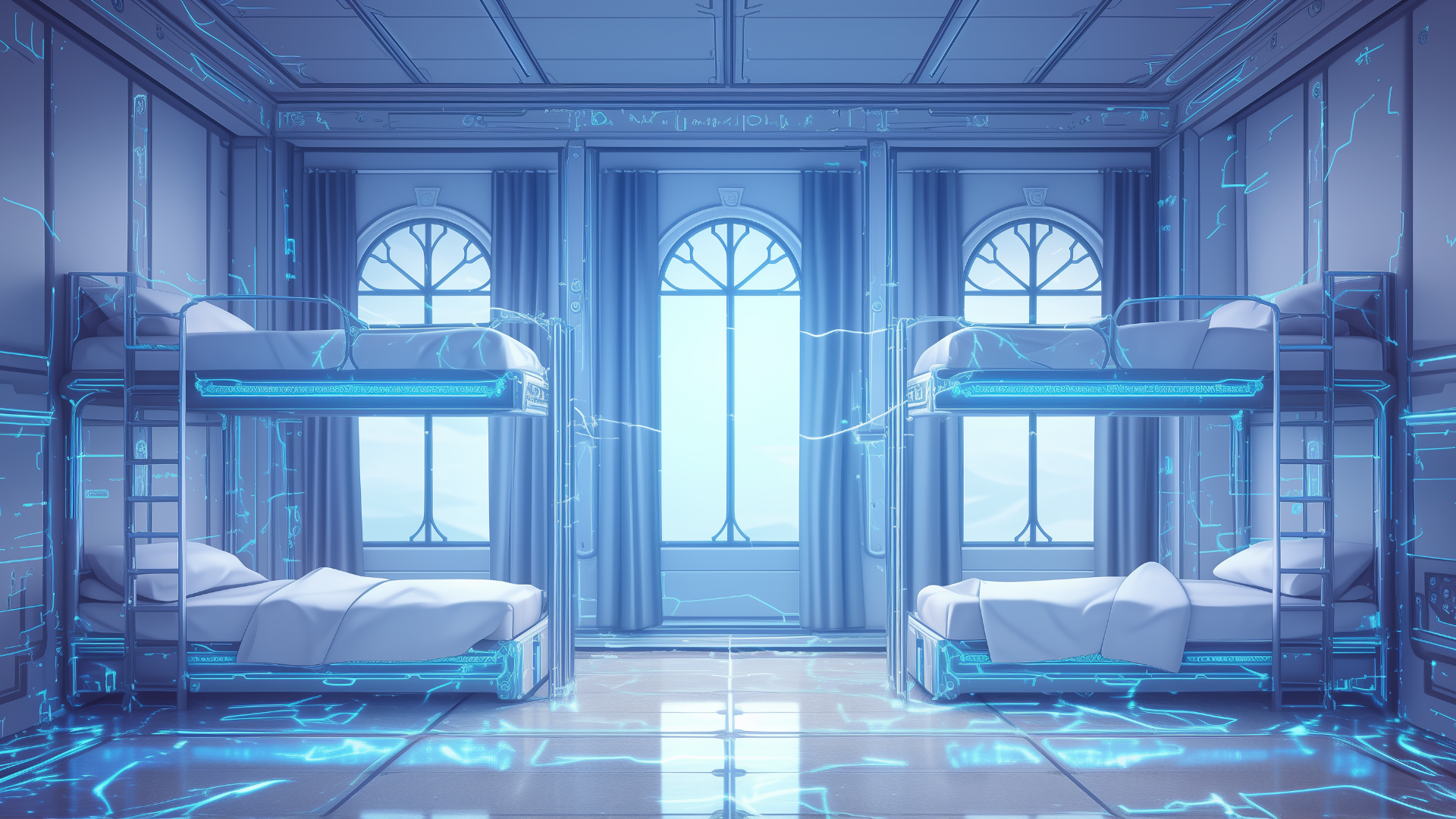 magic-school, dormitory, lightning-element, four-person-room, bedroom, daytime