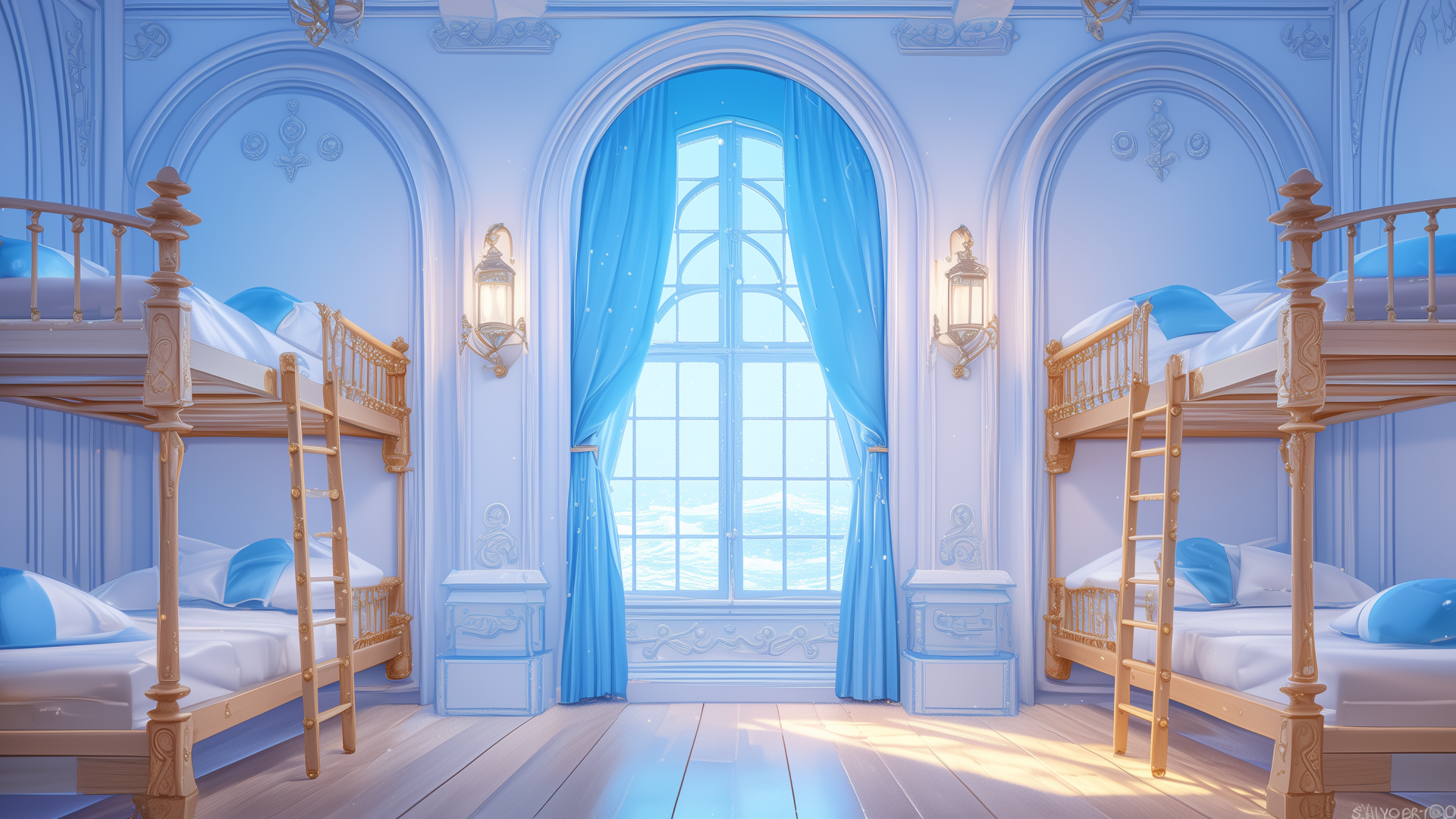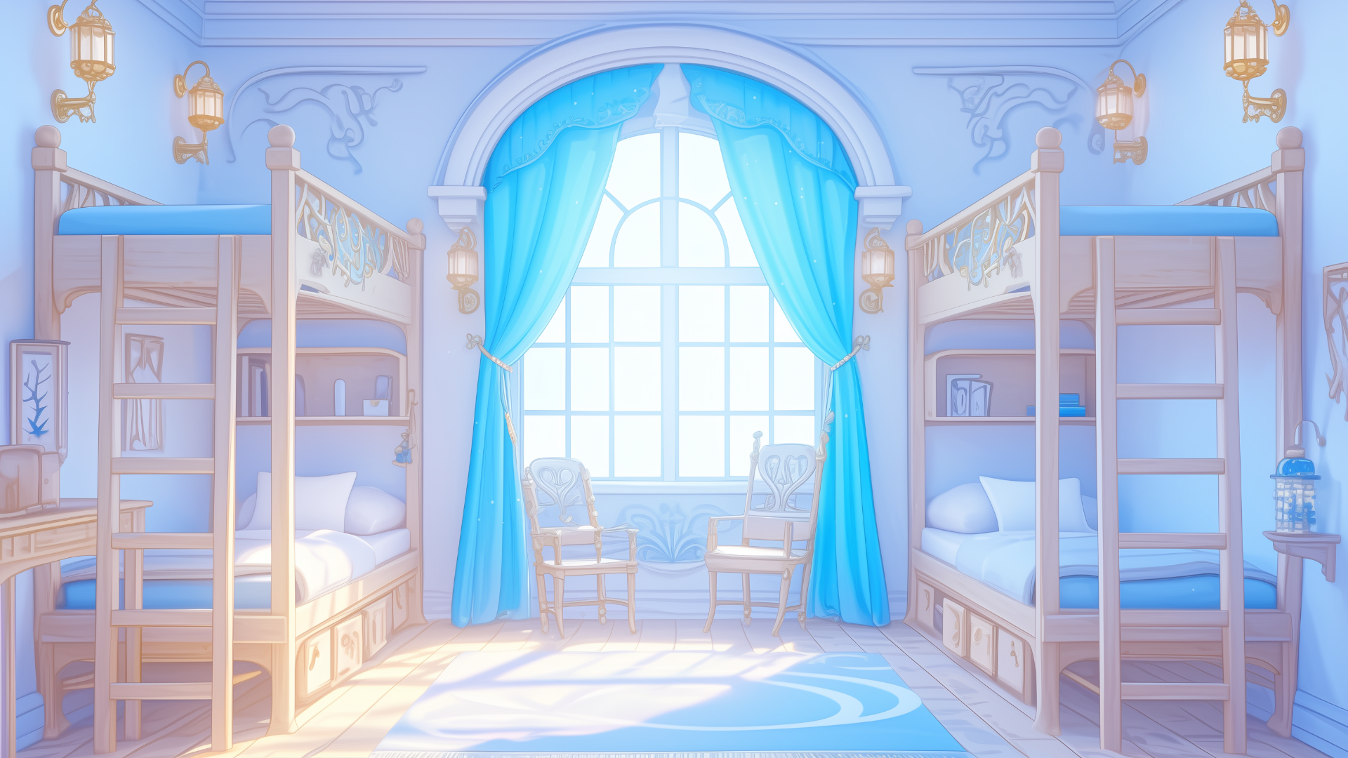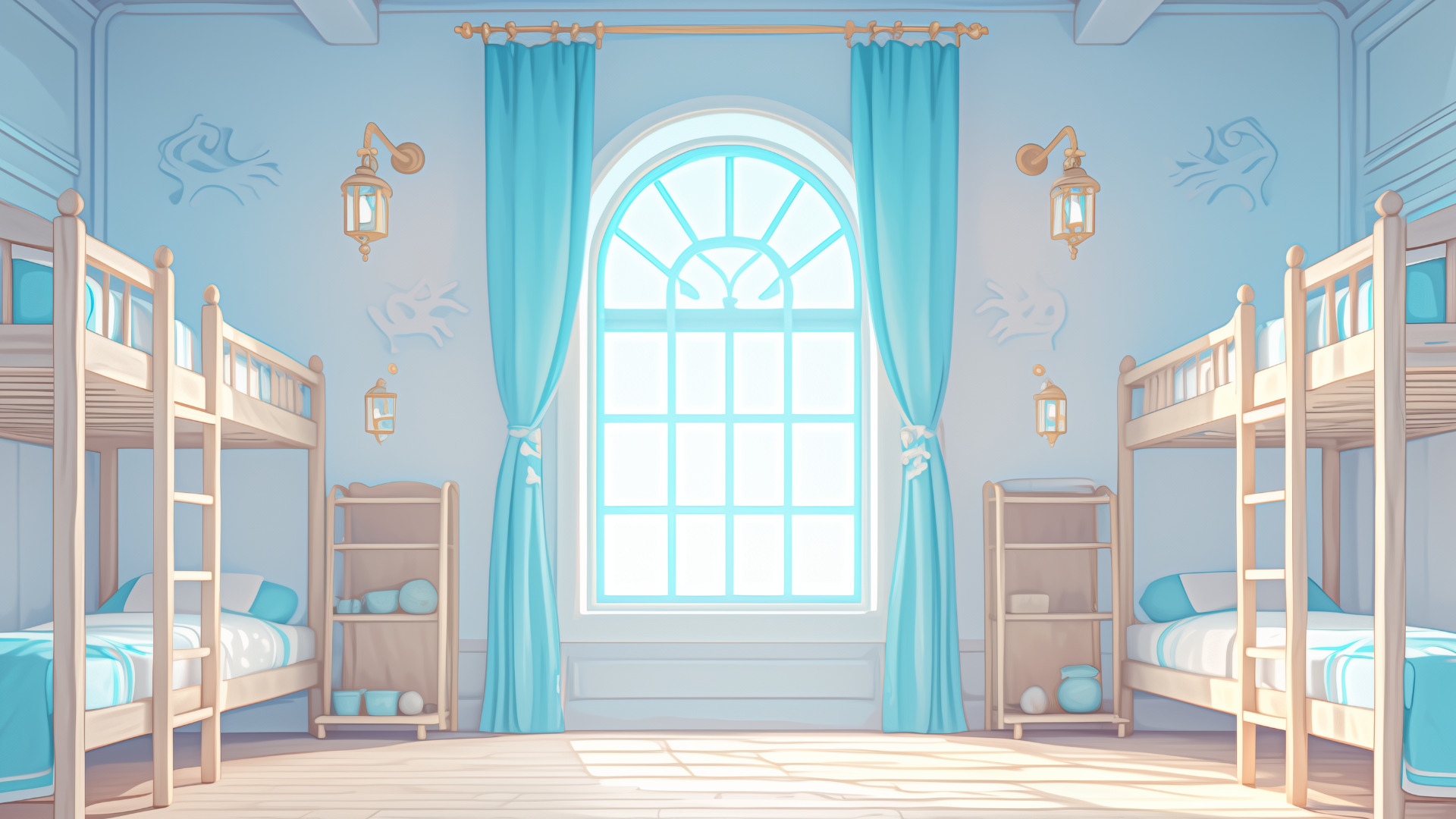 magic-school, dormitory, water-element, four-person-room, bedroom, daytime