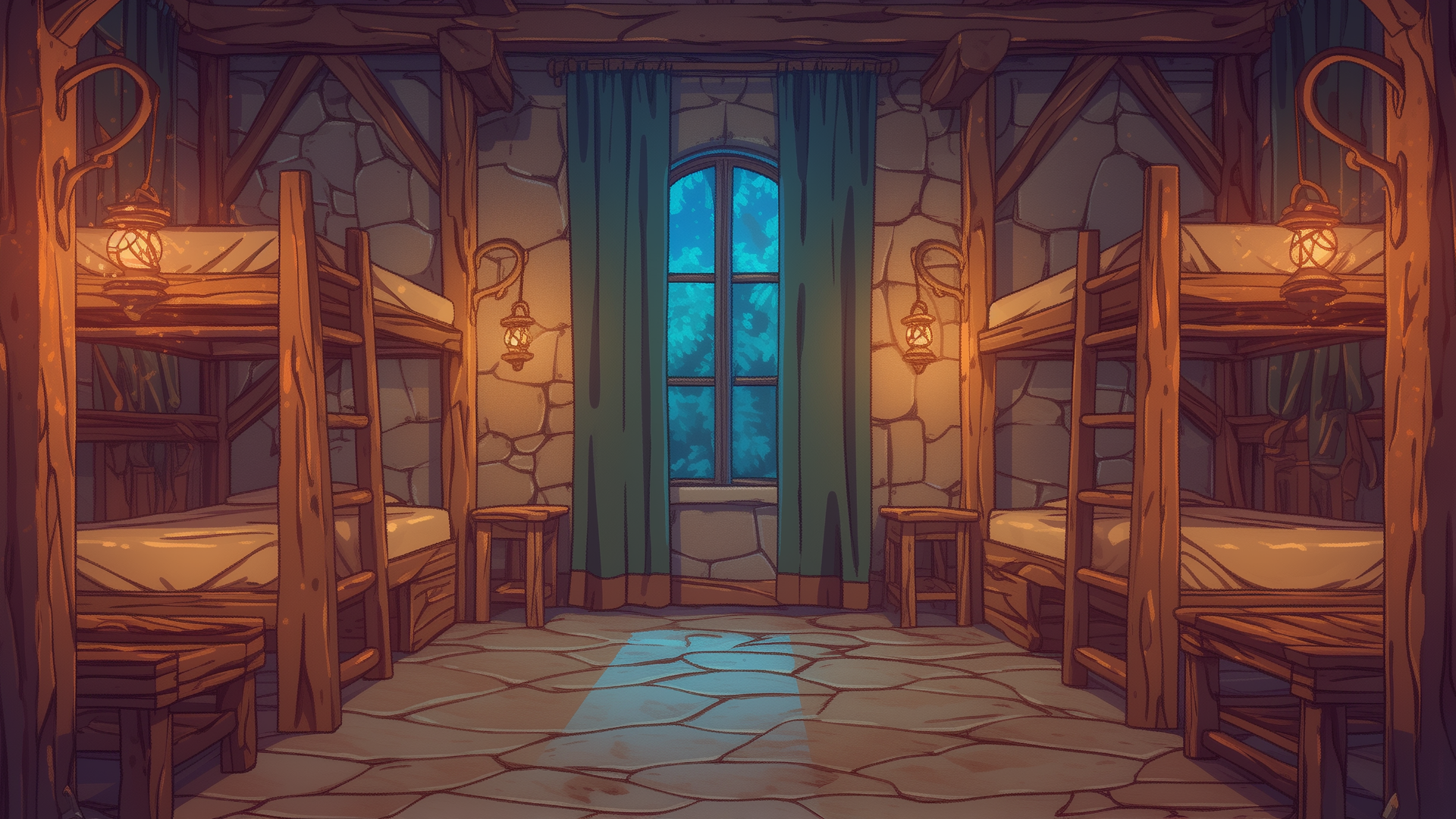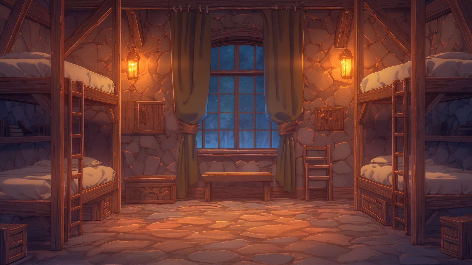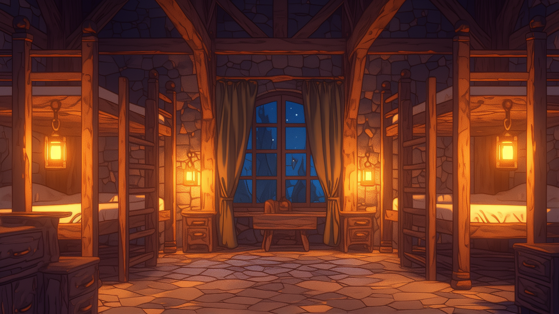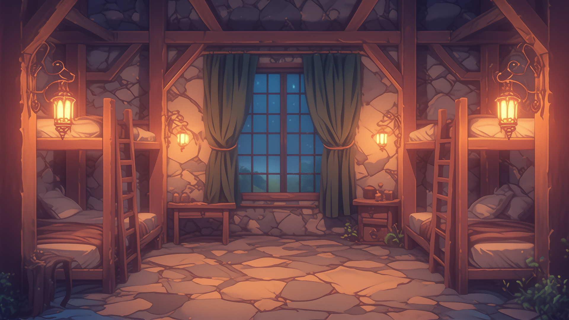 木と石に囲まれた自然派の宿舎のような構造が印象的な四人部屋。ランプの灯りが床や壁をやさしく照らし、静謐な空間を演出している。TRPGの田舎の学校や山奥の訓練所を舞台にした物語に最適なフリー背景素材。