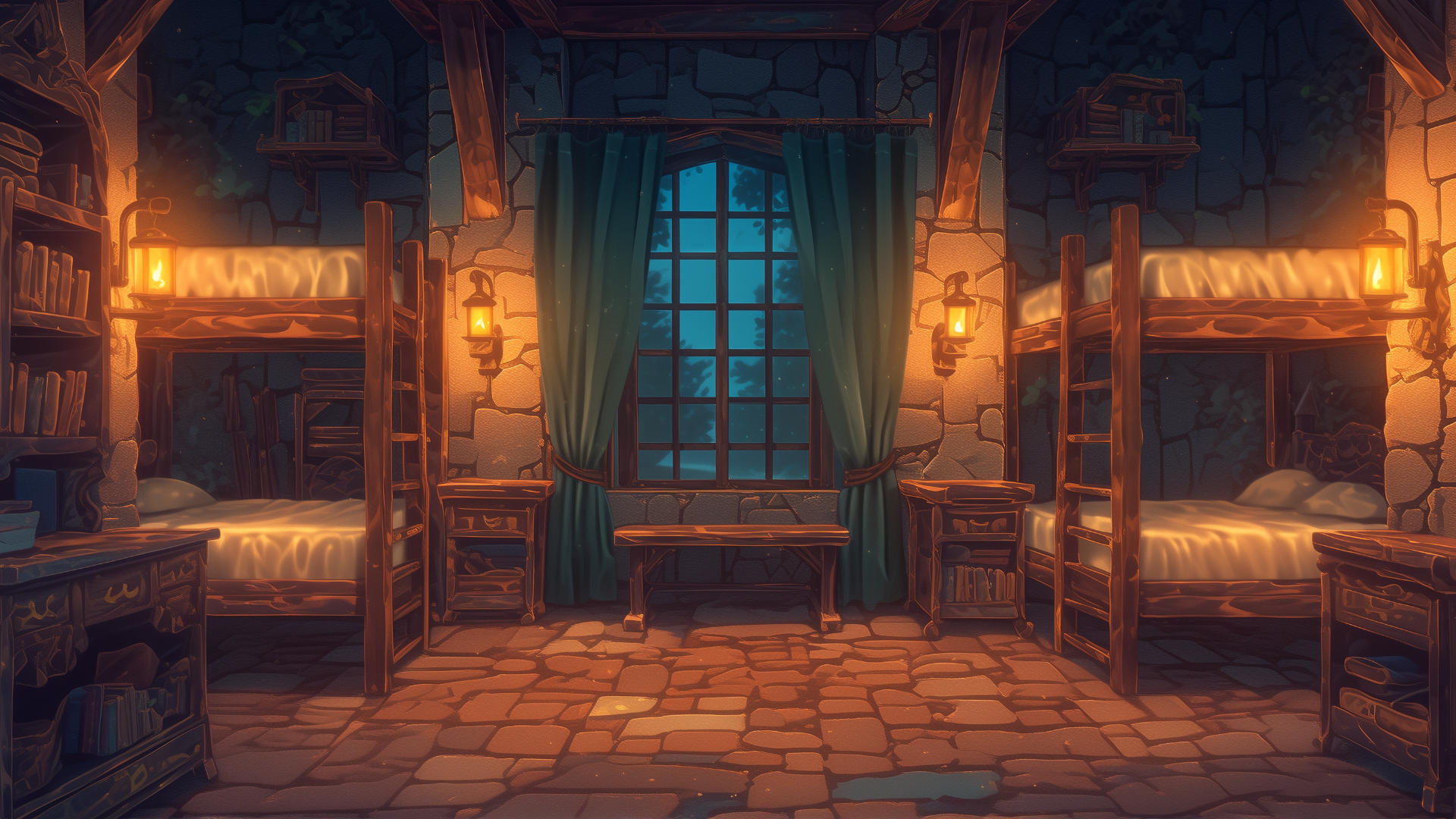 magic-school, dormitory, earth-element, four-person-room, bedroom, night