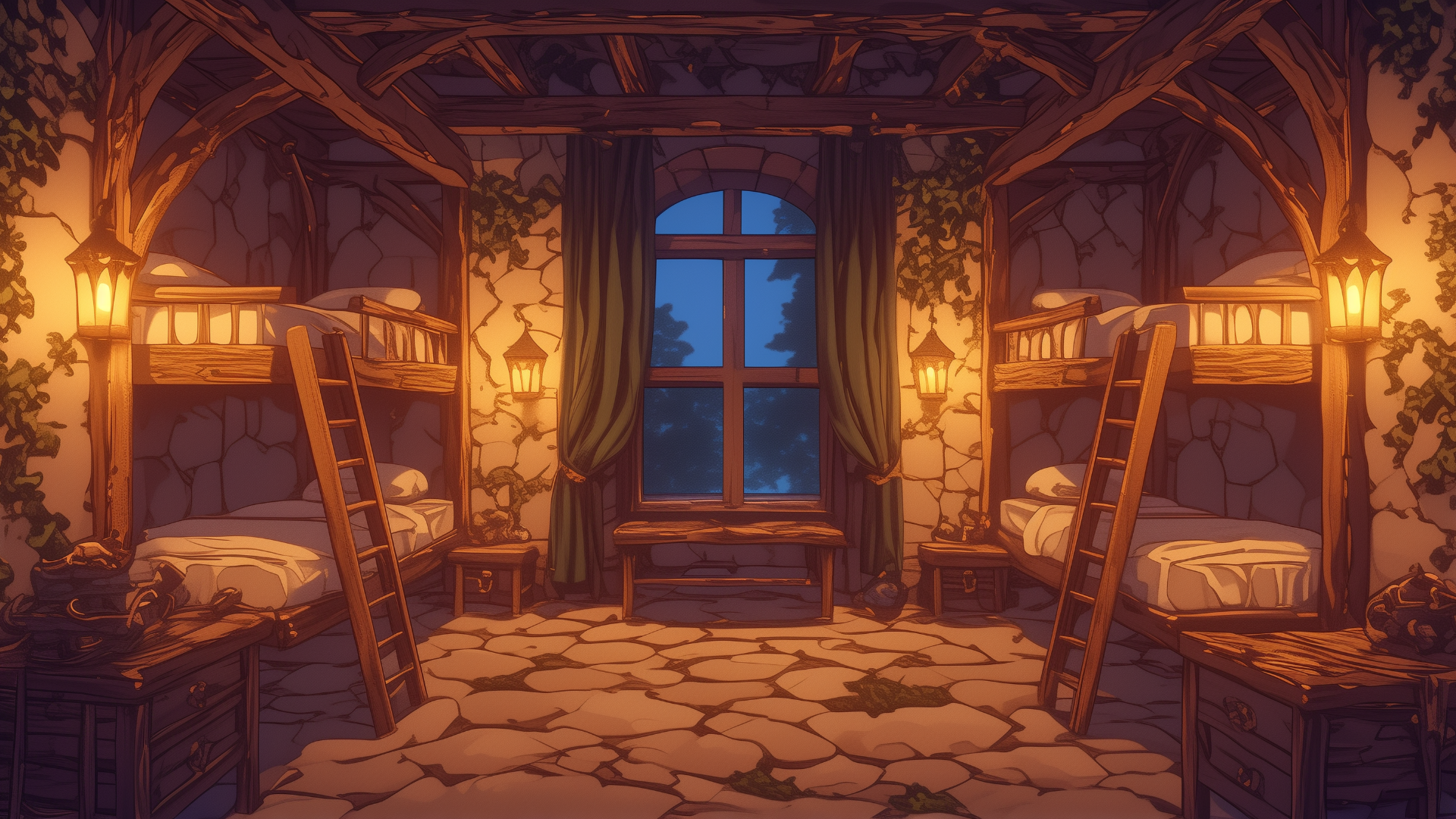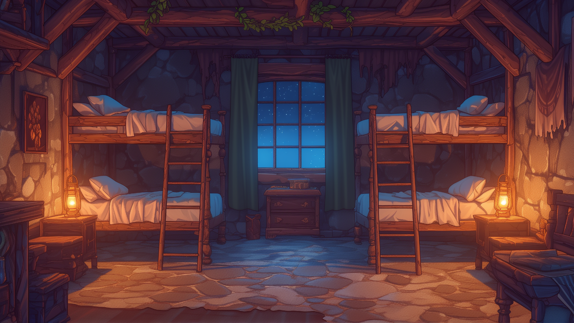 木材と石材が調和した、地属性らしい重厚な印象の四人部屋。カーテン越しに星空がのぞき、緑と土を思わせる配色で統一されている。自然信仰の学派や鉱山都市の学寮などを舞台にしたTRPGで活用できるフリー背景画像。