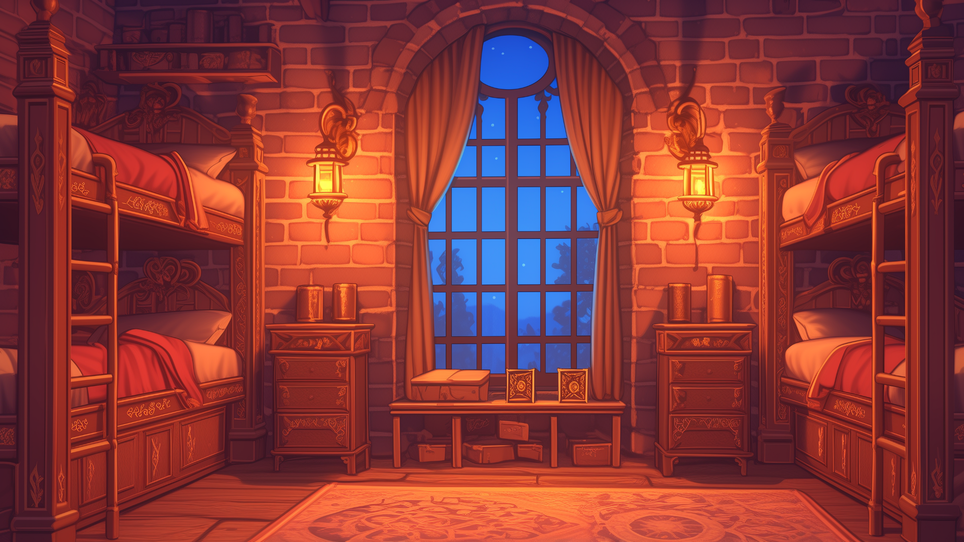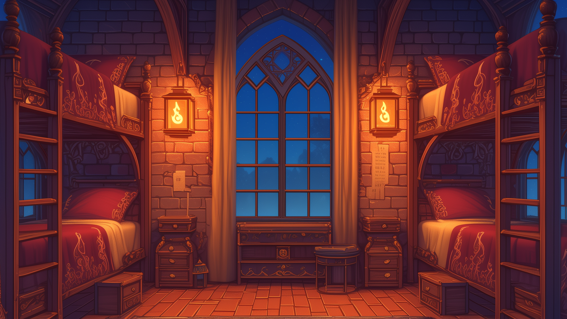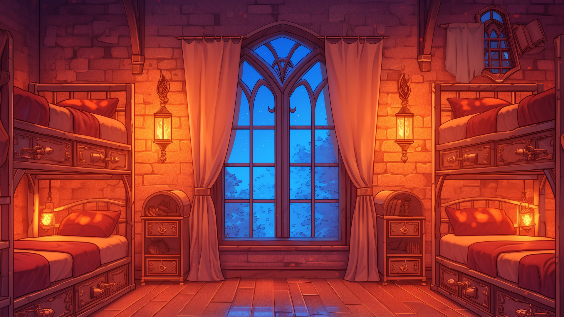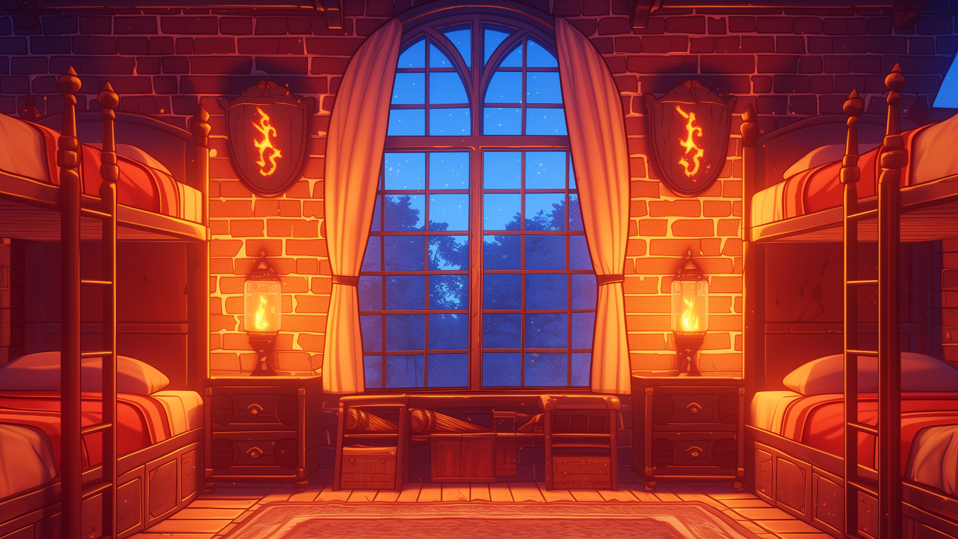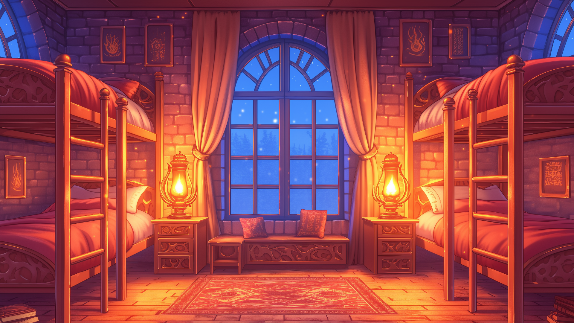 magic-school, dormitory, fire-element, four-person-room, bedroom, night