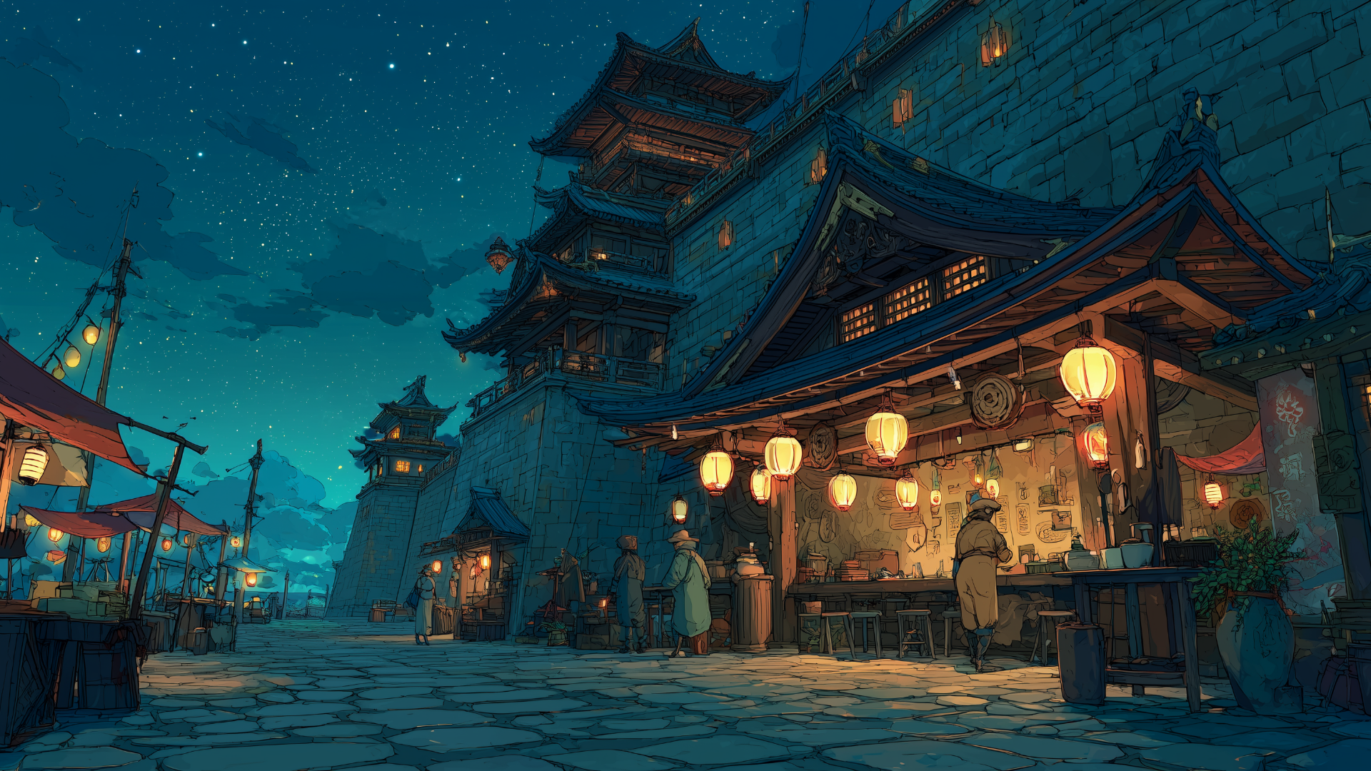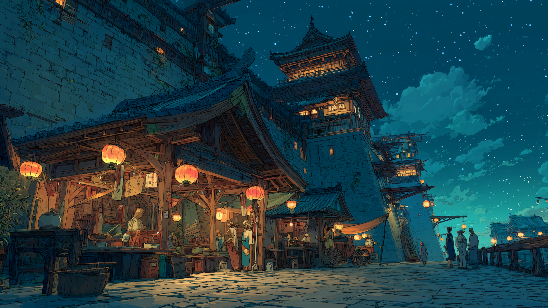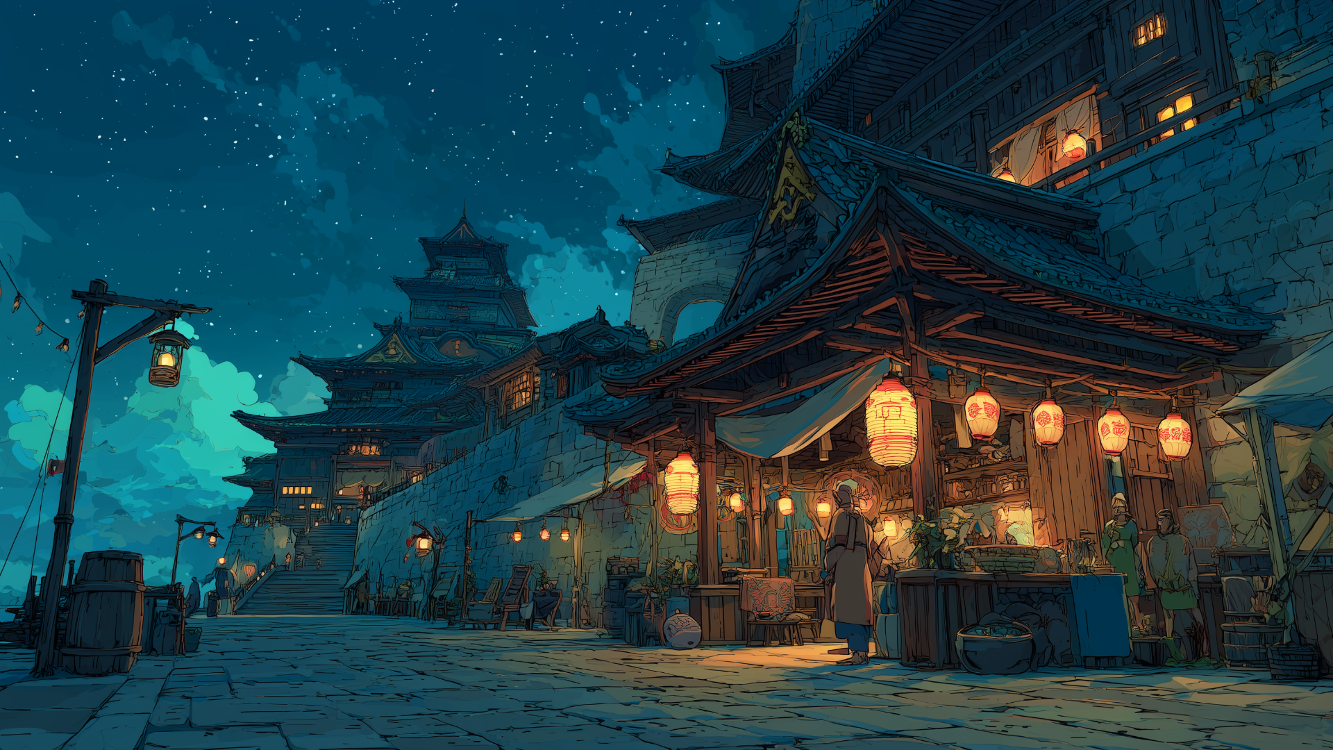 castle-town, night, marketplace, paper-lanterns, starry-sky