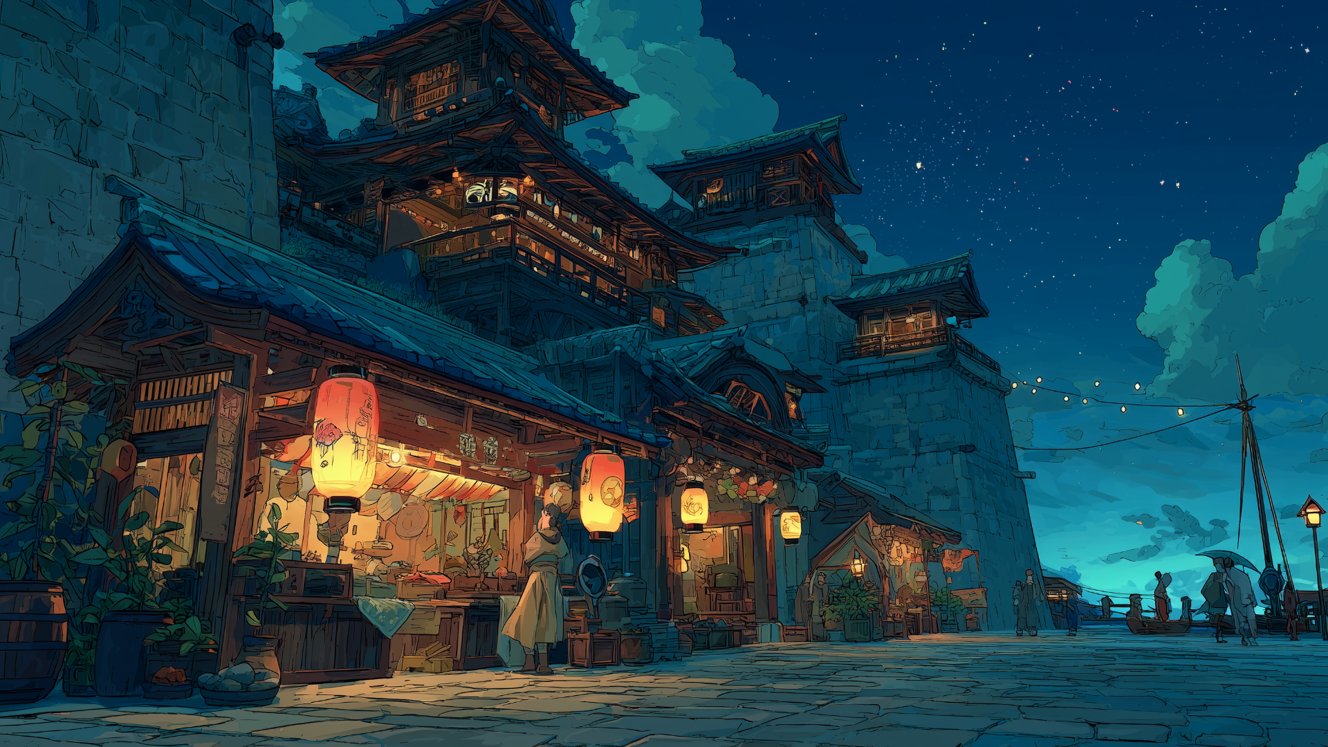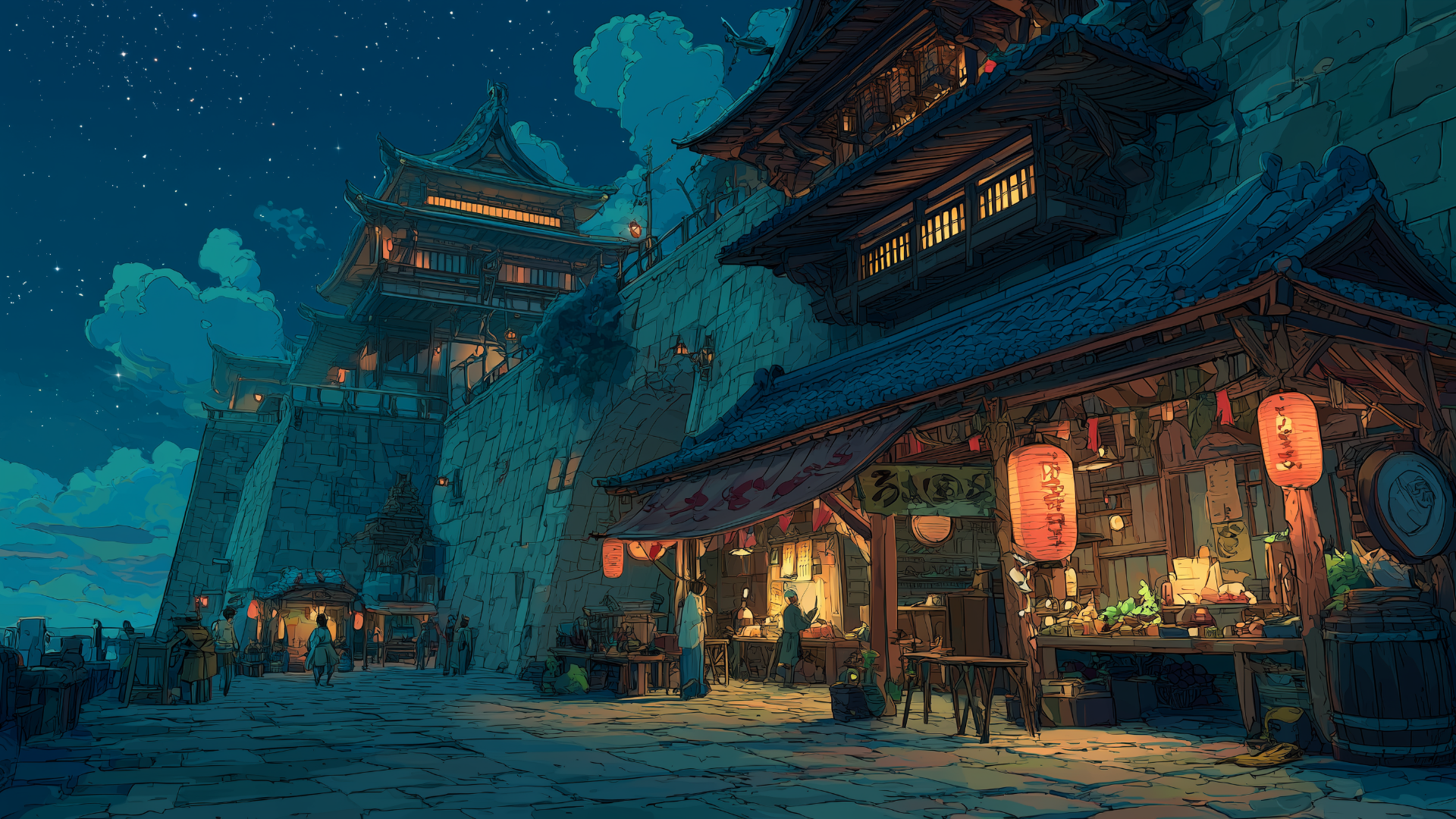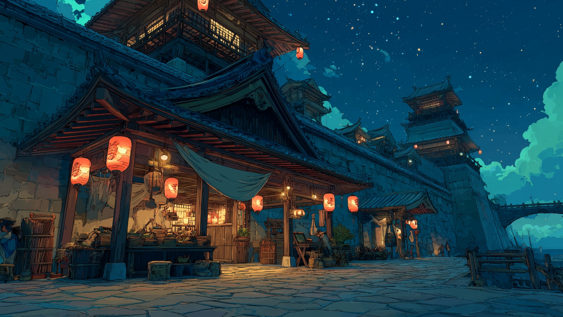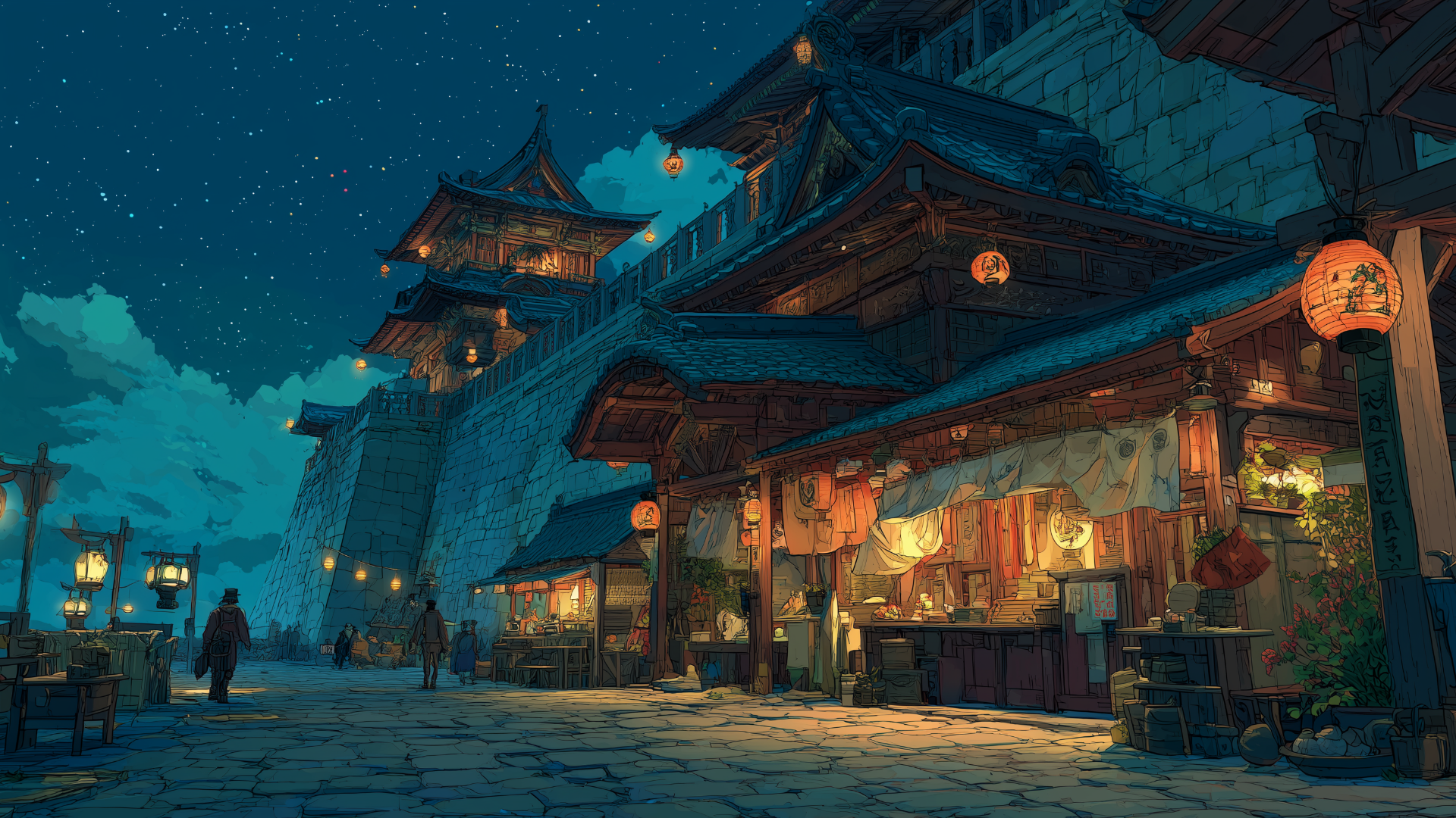 castle-town, night, marketplace, paper-lanterns, starry-sky