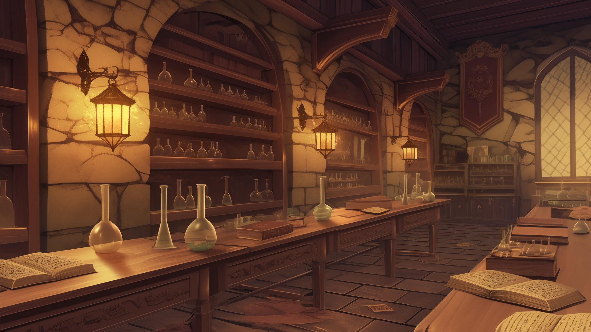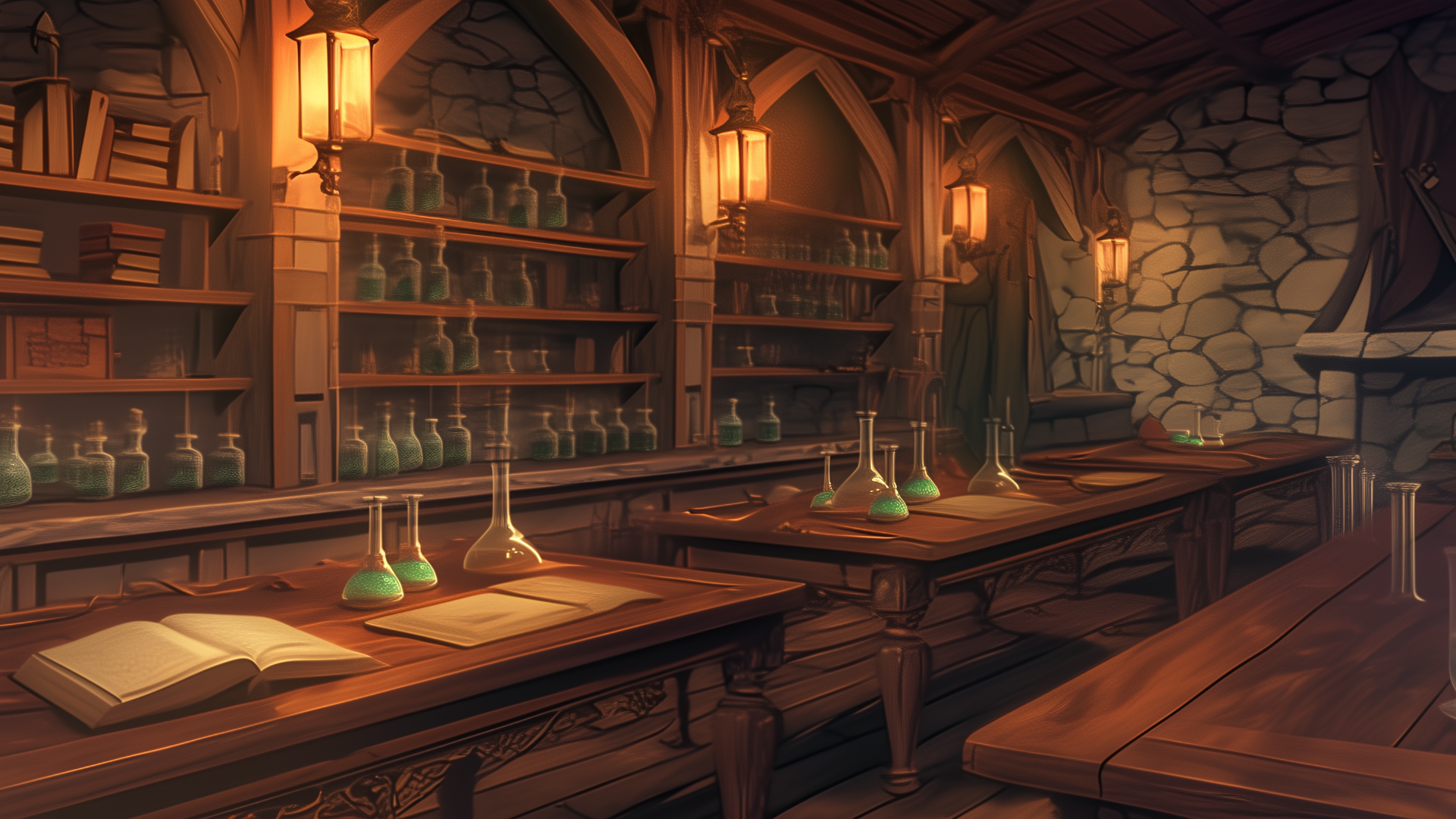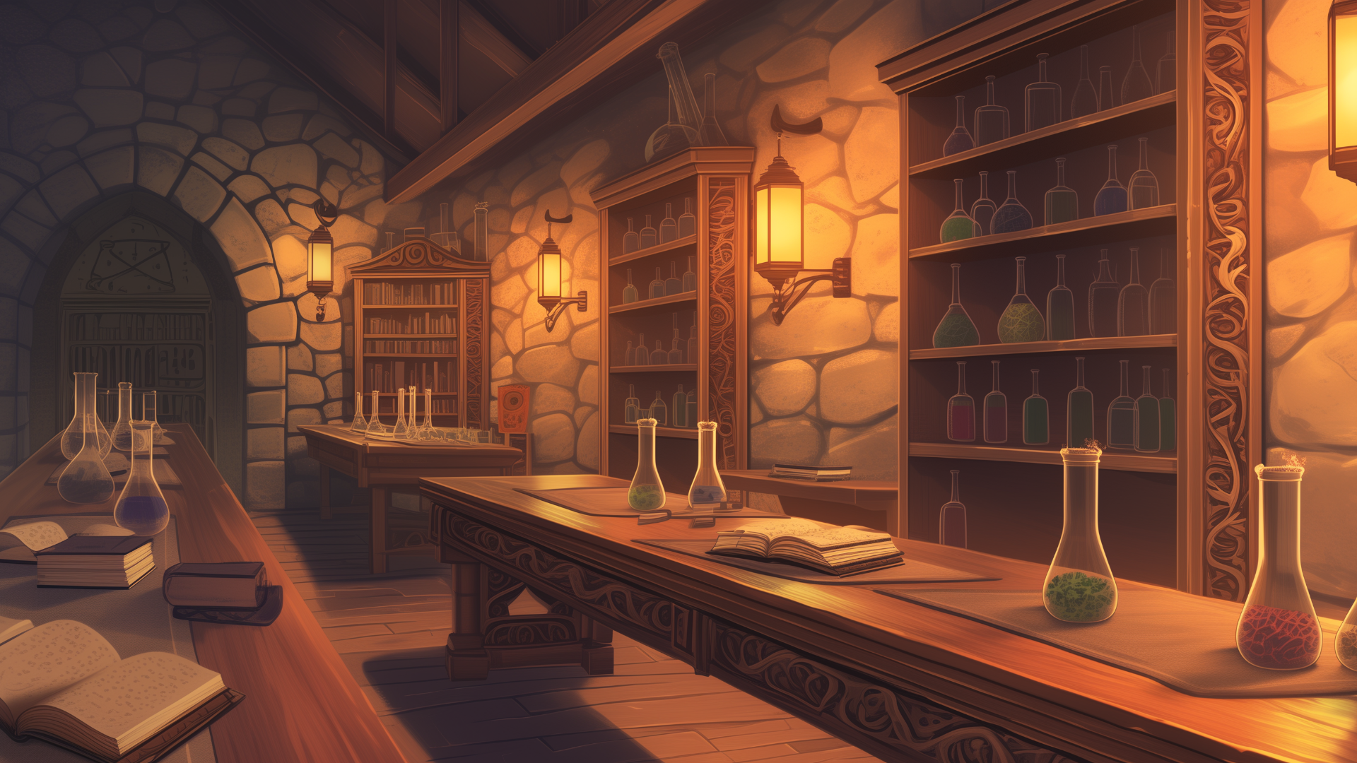 錬金術師の隠れ家を思わせる魔法実験室。暖色の照明が石壁を照らし、机には怪しげな薬品や開かれた魔導書が広げられている。ファンタジーTRPGや異能バトル系のシナリオに適した研究室の背景素材。