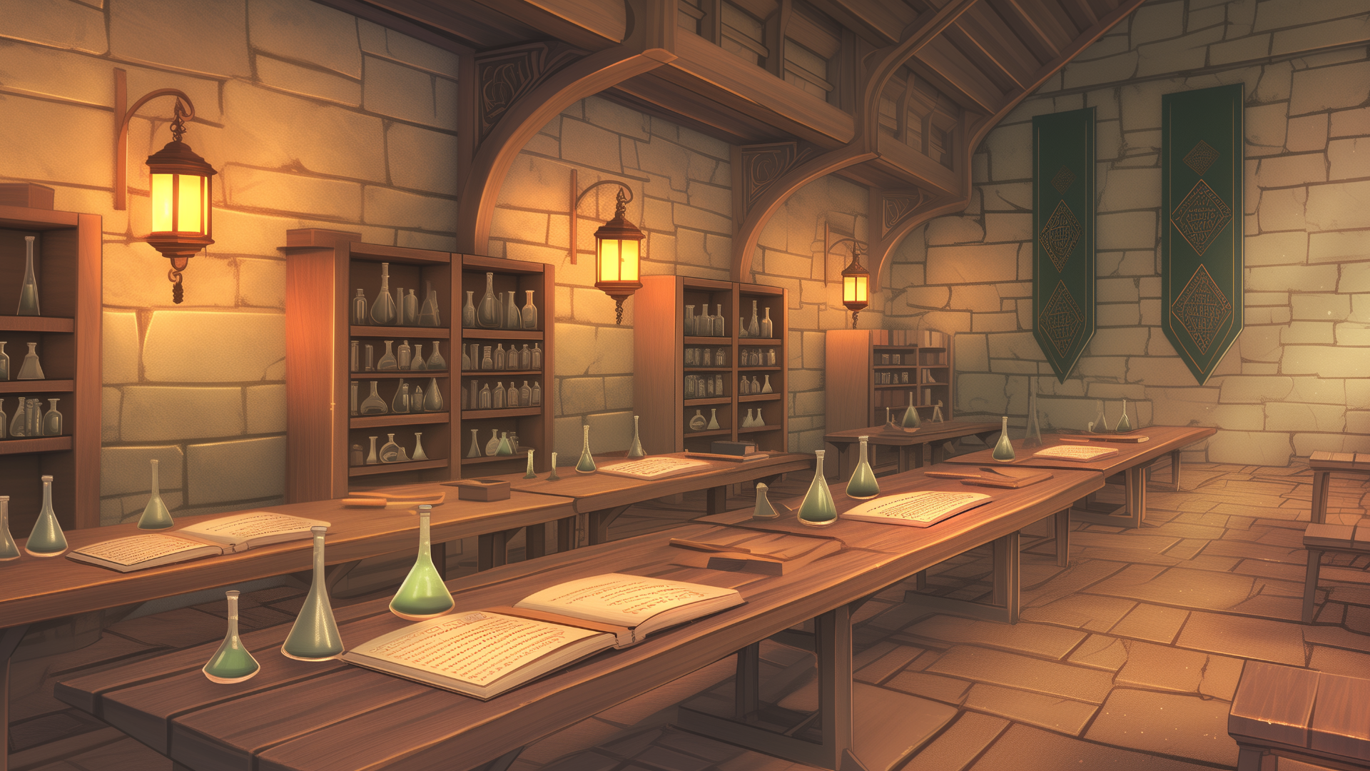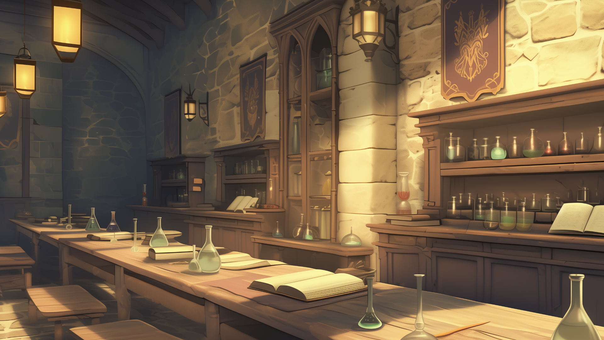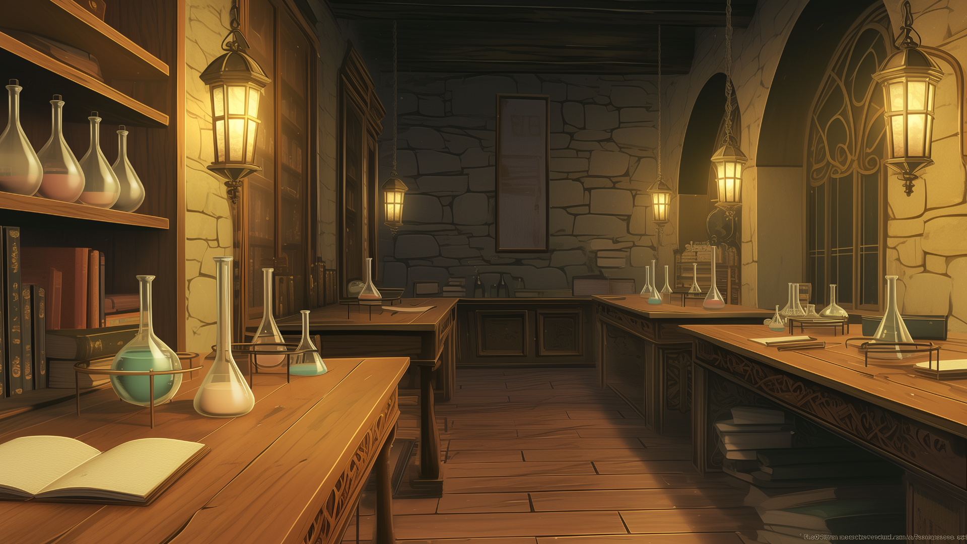 中世ヨーロッパ風の魔法学校にある錬金術の実験室。フラスコや試験管が机に置かれ、棚には魔導書が収納されている。錬金術師や魔法学者が登場するTRPGのシナリオ向け背景画像。