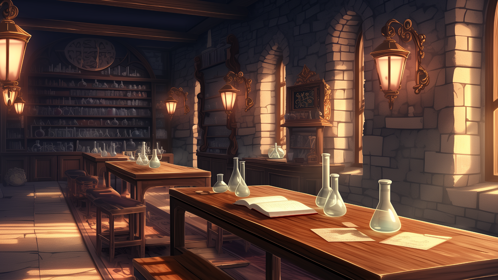魔法学園にある錬金術の研究室。長い木製の机にはガラスのフラスコやビーカーが並び、棚にはさまざまな薬品が収納されている。クトゥルフ神話TRPGや異世界ファンタジーのシナリオに適した実験室の背景素材。