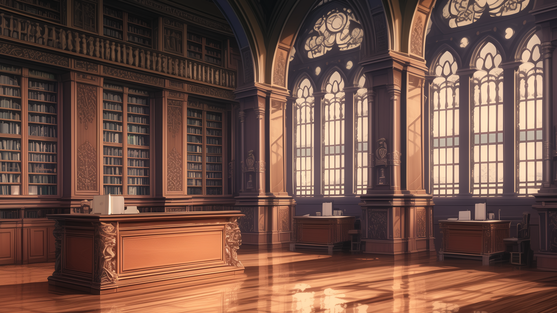 豪華な装飾が施された木製の家具が並ぶ、品格のある空間。 高いアーチ窓からはやわらかな光が差し込み、空間に静謐さを与えている。 知識と格式を感じさせるこの画像は、フリーの背景として多様な演出に活用できます。