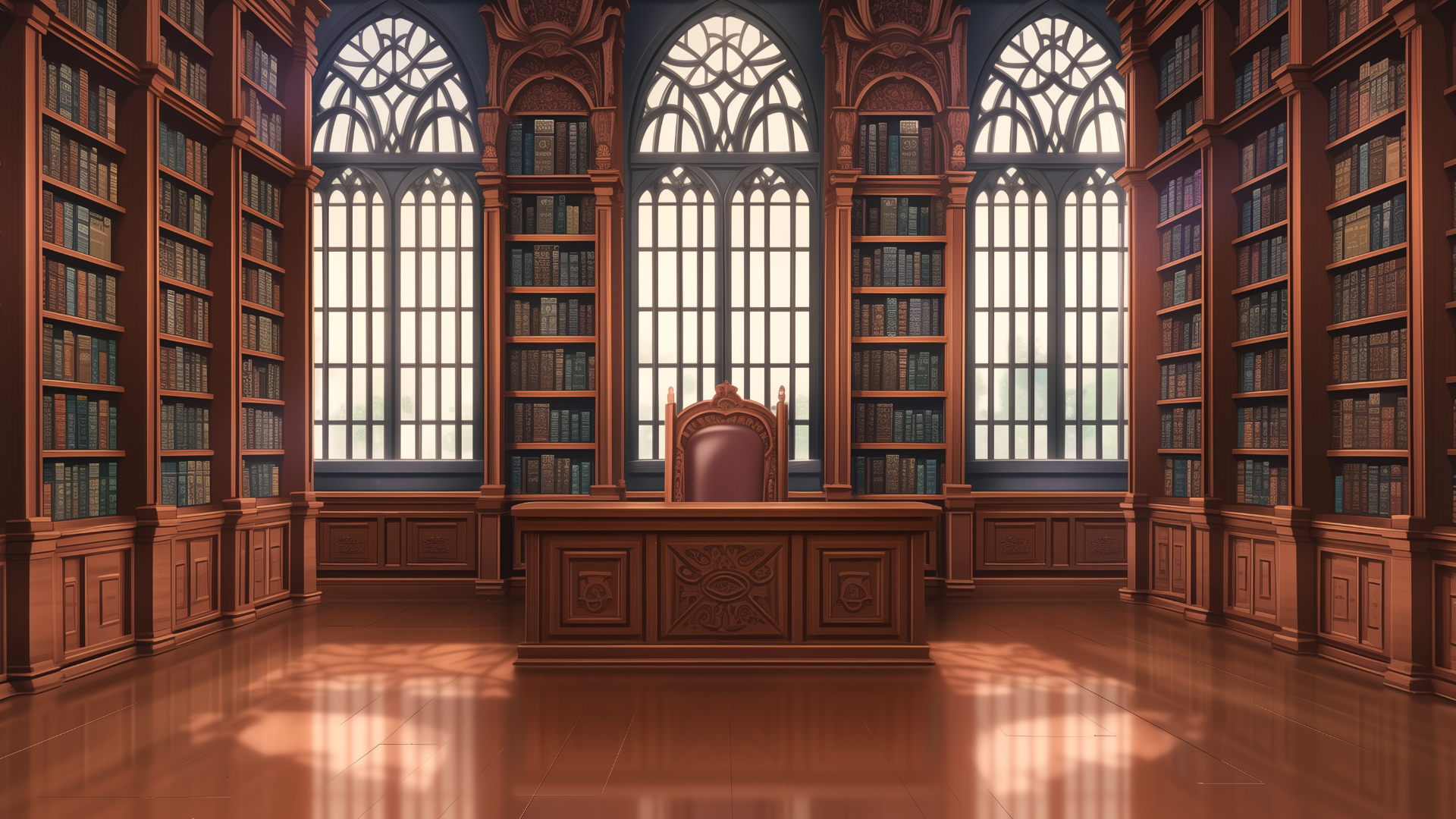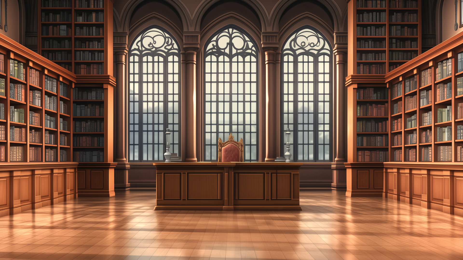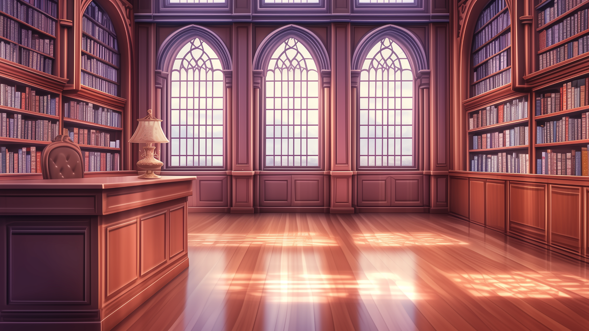 左右対称に整列した本棚と、中央に構える執務机が調和する空間。 高窓から入るやわらかな光が、荘厳な印象を与える。 魔法大学の講義室や評議会の会場として活用できる、洗練された背景イラスト。