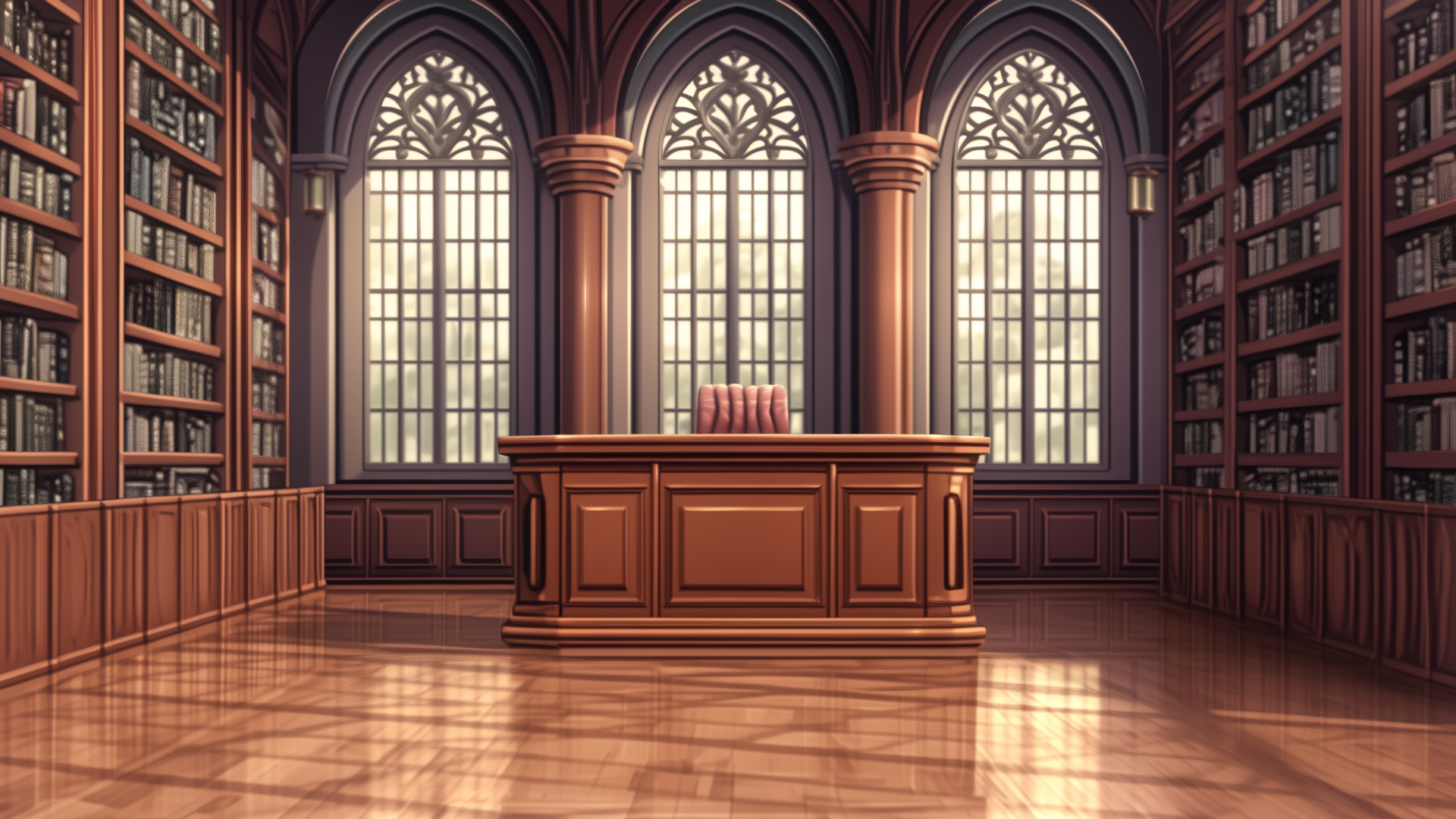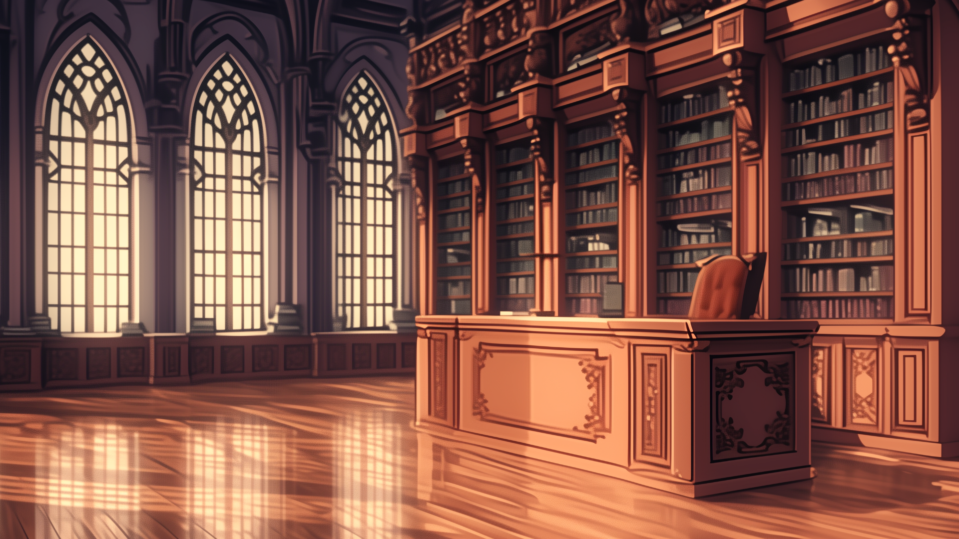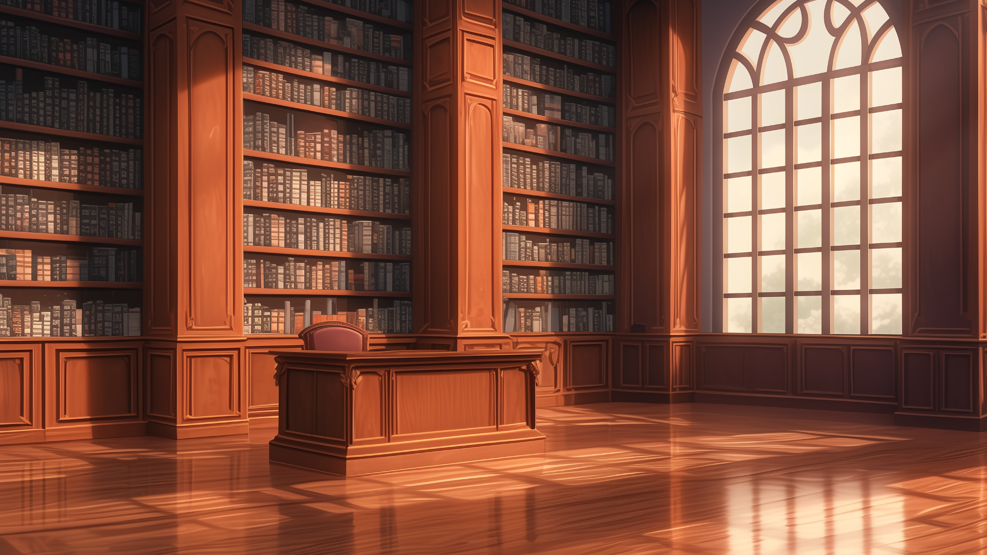 左右対称に整列した本棚と、中央に構える執務机が調和する空間。 高窓から入るやわらかな光が、荘厳な印象を与える。 魔法大学の講義室や評議会の会場として活用できる、洗練された背景イラスト。