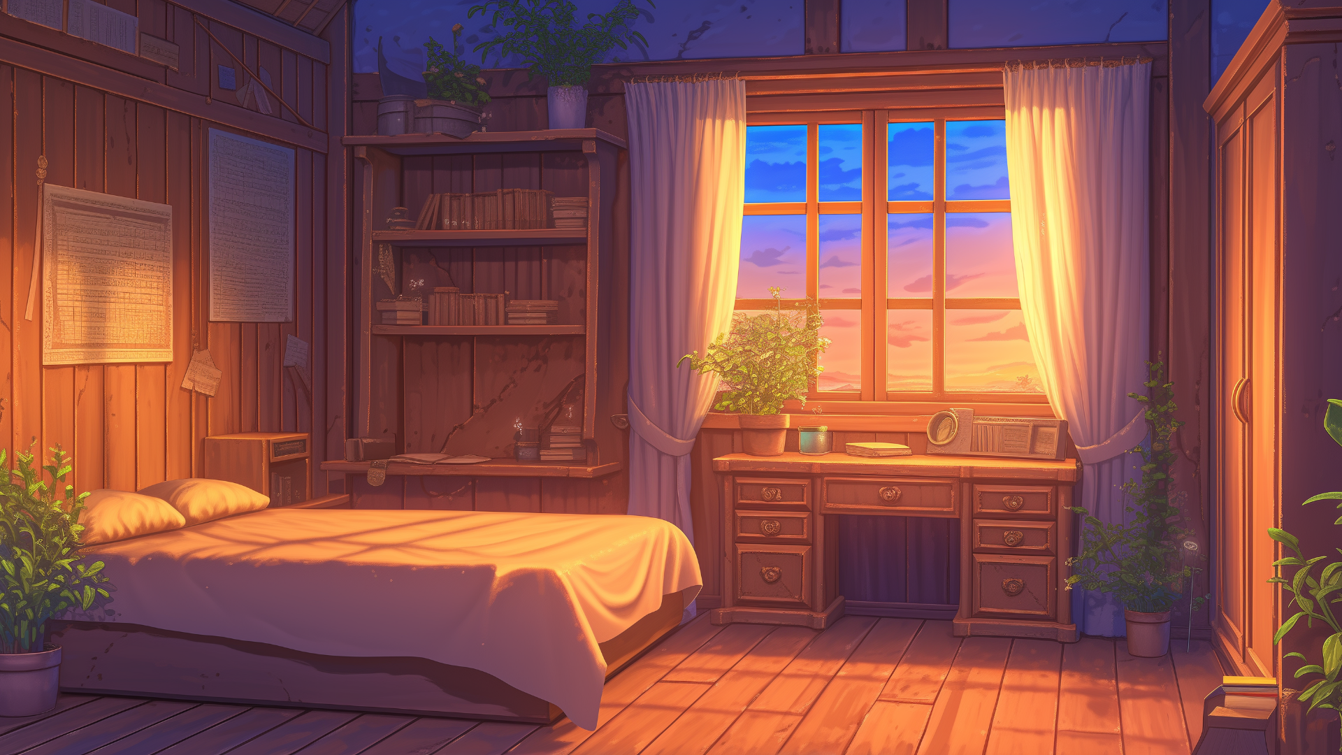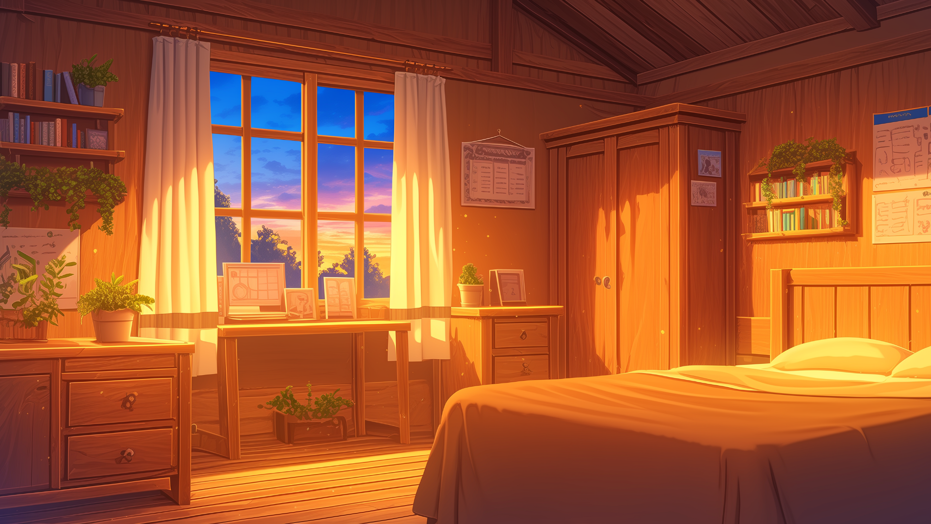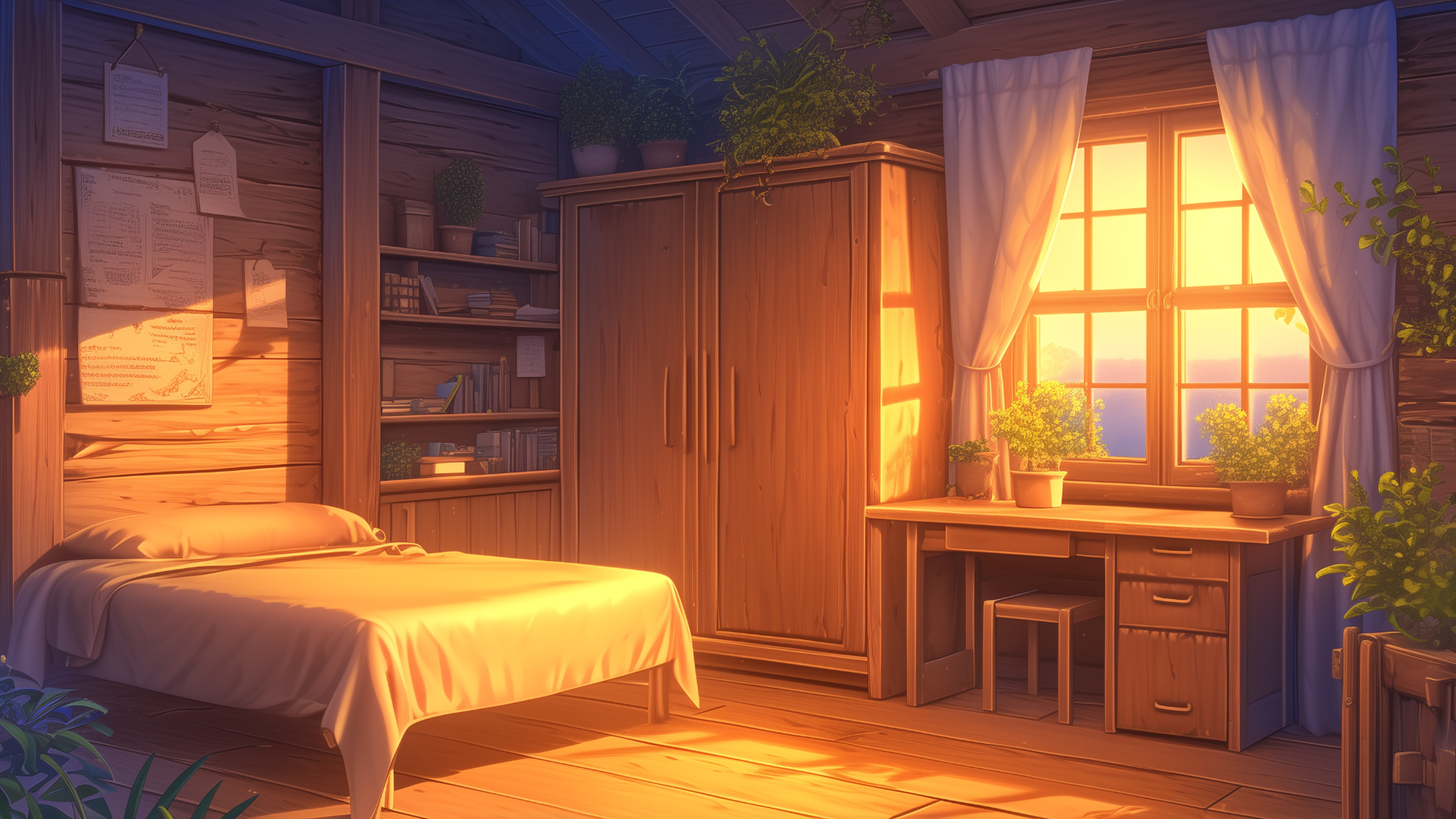 magic-school, dormitory, earth-element, wooden, single-room, bedroom, evening