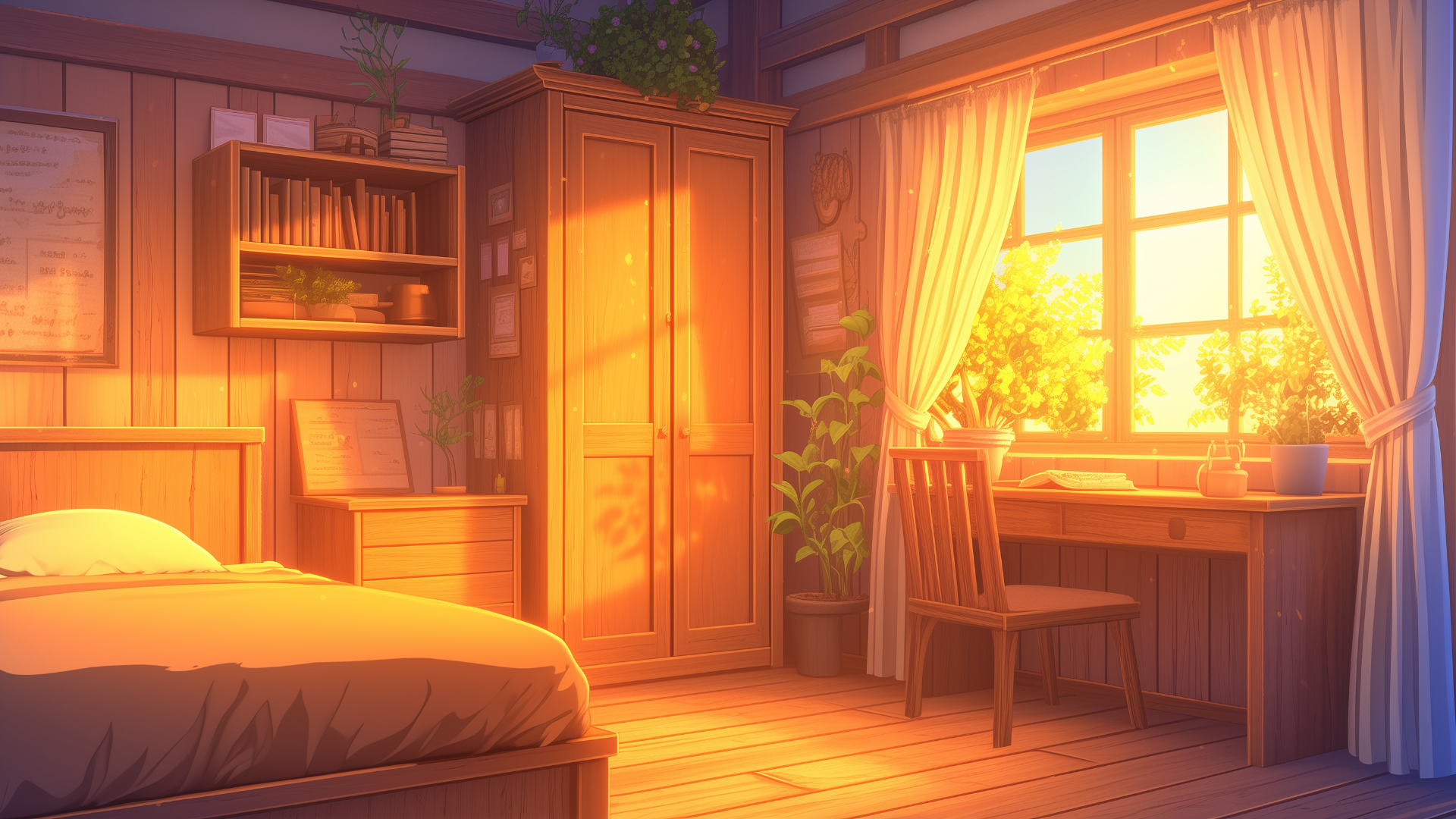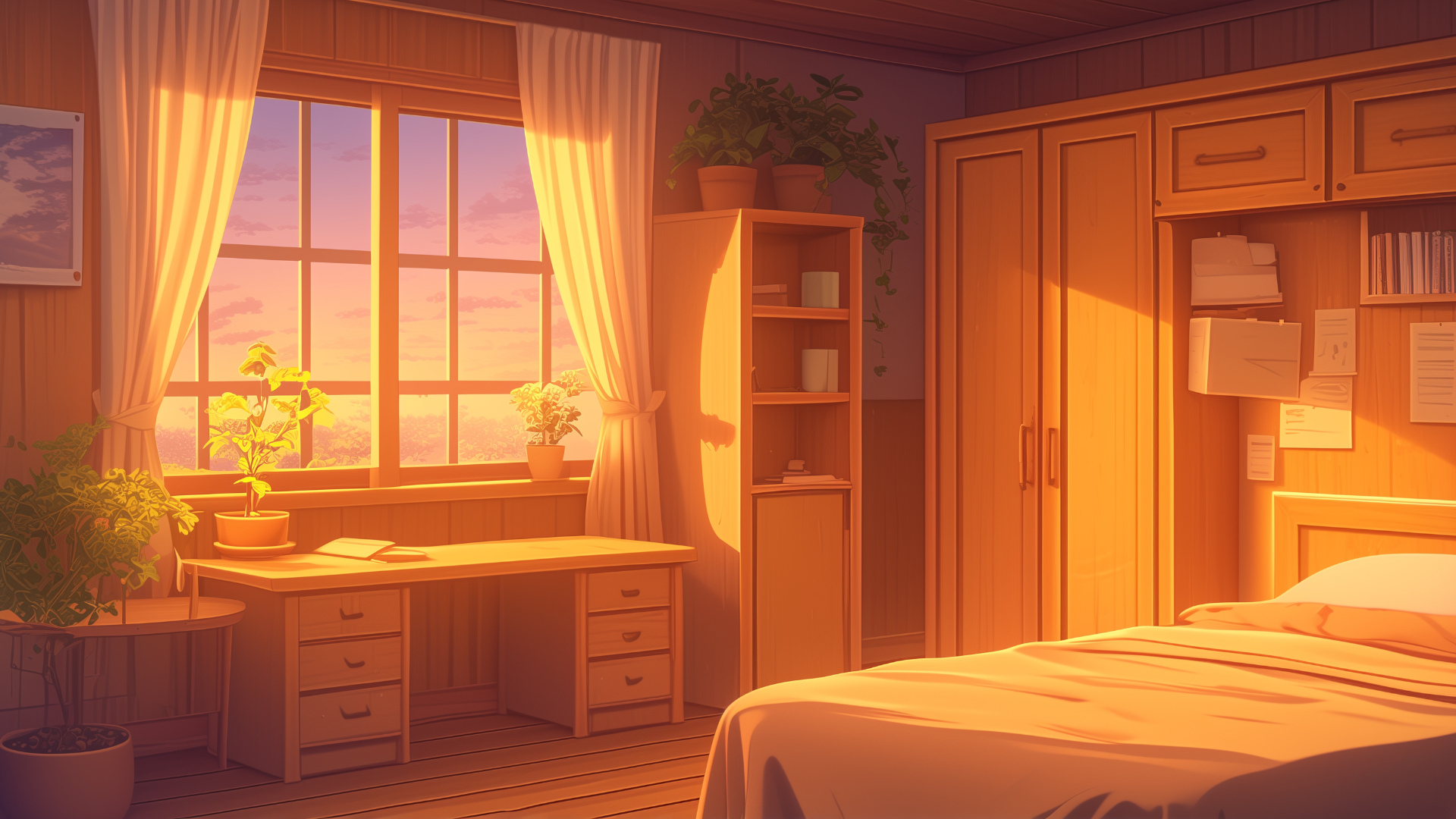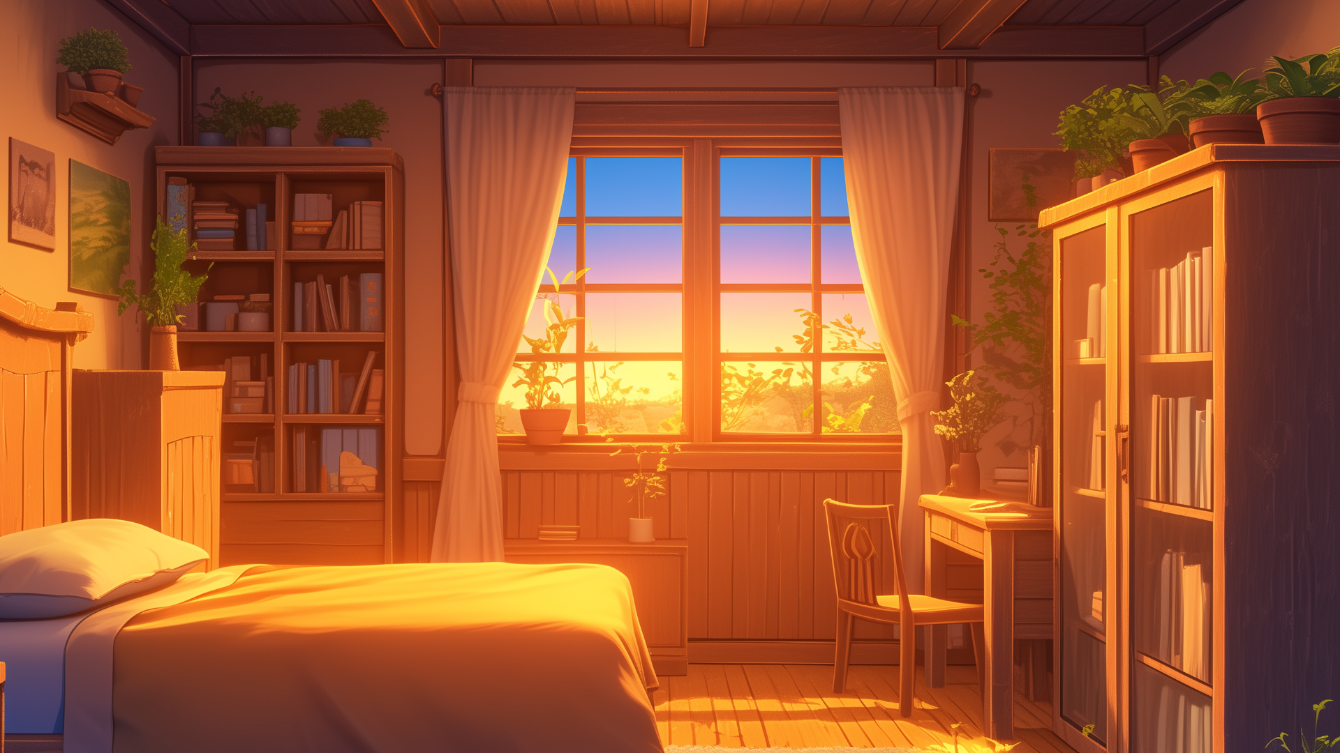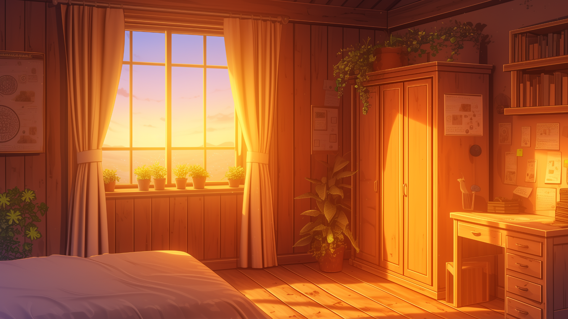magic-school, dormitory, earth-element, wooden, single-room, bedroom, evening